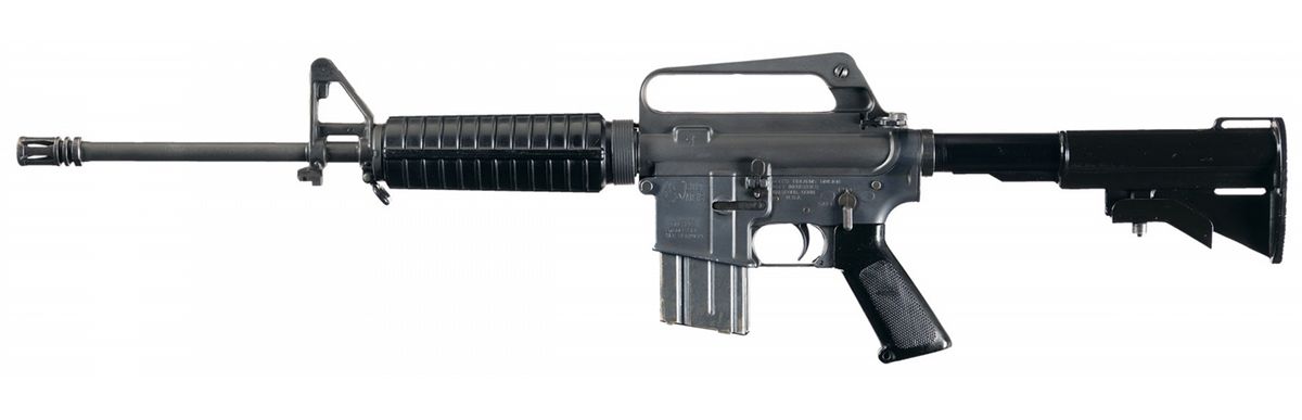 Produced in 1977. Adjustable post front sight and AR-15 pattern upper receiver with two position rear sight and no forward assist, with bird cage type flash hider on the carbine length barrel marked "C MP CHROME BORE". Front area of upper receiver is stamped with the Colt "C" and "VP" proofs. Equipped with a short ribbed handguard, checkered pistol grip and a telescoping aluminum stock. Comes with one Colt AR-15 marked 20-round magazine.