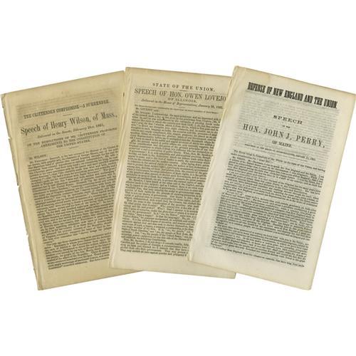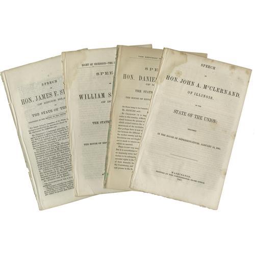 <B>Collection of Pre-Civil War 1861 Speeches in Congress</B></I> Each is 5.5" x 9", 8p to 16p in length. Speeches concern slavery, secession and the impending crisis. Comprises: Rep. John A. McClernand of Illinois (January 14, 1861, 16p), Rep. Daniel E. Sickles of New York (January 16, 1861, 16p), Rep. William S. Holman of Indiana (January 16, 1861, 15p), Sen. James F. Simmons of Rhode Island (January 16, 1861, 15p), Rep. John J. Perry of Maine (January 17, 1861; 8p), Rep. Owen Lovejoy of Illinois (January 23, 1861; 8p), Sen. Henry Wilson of Massachusetts (February 21, 1861, 16p). The pages of the Perry and Lovejoy speeches are loose, the rest are individually bound. Minor staining. Overall, in fine condition. Seven items.