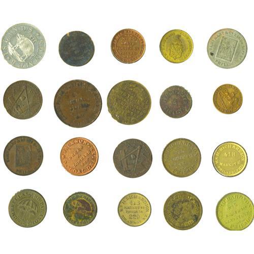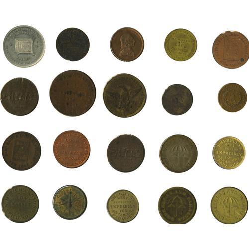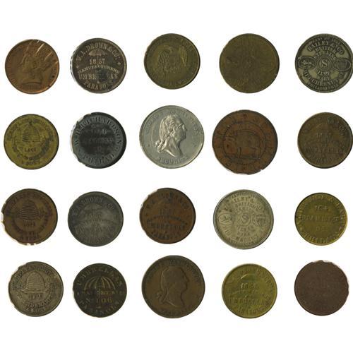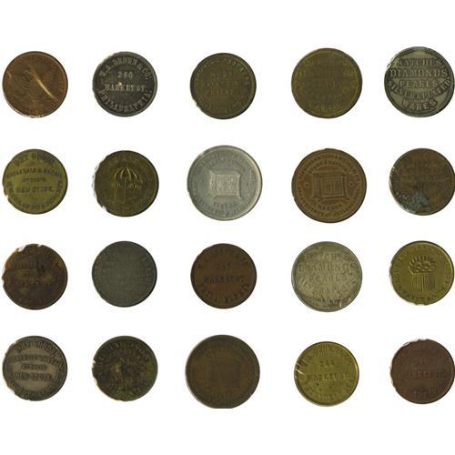 <B>Collection of Pre-Civil War Philadelphia Merchant Tokens, Nearly All Different.</B></I> Included are: Aldridge & Earp Fancy Goods (4, AU); Bailey & Co. (3, XF, AU); Browning Brothers Druggists (AU); W.A. Drown & Co. Umbrellas and Parasols (6, XF/AU); Evans & Watson (4, F-AU); Henry B. Fussell Manufacturer of Sunshades (G); James Harmstead, Bookseller (Red UNC); Samuel Hart & Co. Club House Cards (3, VF, XF holed, UNC); C.W. Jackson, Coal Dealer (Red UNC); William W. Long, Refectory and Museum (2, XF); Morgan and Orr (XF, spots); H. Mulligan, Jeweler (AU); Pennypacker & Sibley (Fine); Partridge & Richardson Dress Trimmings (XF); William H. Richardson Umbrellas and Parasols (10- 4 F/VF, 4 XF/AU, 2 UNC); M.A. Roots Daguerrian Gallery (2, XF); Sharpless Brothers Store (3, XF/AU); Sleeper & Fenner Umbrellas (UNC); Charles A. Smith Barber's Sundries (Fine, corroded); James R. Smith Dry Goods (F, holed); Smith, Murphy & Co. Dry Goods (3, XF); A.B. Taylor, Druggist (UNC); Col. Wood's Museum (XF); A.C. Yates & Co. Clothiers(2, F, XF). 48 pieces.
