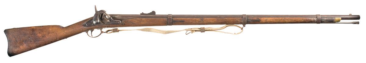Condition: Fine.The musket shows hard use. The barrel, barrel bands and rear sight have a dark brown patina with heavy flash pitting opposite the lock plate. The bolster is heavily pitted and the clean-out screw is battered. The lock plate has light to moderate pitting with clear markings. The buttplate and trigger guard have a dark patina with scattered pitting. The stock is in fair-poor condition with heavy wear. There is a is a large chip missing between the forward edge of the lock-plate and the barrel and there is a crack with old staple repair that runs from in front of the lock to the trigger guard. The edges of the stock flats and barrel channel show extensive wear. The sling shows service wear but is in good overall condition. This musket shows hard service use; the canvas sling, carved stock and Enfield ramrod could indicate Confederate service.