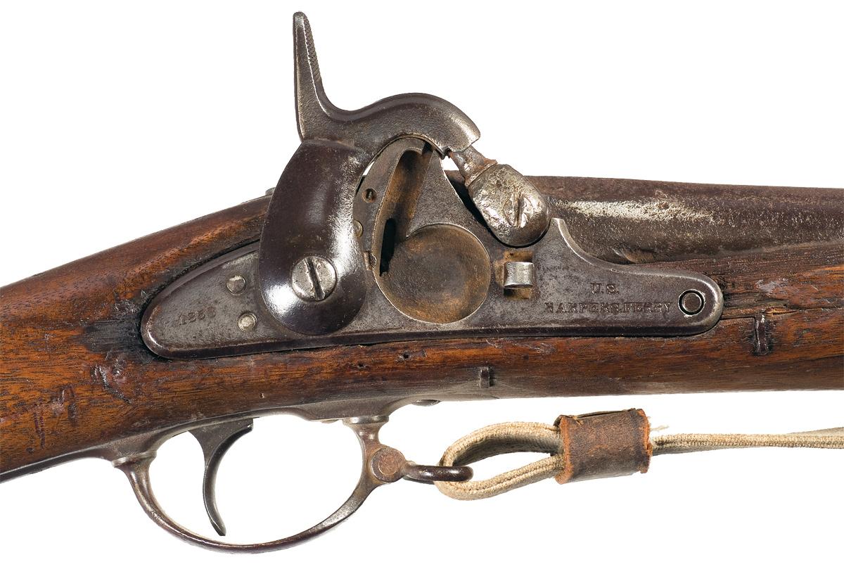 Model 1855 Percussion Rifle-Musket manufactured at the U.S. Armory at Harpers Ferry, Virginia, in 1858. The musket has the distinctive Maynard tape primer lock, long range rear sight and brass forearm tip. The lock plate is dated "1858" behind the hammer and marked: "U.S./HARPERS FERRY' in two lines ahead of it. The buttplate heel is stamped "U.S.". The left barrel flat is stamped with "V/P/Eagle Head" proof and inspection marks. The roman numeral "XI" and a five-pointed star are carved in the right side of the stock. The left side of the stock is crudely carved with the name: "JAMES/GARROIT". The musket is fitted with an Enfield pattern steel ramrod with slotted tip and a Confederate style canvas and leather sling. The Maynard tape primer magazine door and tape primer mechanism have been removed. The rear sight blade is missing. Harpers Ferry Armory manufactured 12,158 Model 1855 Rifle-Muskets between 1857 and 1861. The Model 1855 Percussion Rifle-Musket was the most advanced rifle musket available at the outbreak of the Civil War and it was used by the both Federal and Confederate armies throughout the war.