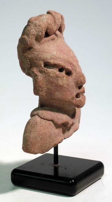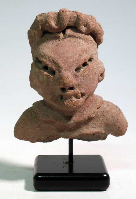 An exceptional Pre-Classic figure found near Mitla in Oaxaca, Mexico, c. 400 - 100 BC, a well-preserved example depicting an elite individual with prominent teeth, filed to represent fangs. He is adorned with a fancy headdress, broad collar and ear ornaments. Find site inscribed on back. H: 3 1/2 in. Mounted on stand.