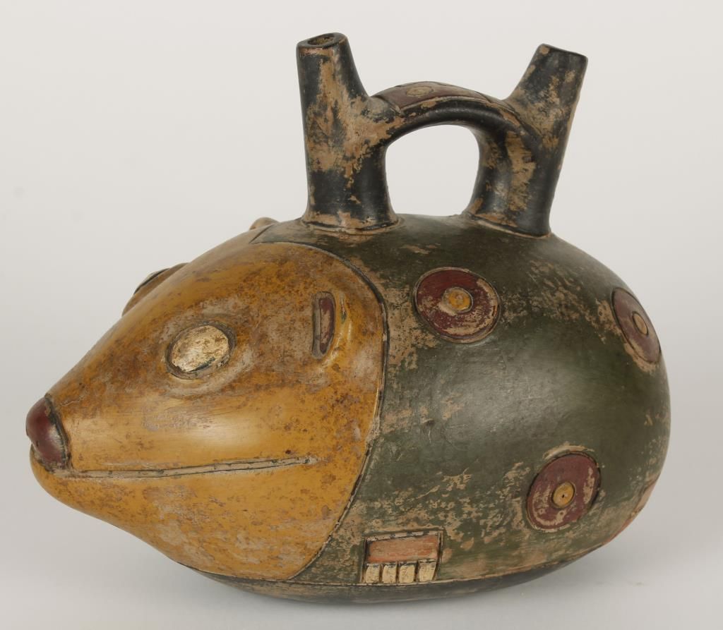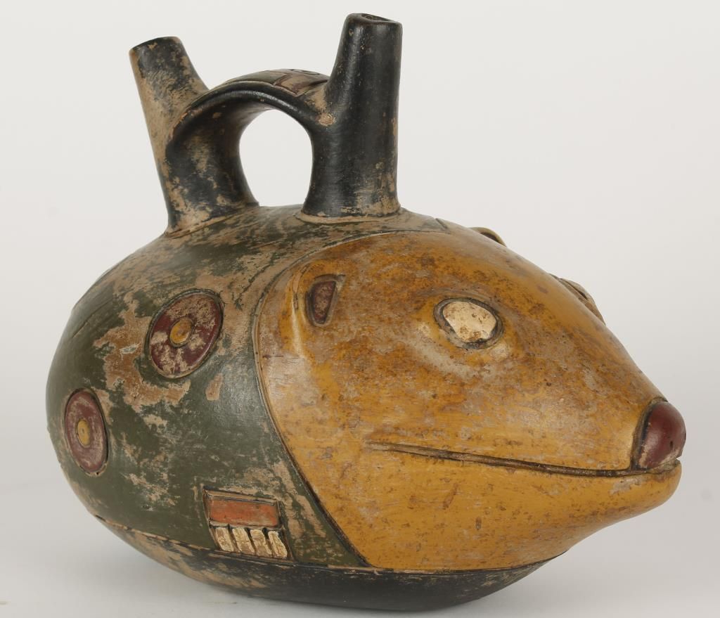 With animal effigy design. Shows age, and fading to paint. 5" wide x 8" long x 6" high.