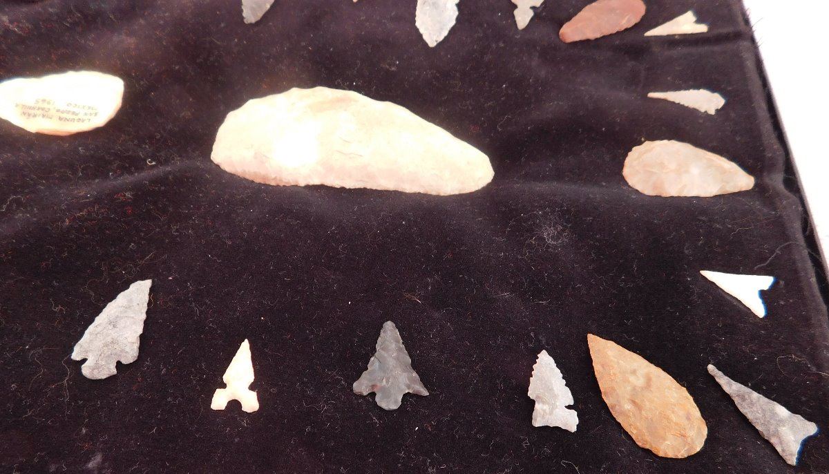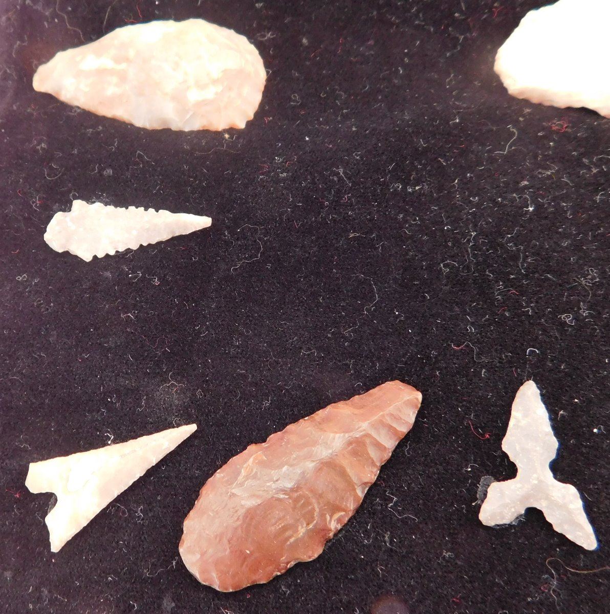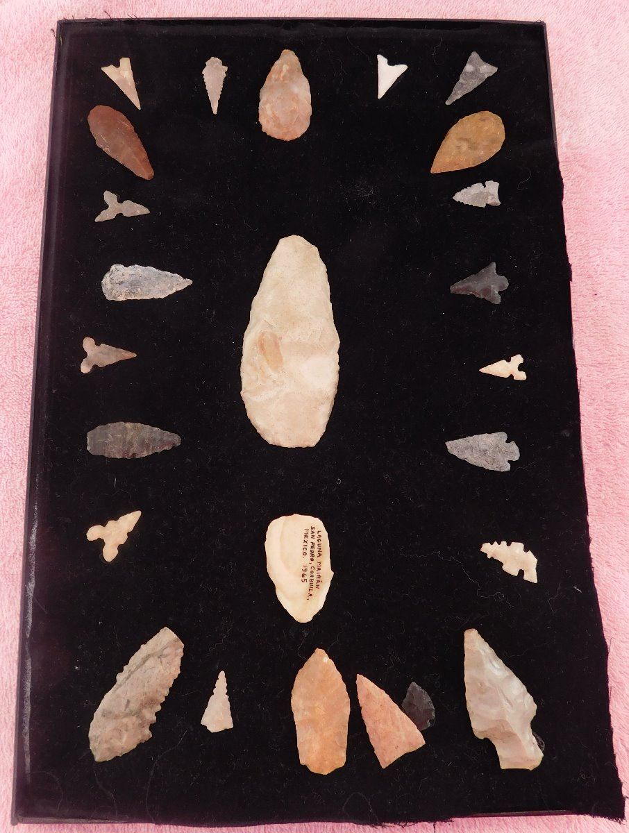 Pre-Columbian Artifacts, circa 2000 years old. Made of chert and flint, the items are 0.5" to 3.5" long. Pre-Columbian, Mexico. See data on one scraper. Frame not included. Condition: As found, see images. Shipping: $20.00 w/insurance and signature.