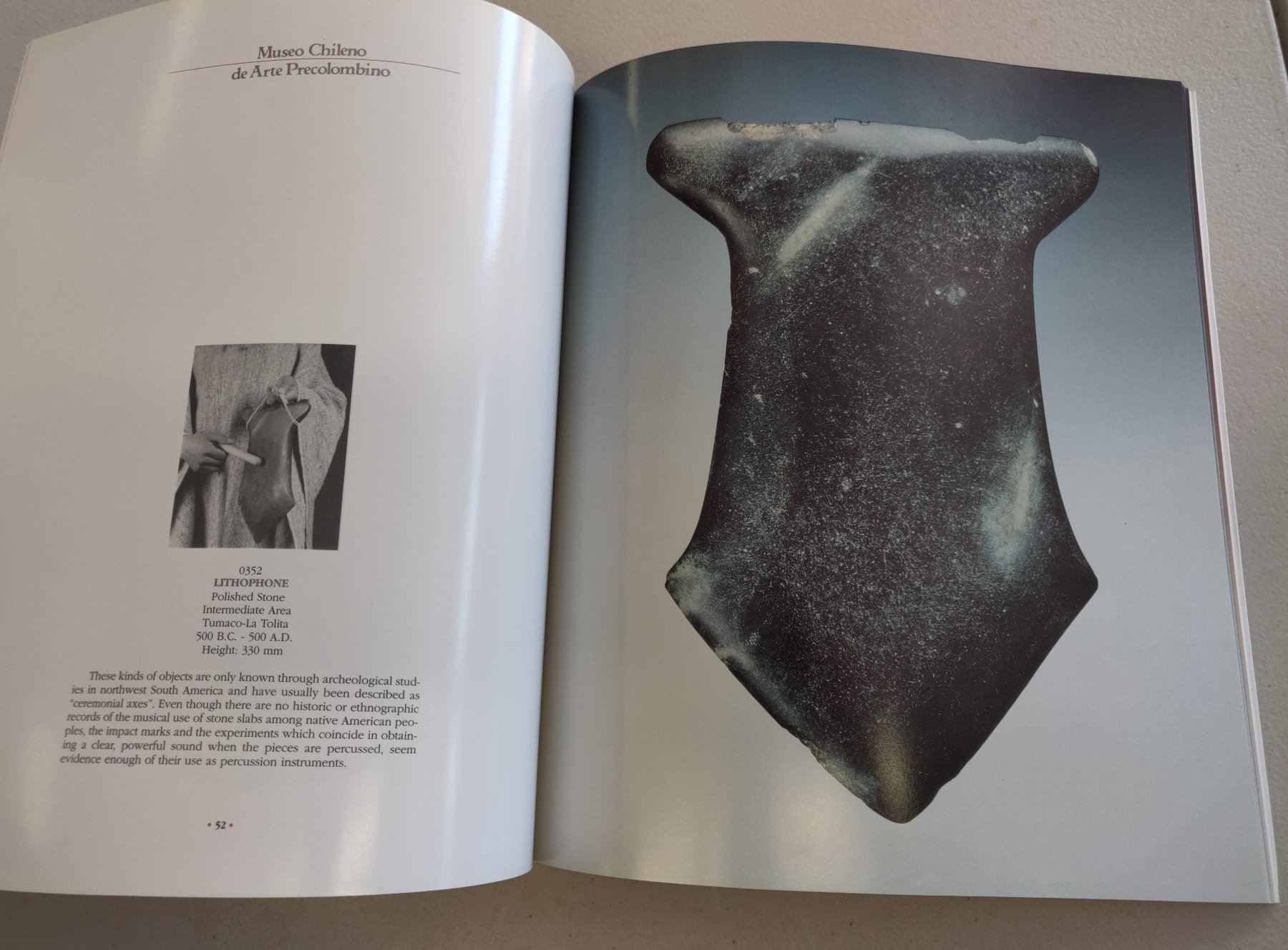 Pre-Columbian Book, modern item. Made of paper, the item measures 10" x 12". South American. On pre-Columbian musical instruments. Condition: Some wear from use, see images. Shipping: $14.50 w/insurance and signature.