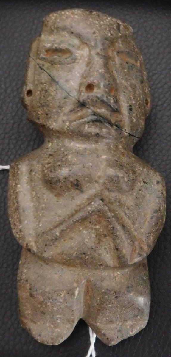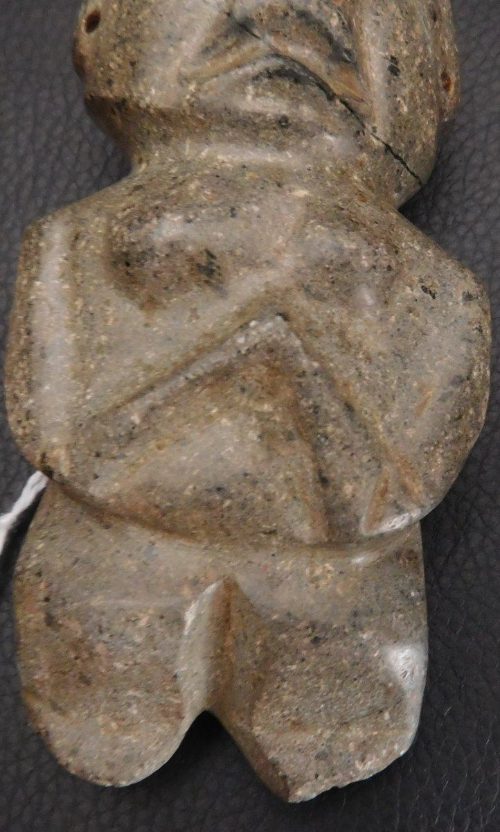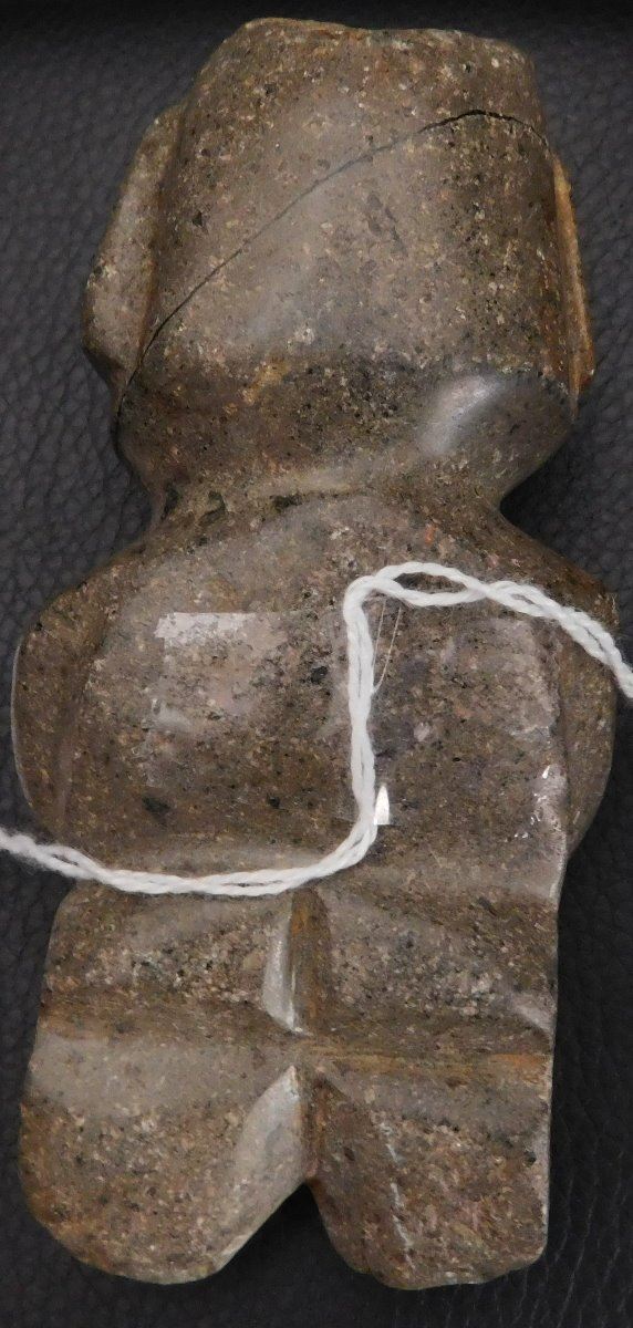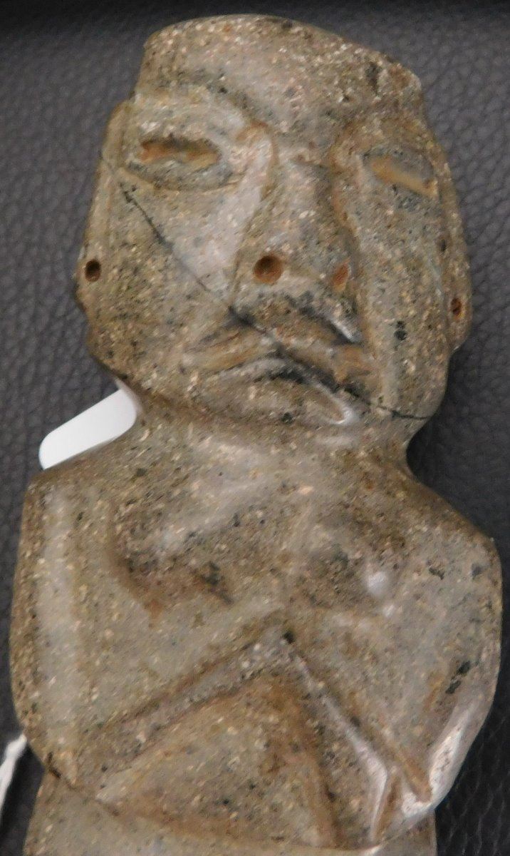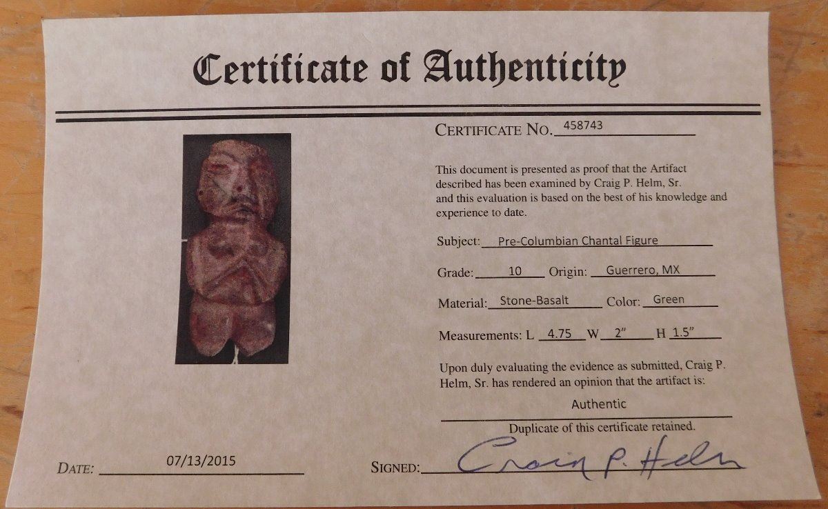 Pre-Columbian Chantal Figure w/Helm COA, circa 2000 years old. Made of basalt, the item is 4.75" x 2" x 1.5". Guerrero, MX. May have been used as an axe. Ships w/Helm Certificate of Authenticity. From an old, 1960s California collection. Condition: good, some wear and polish, see images. Shipping: $22.50 w/insurance and signature, due to value.