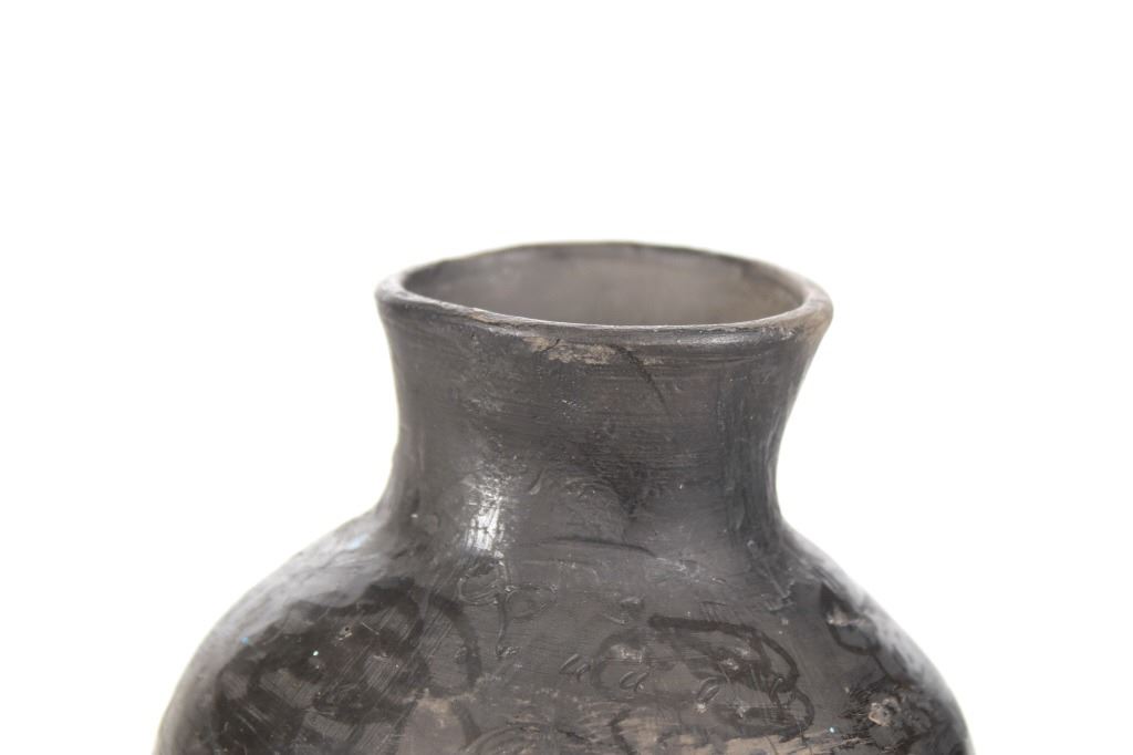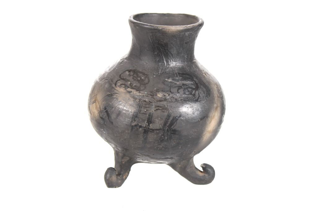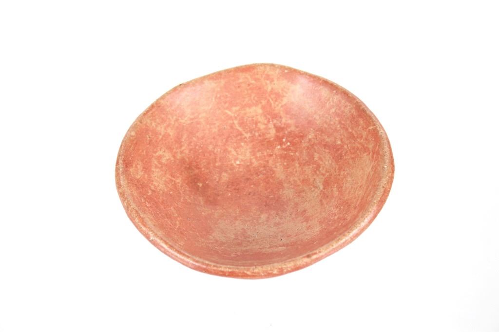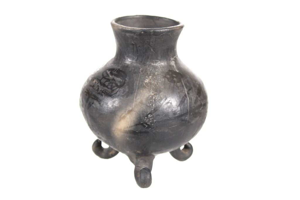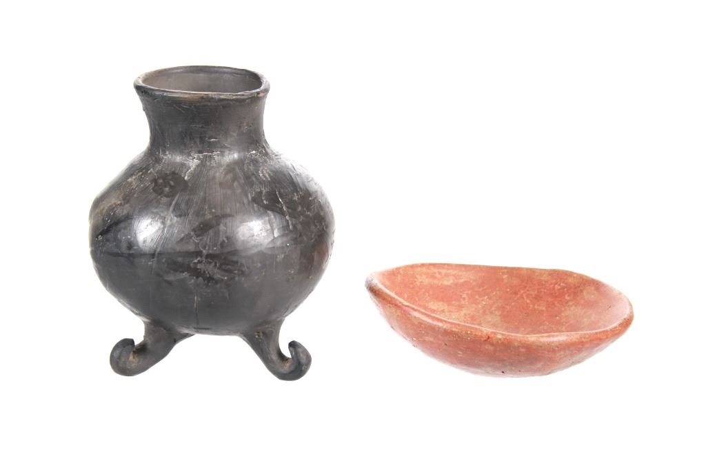 Included in this lot are Two (2) Pre-Columbian Chimu (Chimor) Culture Pottery Bowls, circa 900-1470 AD. The largest bowl is Chimu black-ware, best known and most common in Peruvian pre-Columbian tradition. The black color was achieved by firing the ceramic under conditions of limiting oxygen, thereby generating soot that bound to the vessel surface. The pottery was burnished after firing to produce the shiny black surface. The smaller bowl is red-ware. The Chimú people are best known for their distinctive monochromatic pottery. Decorative designs have faded inside smaller bowl, floral and geometric designs are still visible on larger 3-footed black-ware. Minimal scuffing / chipping observed on either piece. Black-ware measures 5.5"H x 4.25" diameter, red-ware is 5" diameter x 1.5"H; total weight is 1lb, 2oz.