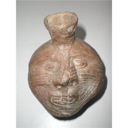 Authentic Pre-Columbian Portrait Vessel from the Northern Coast of Peru dating from Late Intemediate Period (1100-1400 AD). This artifact shows the head of an old man with feline like facial charecterstics. Crooked nose and mouth from casting mold- Molds were used comonly in ancient Peru to assemble numerous similair pieces. Excellent condition no repairs, chips or breaks. Released from Doctor's Private Collection who has sold numerous items through New York City Galleries as weel the the top auction houses. Guaranteed Authentic.