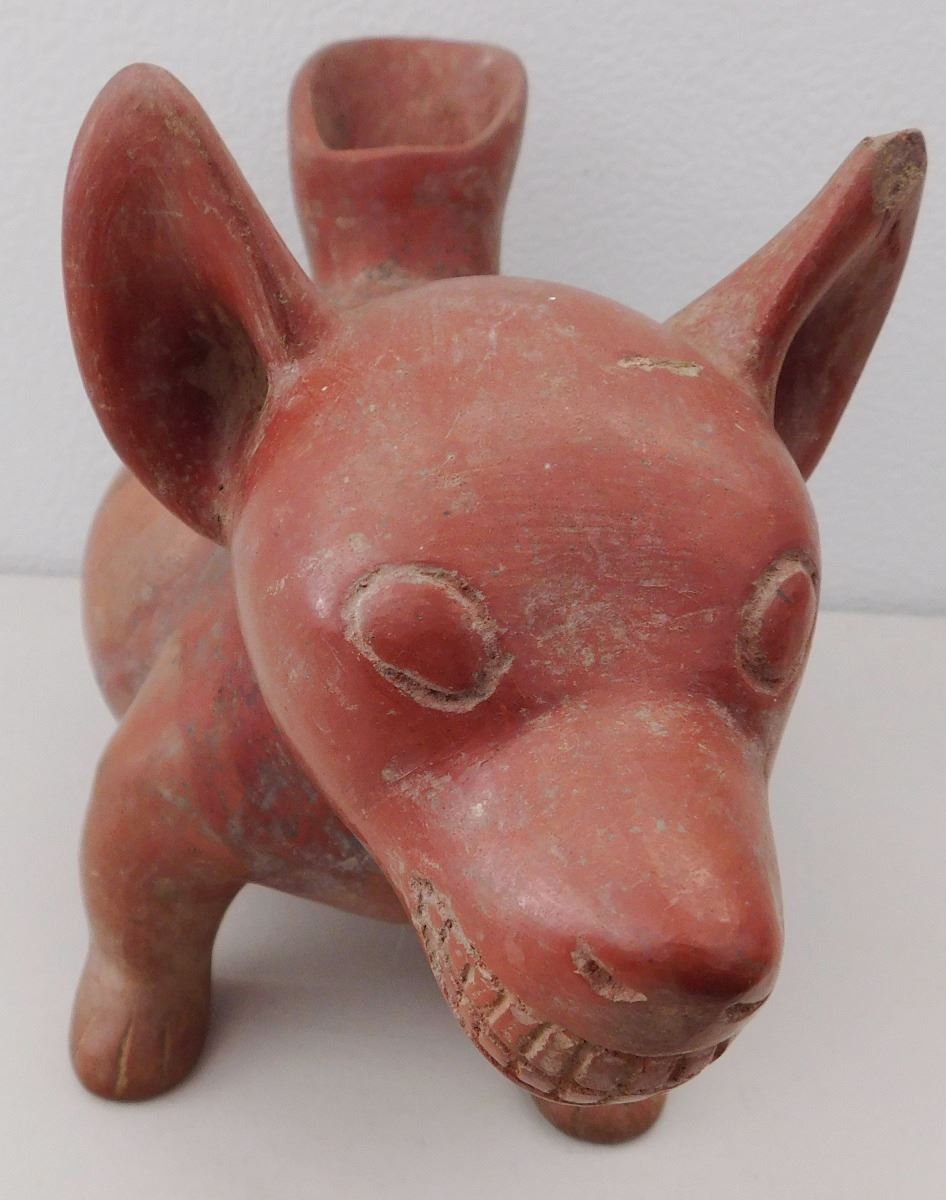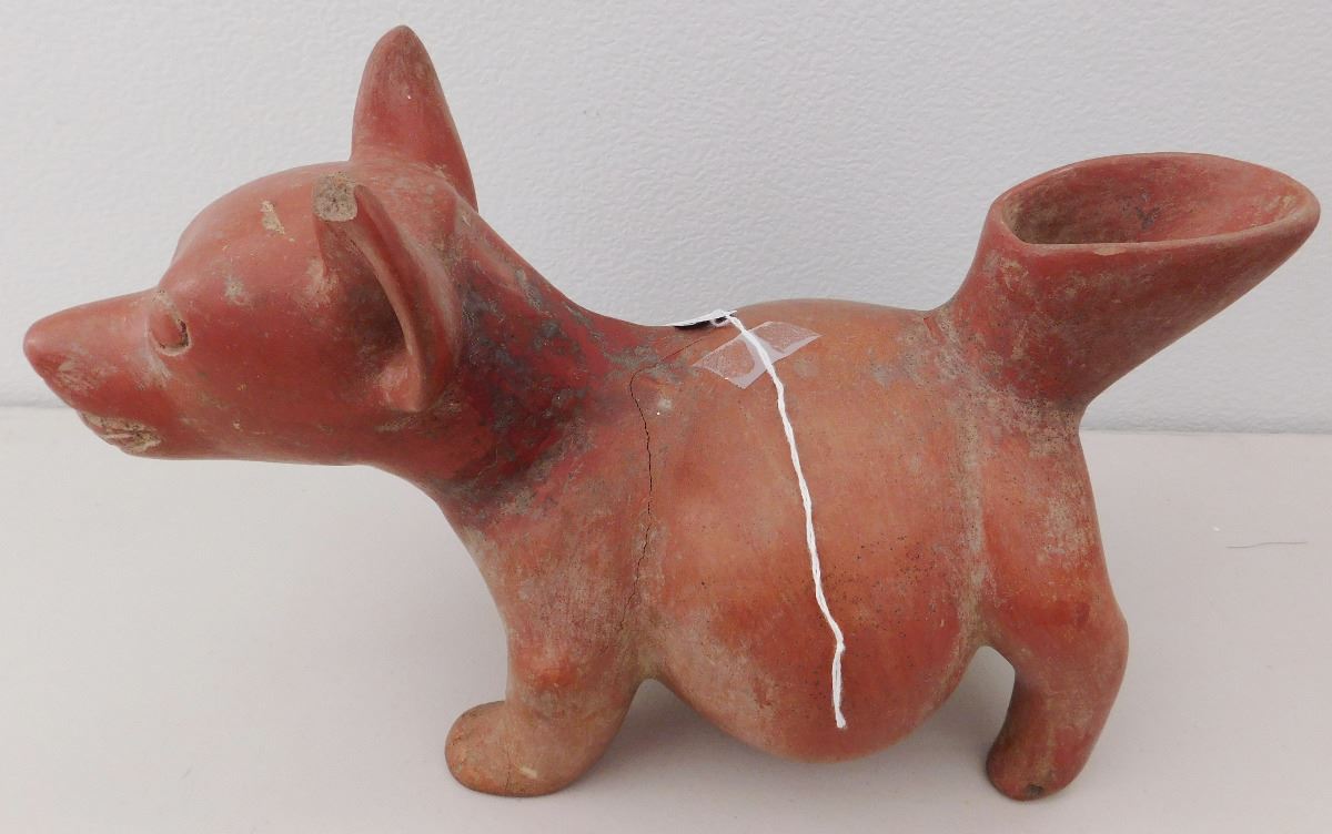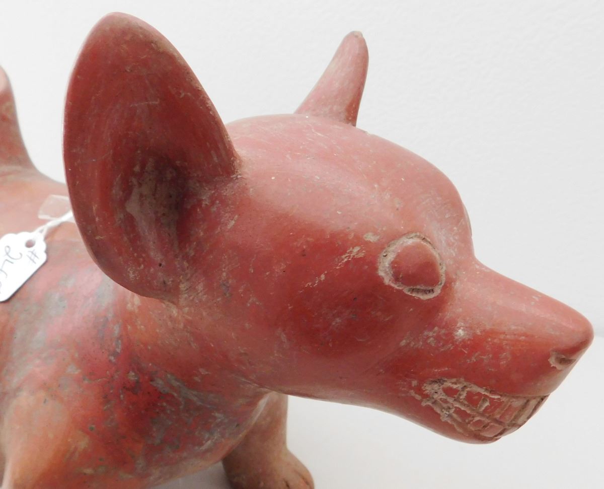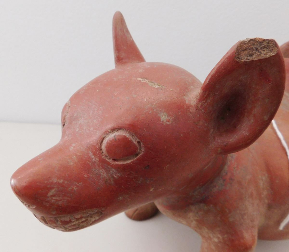 Pre-Columbian Colima Dog, circa 1500 years old. Made of clay and paint, this item measures 13" x 10" x 8". From Colima, Mexico. Hairless dog was believed to be a sacred pet. Condition: Minor restoration, minor nick on ear and scratch on forehead, see images. Shipping: $50.00, requires double box and insurance.
