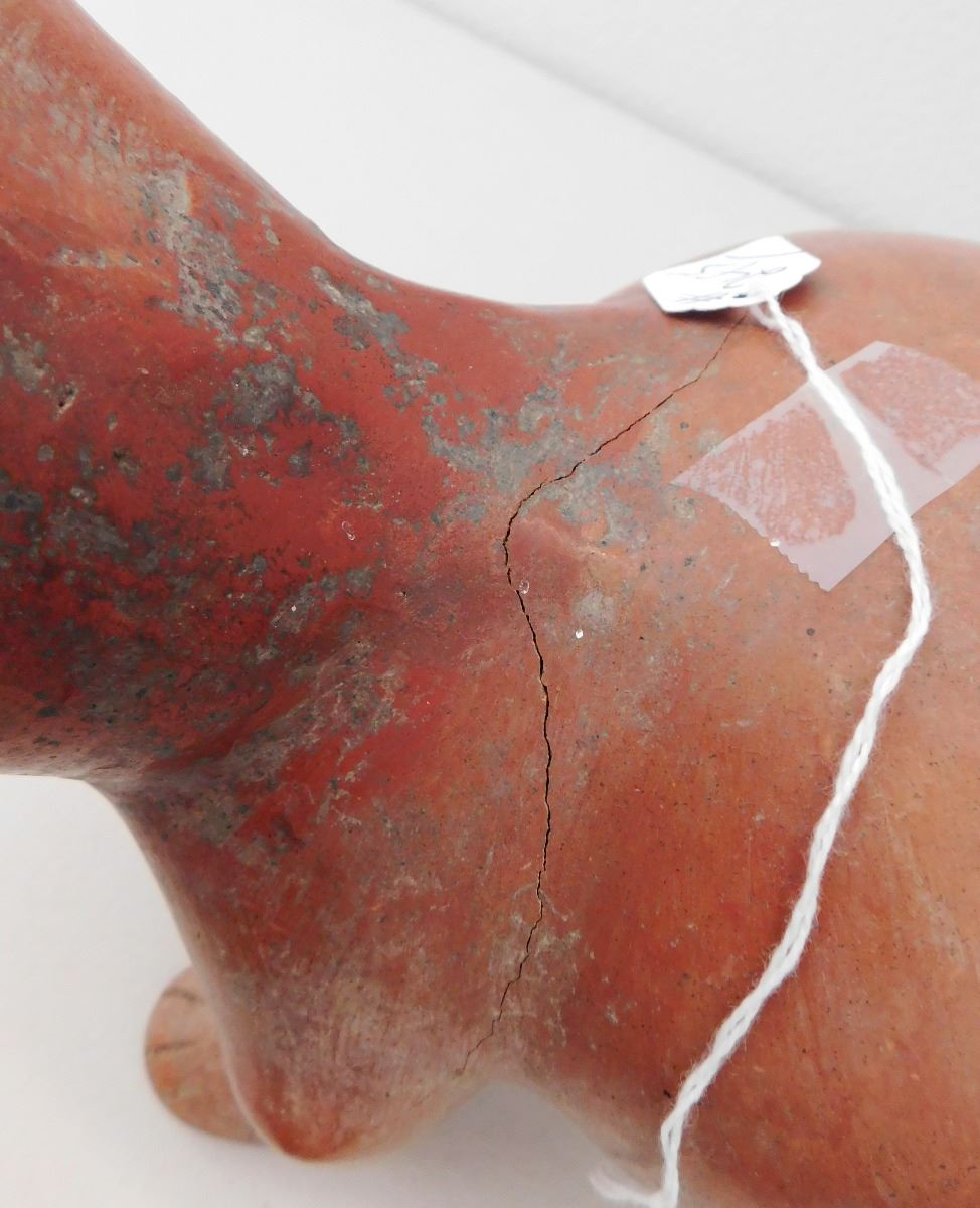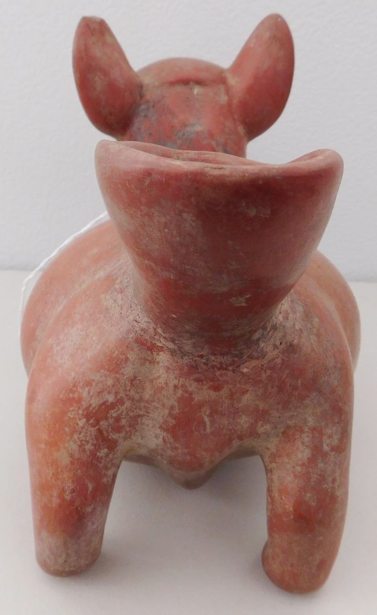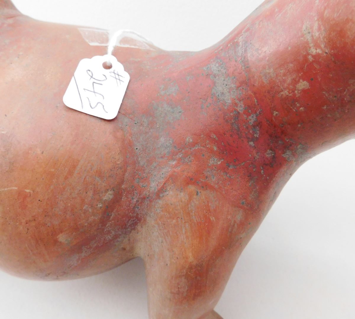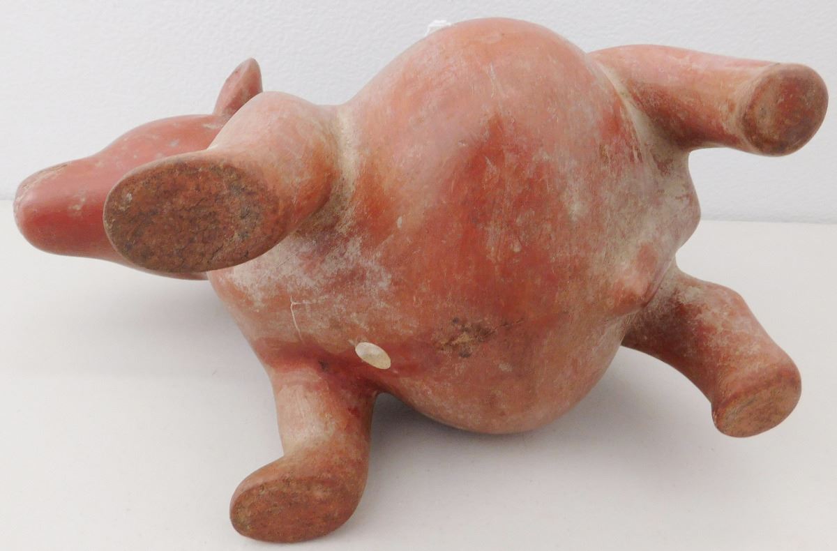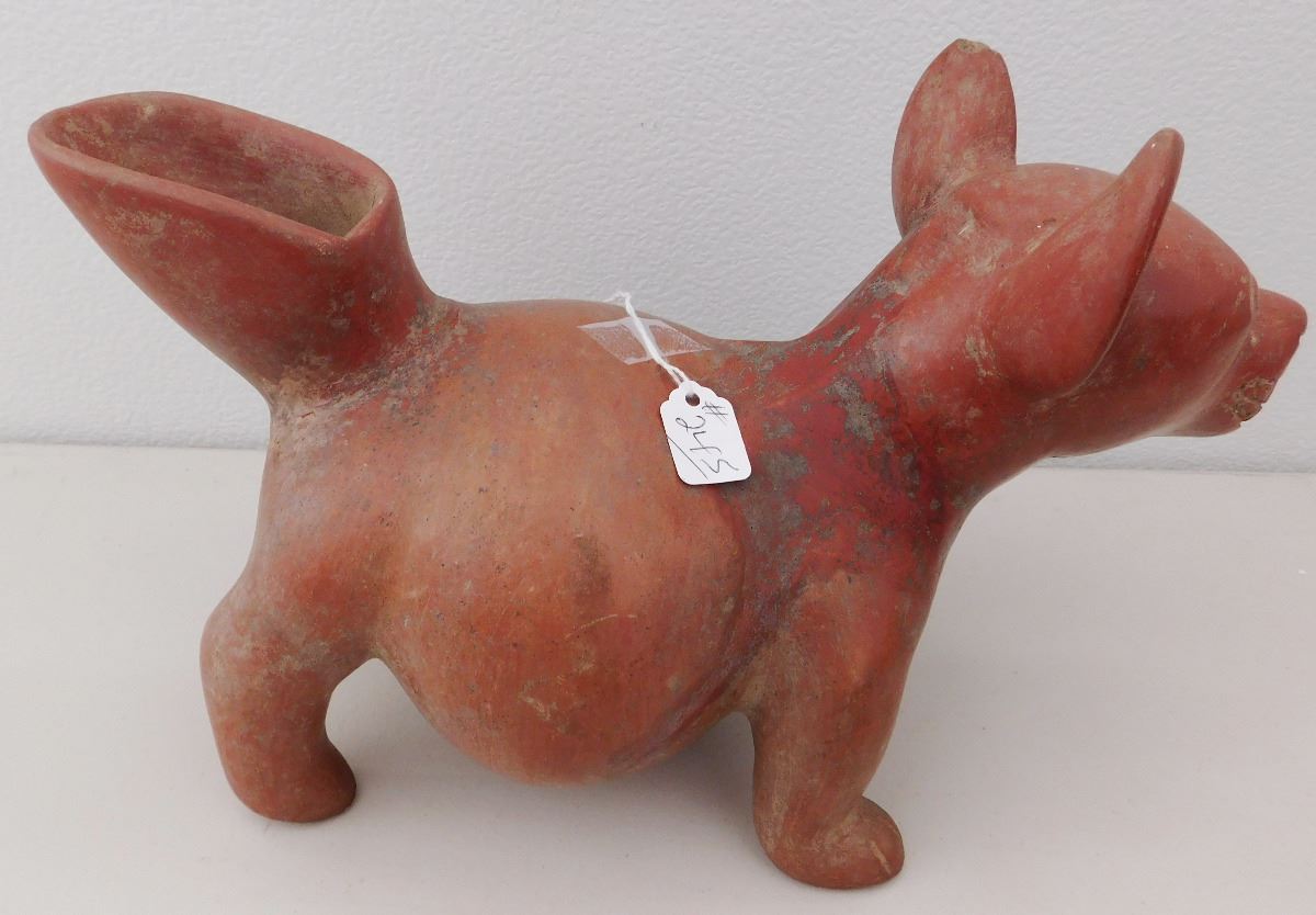 Pre-Columbian Colima Dog, circa 1500 years old. Made of clay and paint, this item measures 13" x 10" x 8". From Colima, Mexico. Hairless dog was believed to be a sacred pet. Condition: Minor restoration, minor nick on ear and scratch on forehead, see images. Shipping: $50.00, requires double box and insurance.