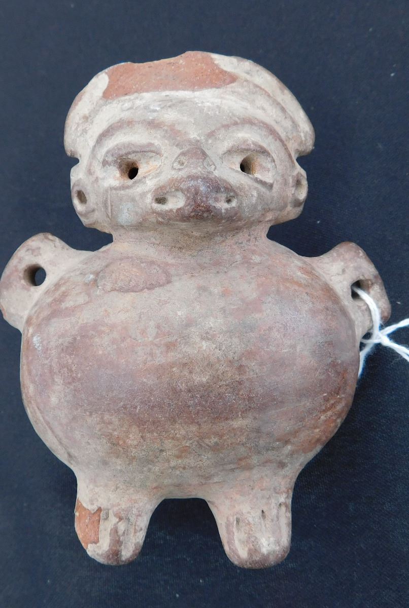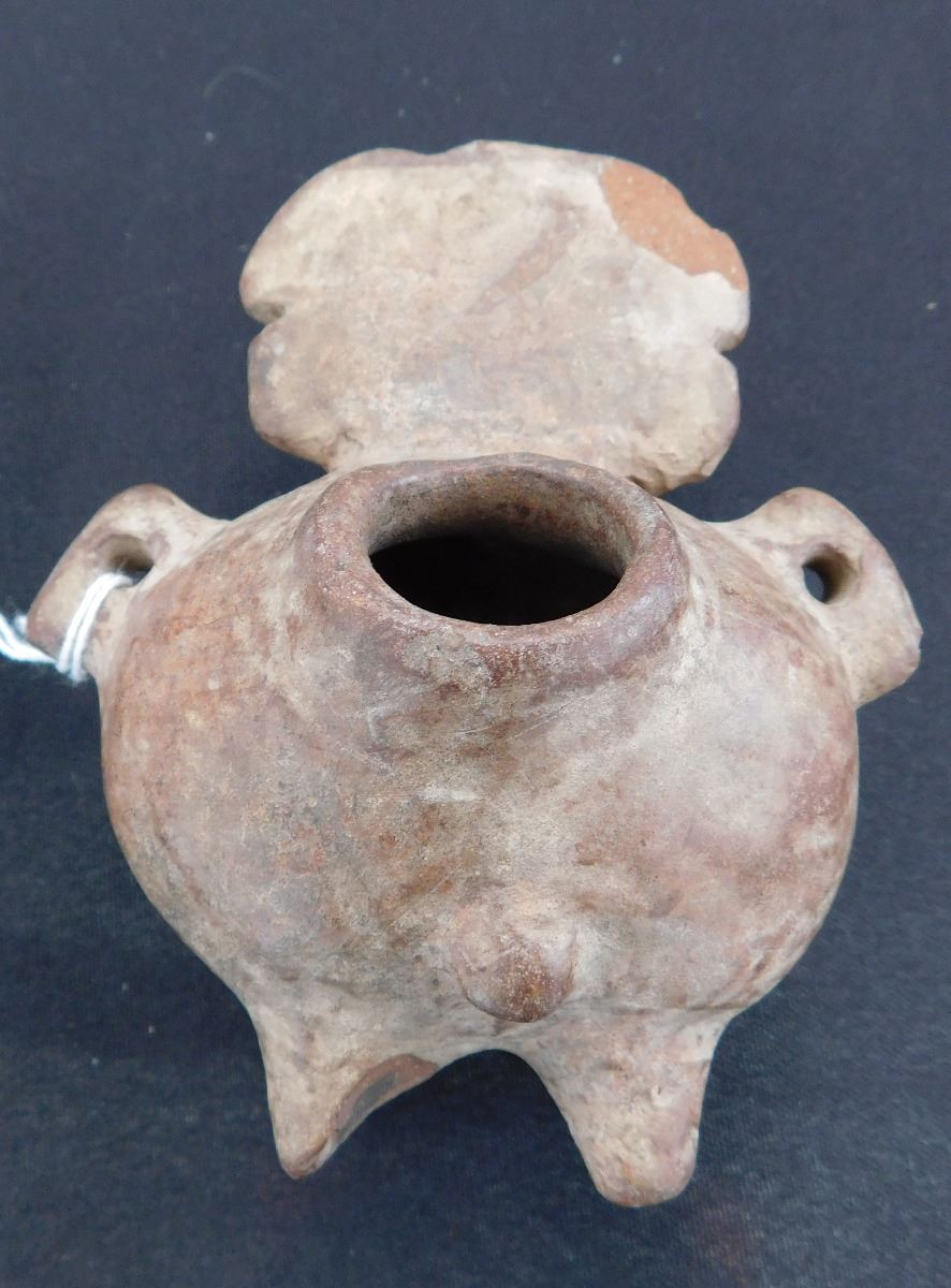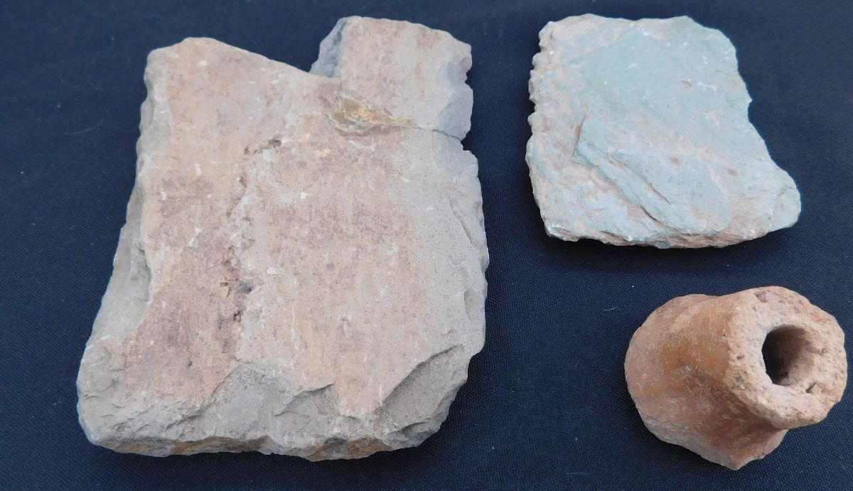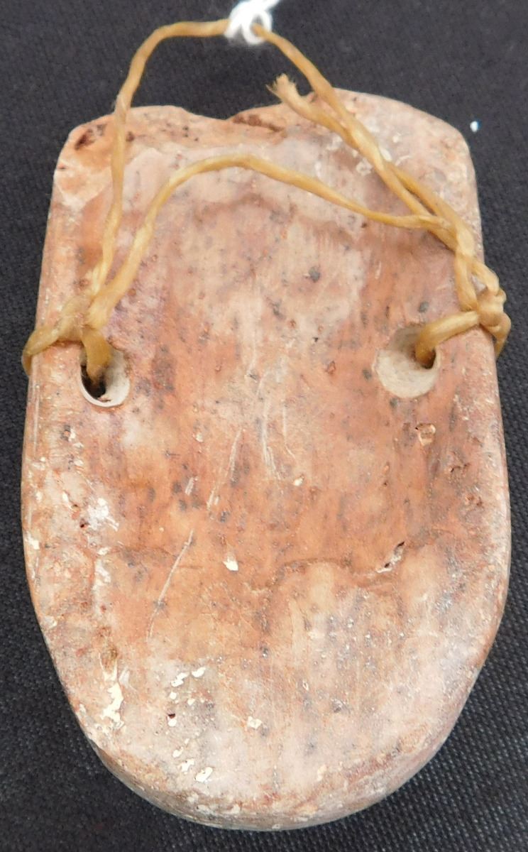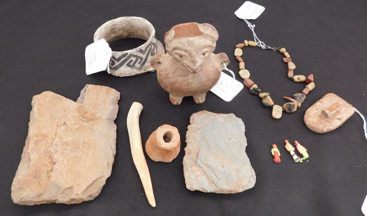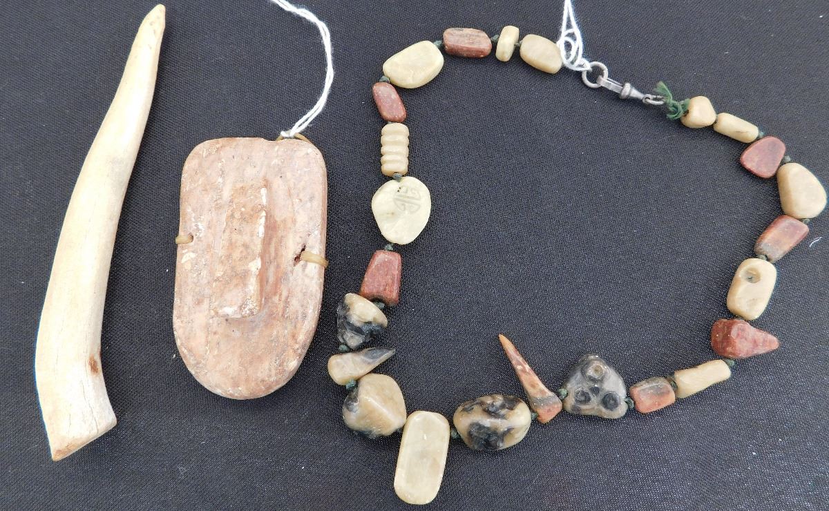 Eight pieces to include one bird pot, two slate knives. Pottery neck, pottery fragment, stone necklace, antler awl and stone maskette. Items measure from 6 to 2 inches. Shipping: $35.00
