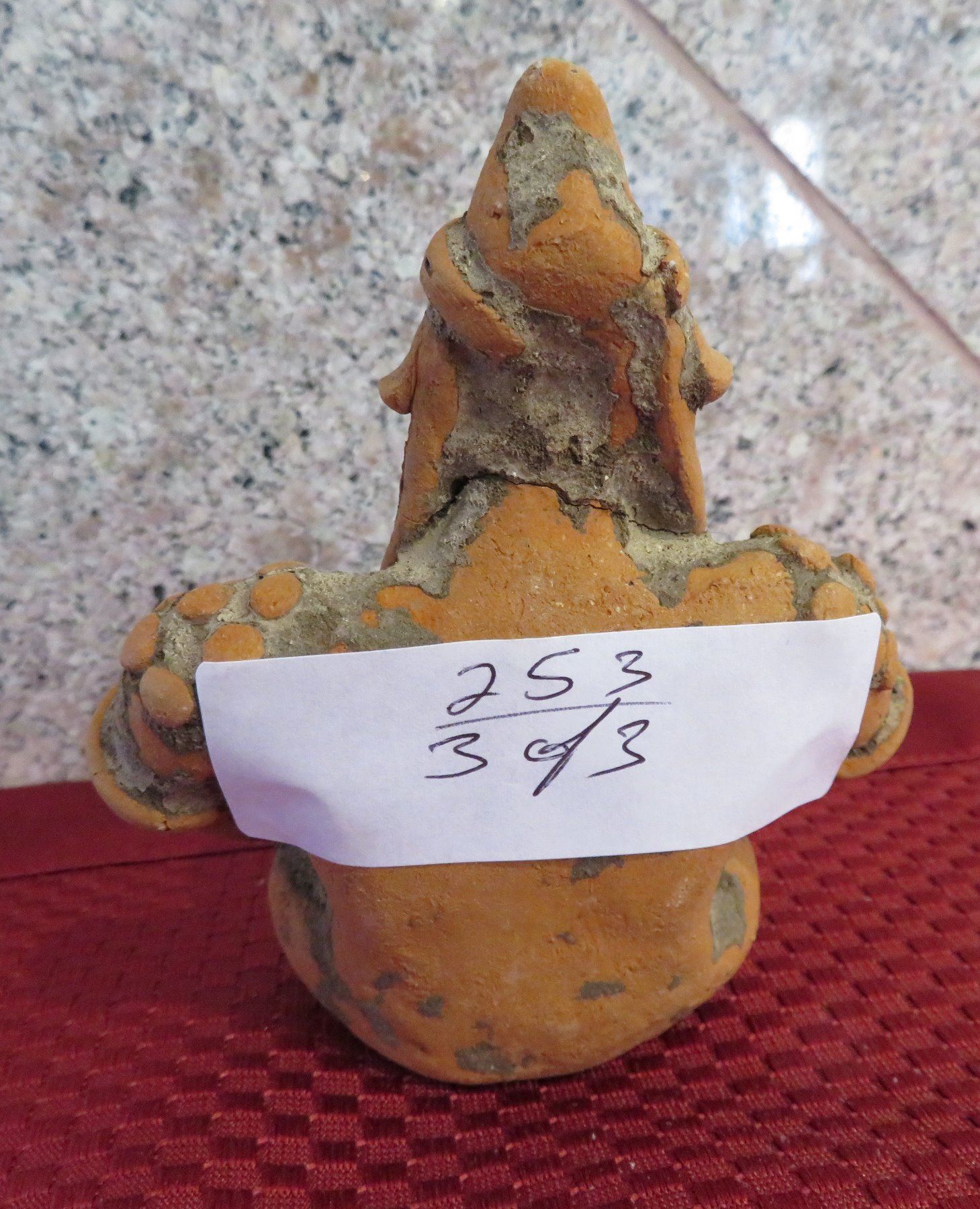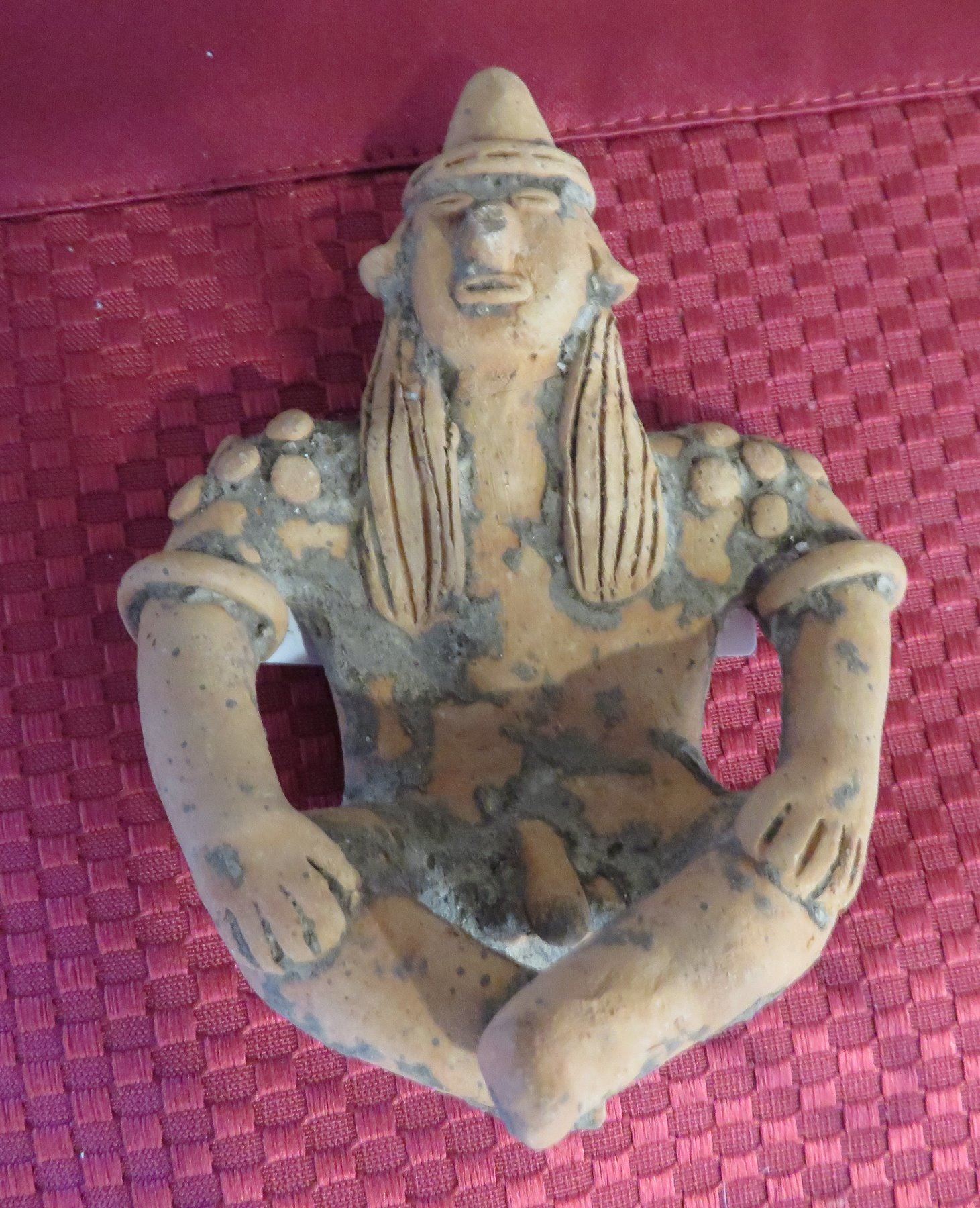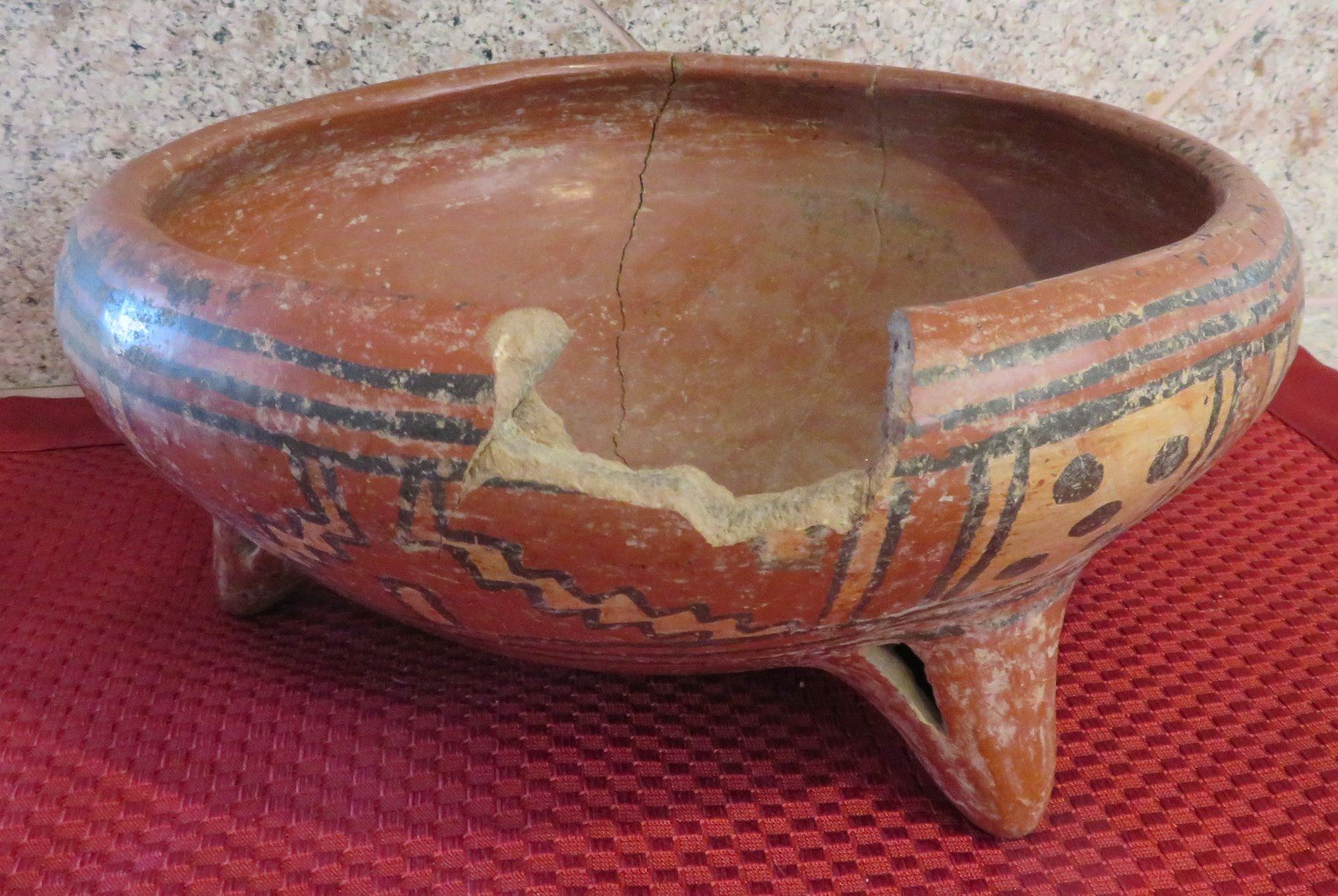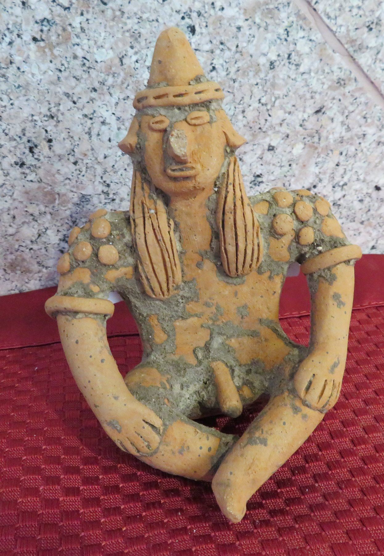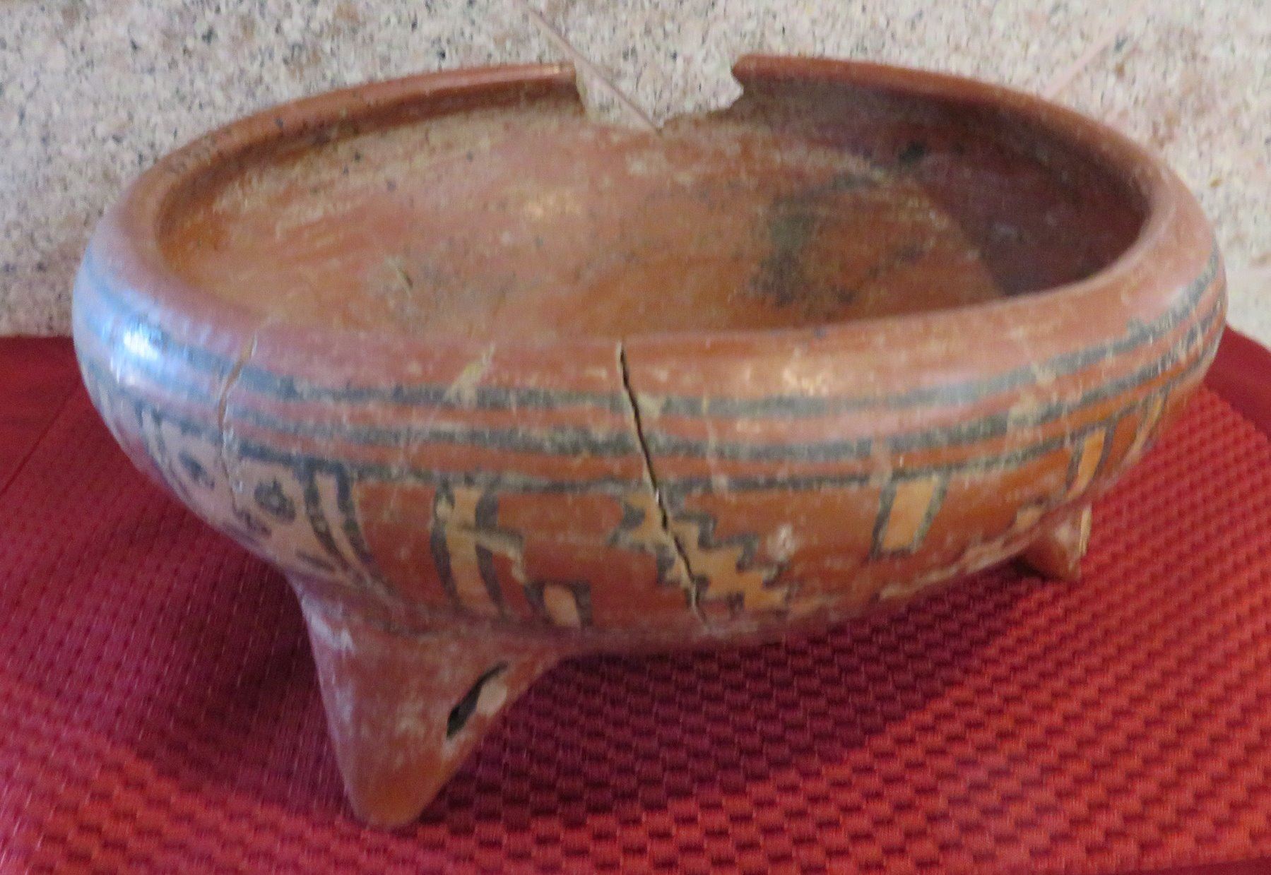 Pre-Columbian Collection, pre-Columbian items. Made of clay and paint, the largest measures 9 1/2". Colima, Chupicuaro larger bowl. Condition: Large chip and crack on large bowl, chip on nose of man, see images. Shipping: $60.00 w/insurance and signature, double-boxed.