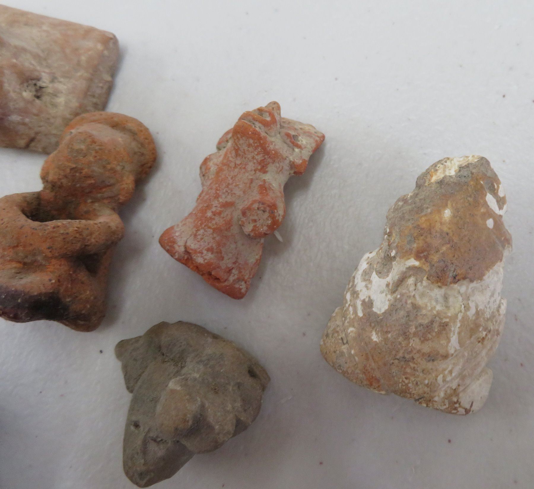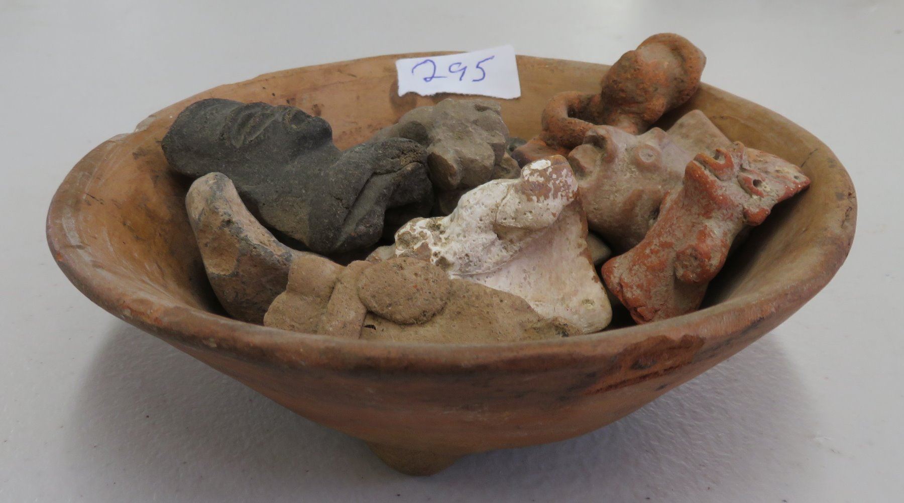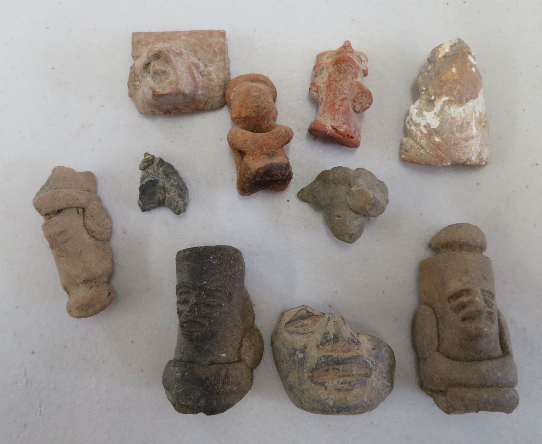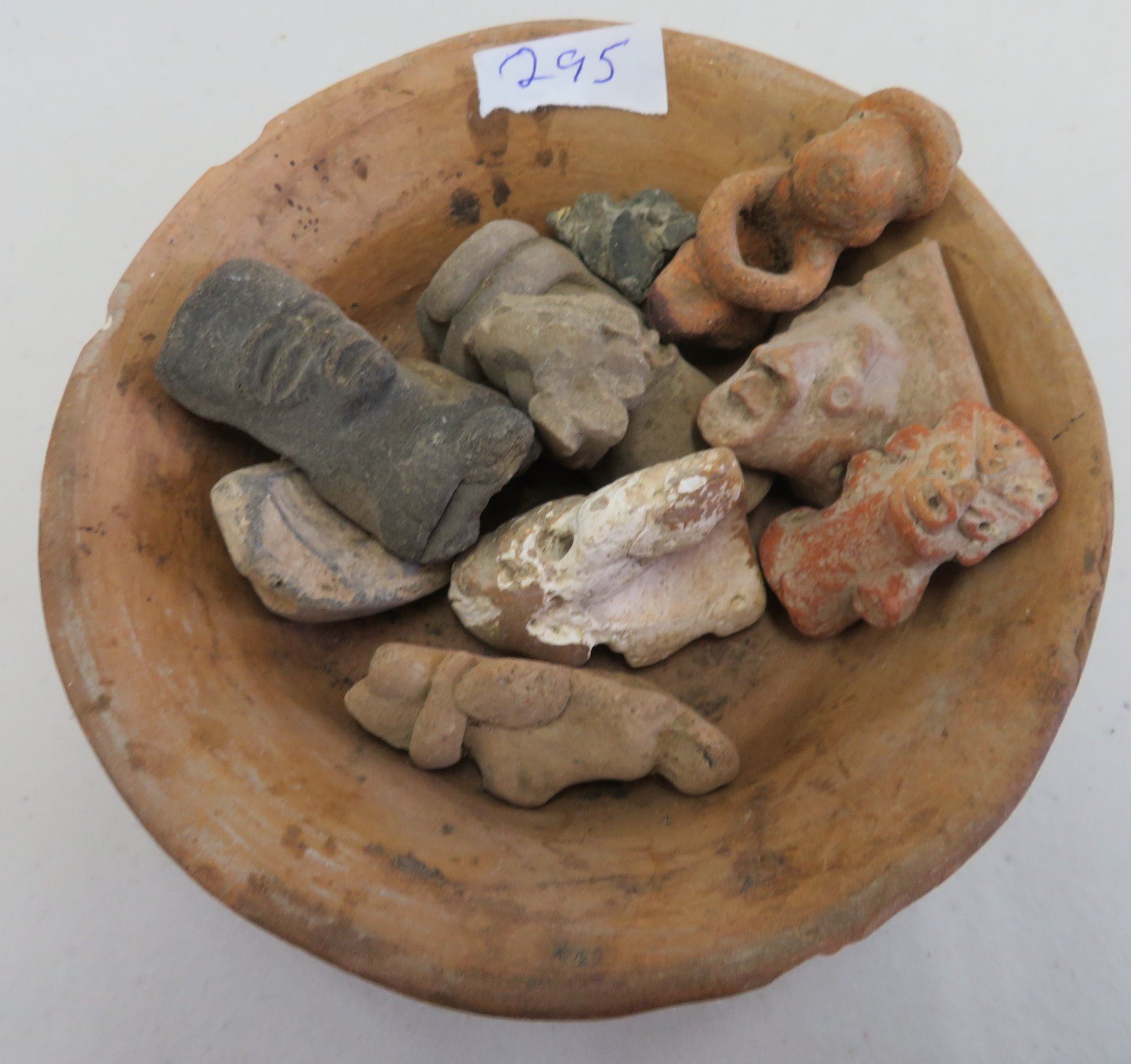 Pre-Columbian Collection, pre-Columbian items. Made of clay and paint, the bowl measures 6". Western Mexico. Bowl and ten other relics. Condition: Most have damage, see images. Shipping: $22.50 w/insurance and signature.