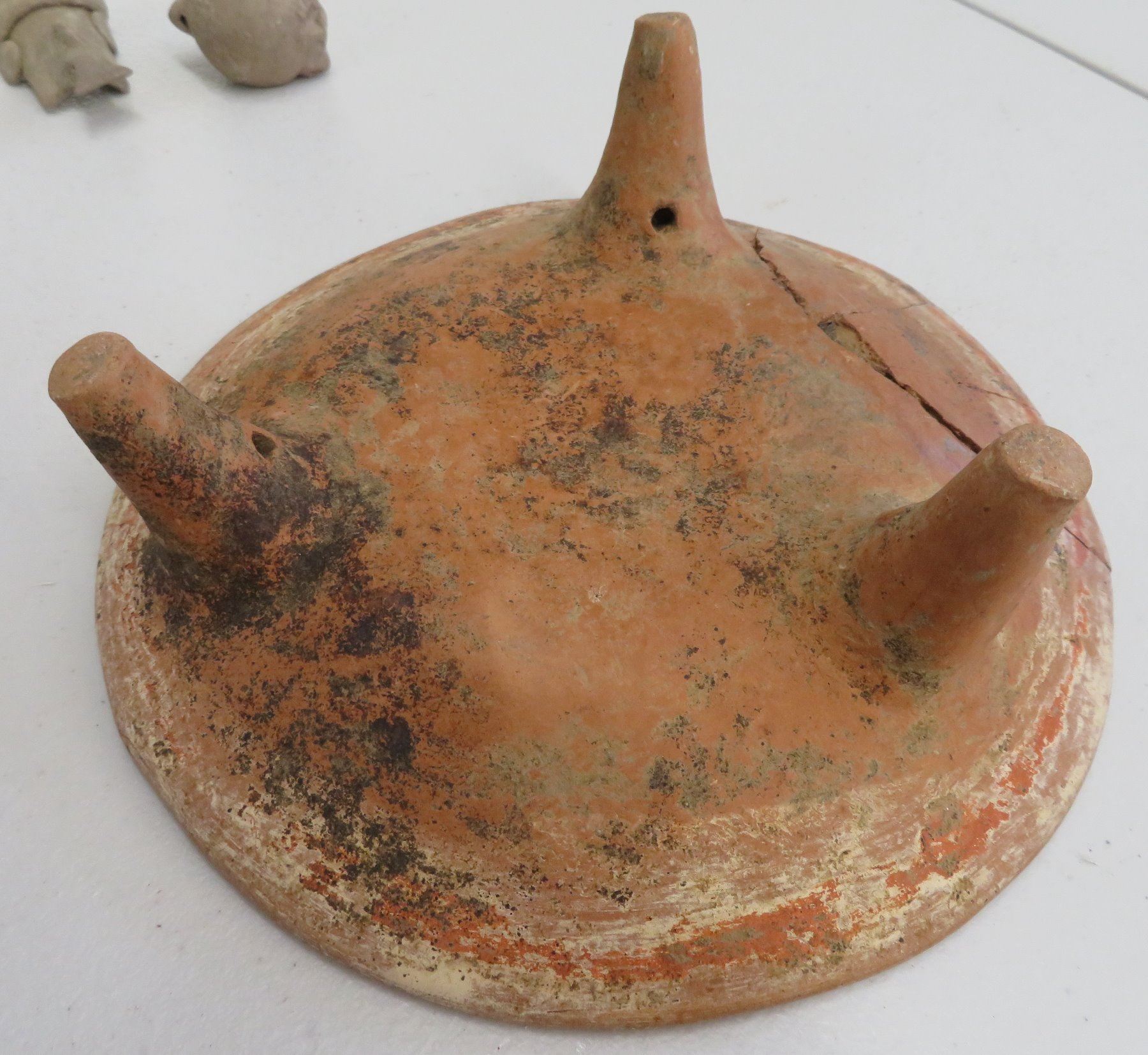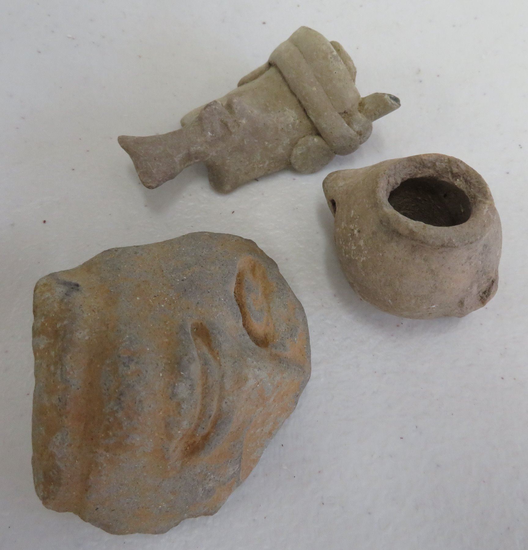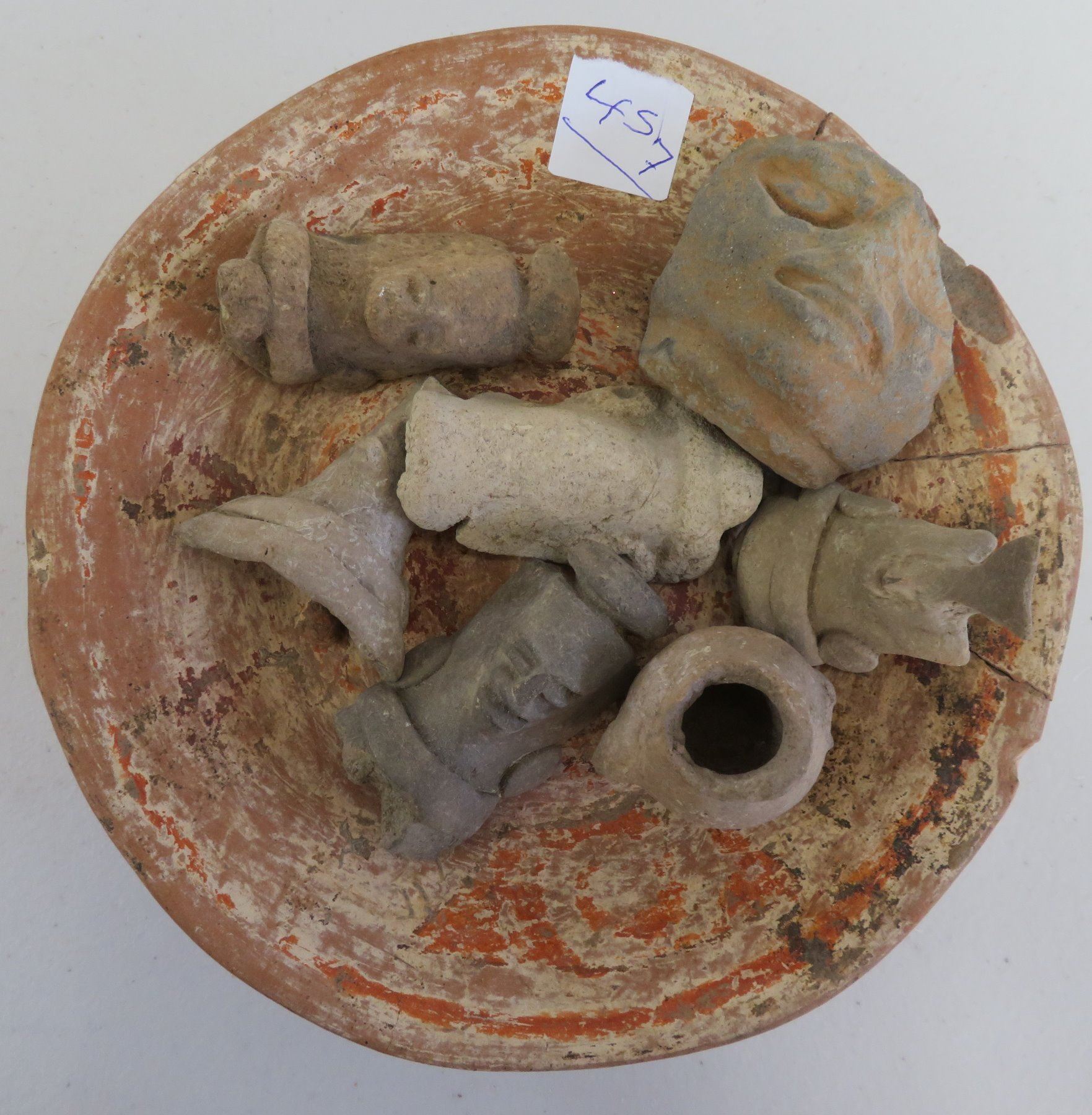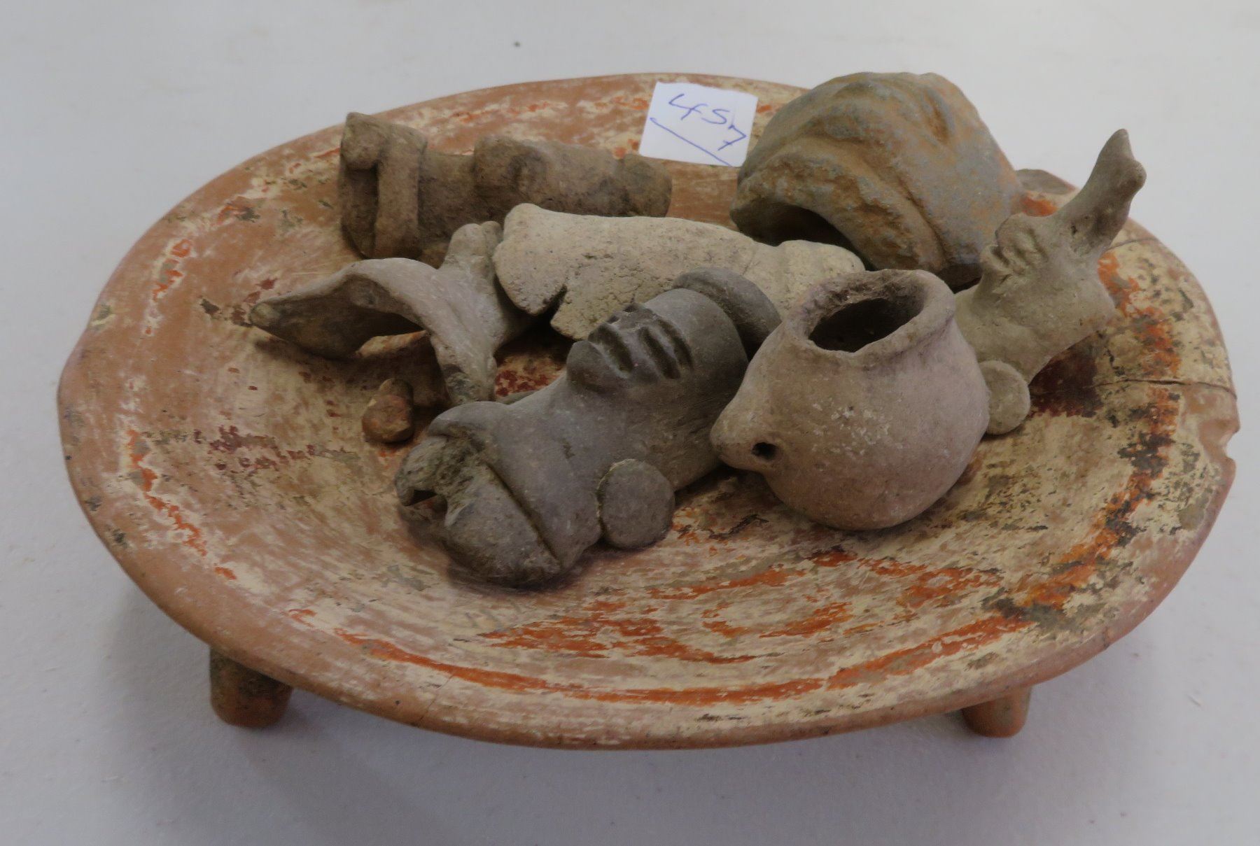Pre-Columbian Collection, pre-Columbian items. Made of clay and paint, the trileg plate measures 8" x 2". South America. 7 mold made pieces. Condition: All damaged, see images. Shipping: $32.50 w/insurance and signature, due to weight and value.