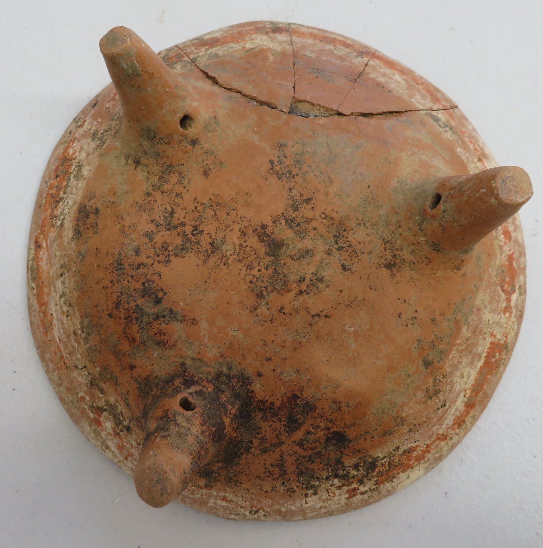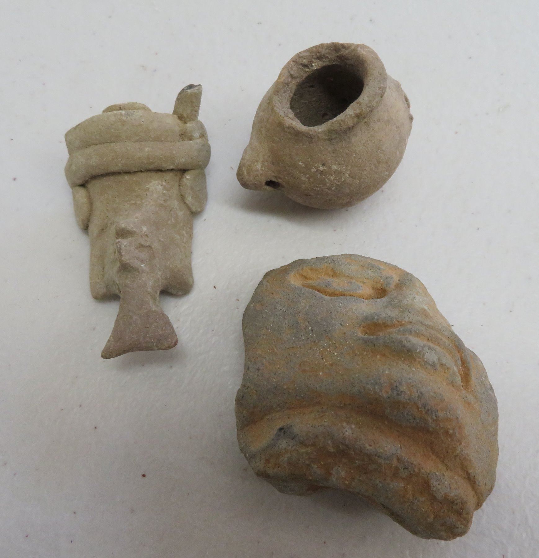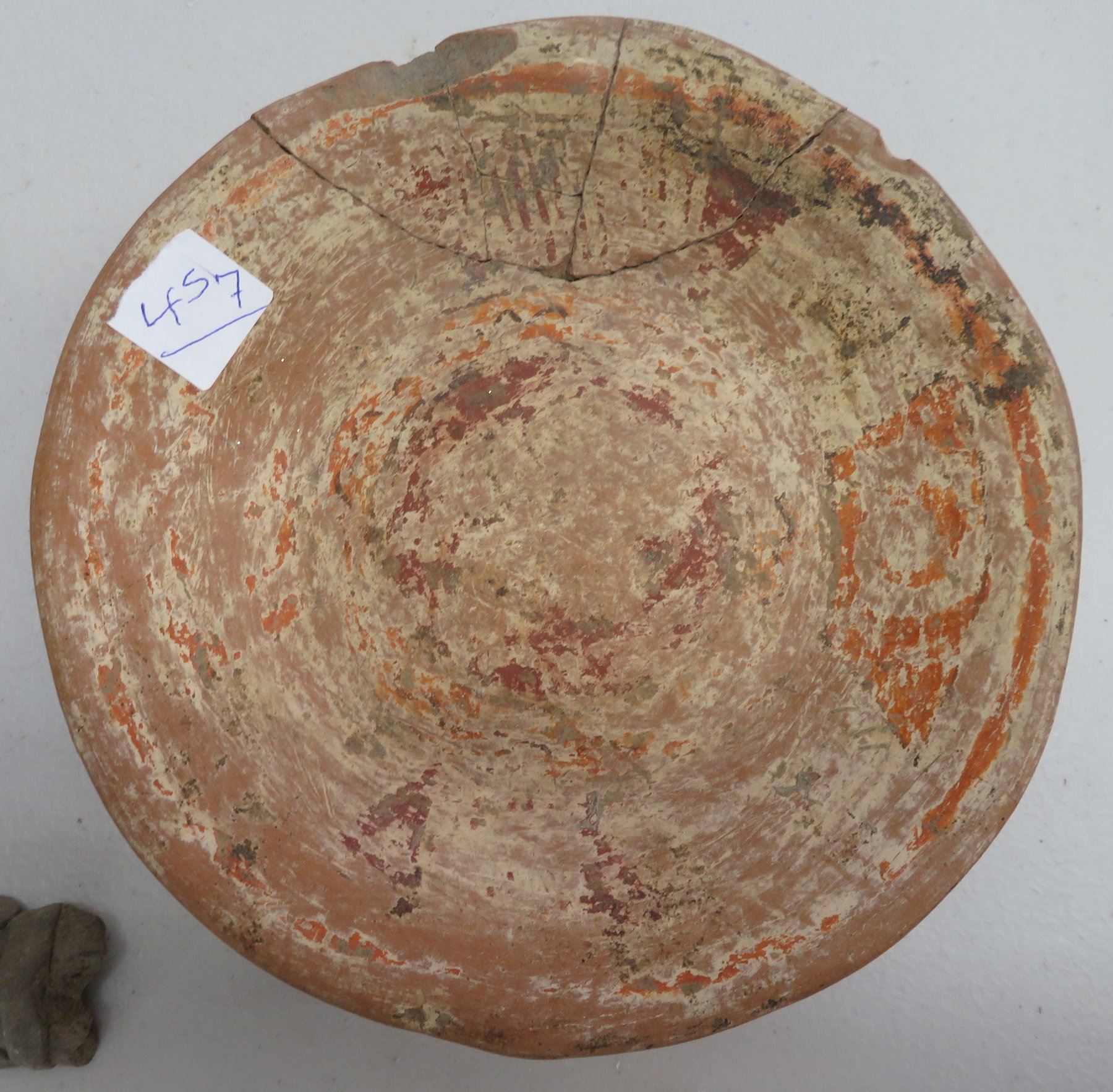 Pre-Columbian Collection, pre-Columbian items. Made of clay and paint, the trileg plate measures 8" x 2". South America. 7 mold made pieces. Condition: All damaged, see images. Shipping: $32.50 w/insurance and signature, due to weight and value.