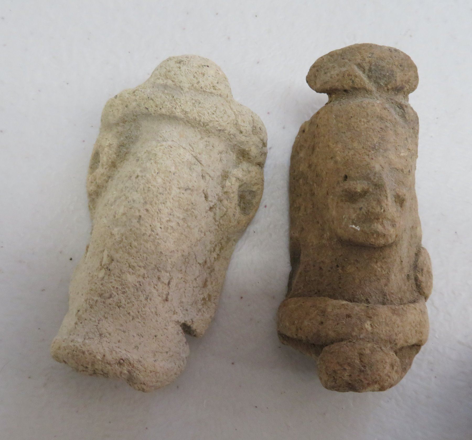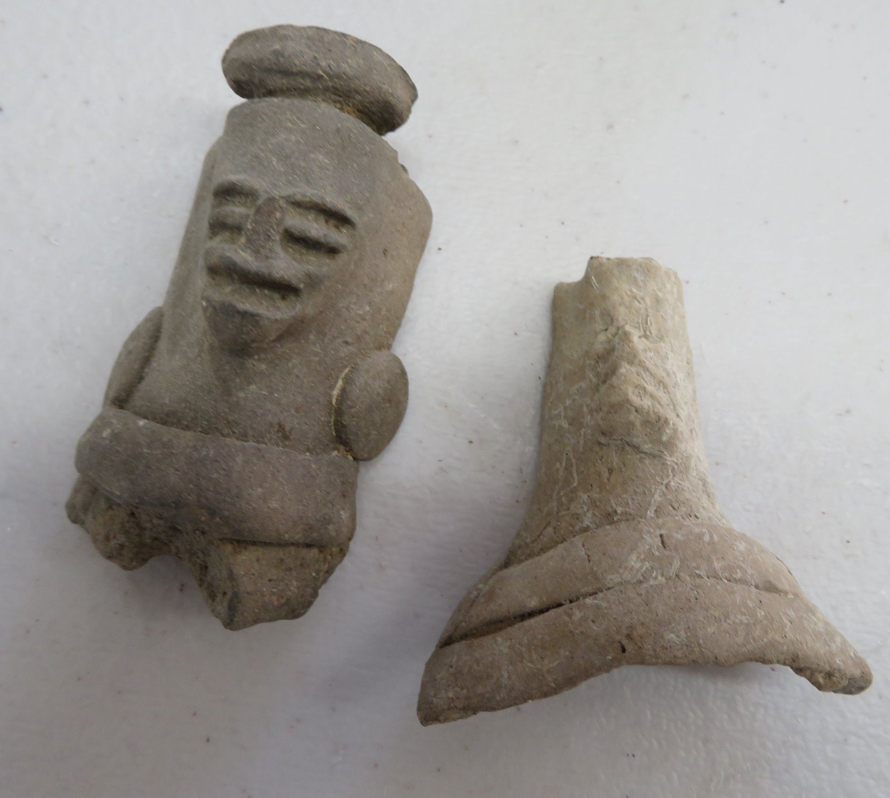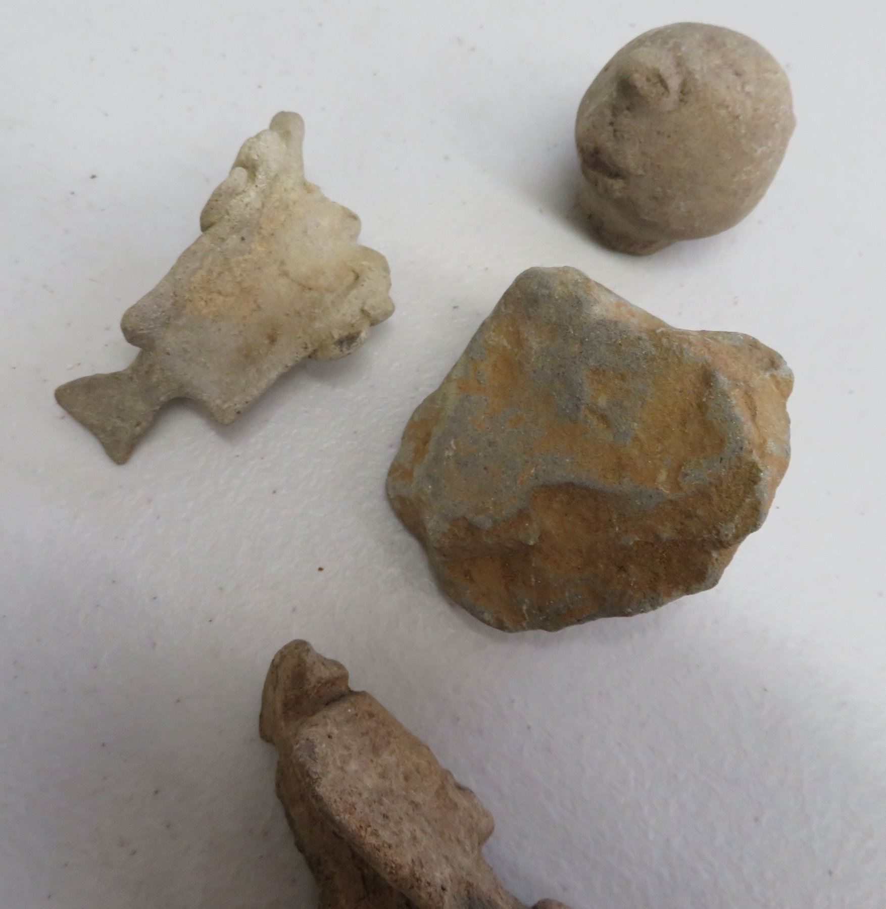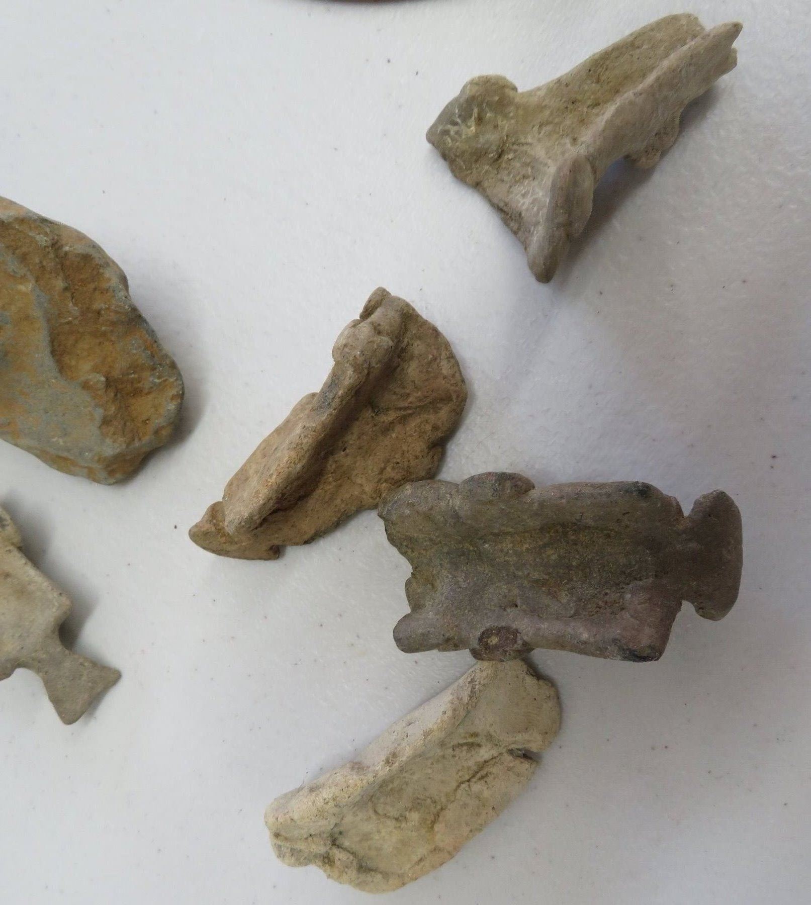 Pre-Columbian Collection, pre-Columbian items. Made of clay and paint, the trileg plate measures 8" x 2". South America. 7 mold made pieces. Condition: All damaged, see images. Shipping: $32.50 w/insurance and signature, due to weight and value.