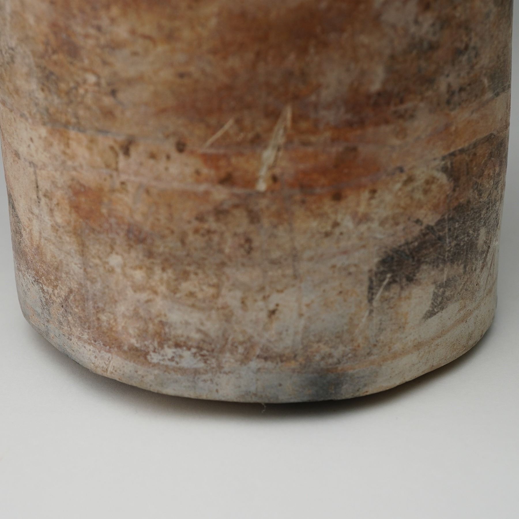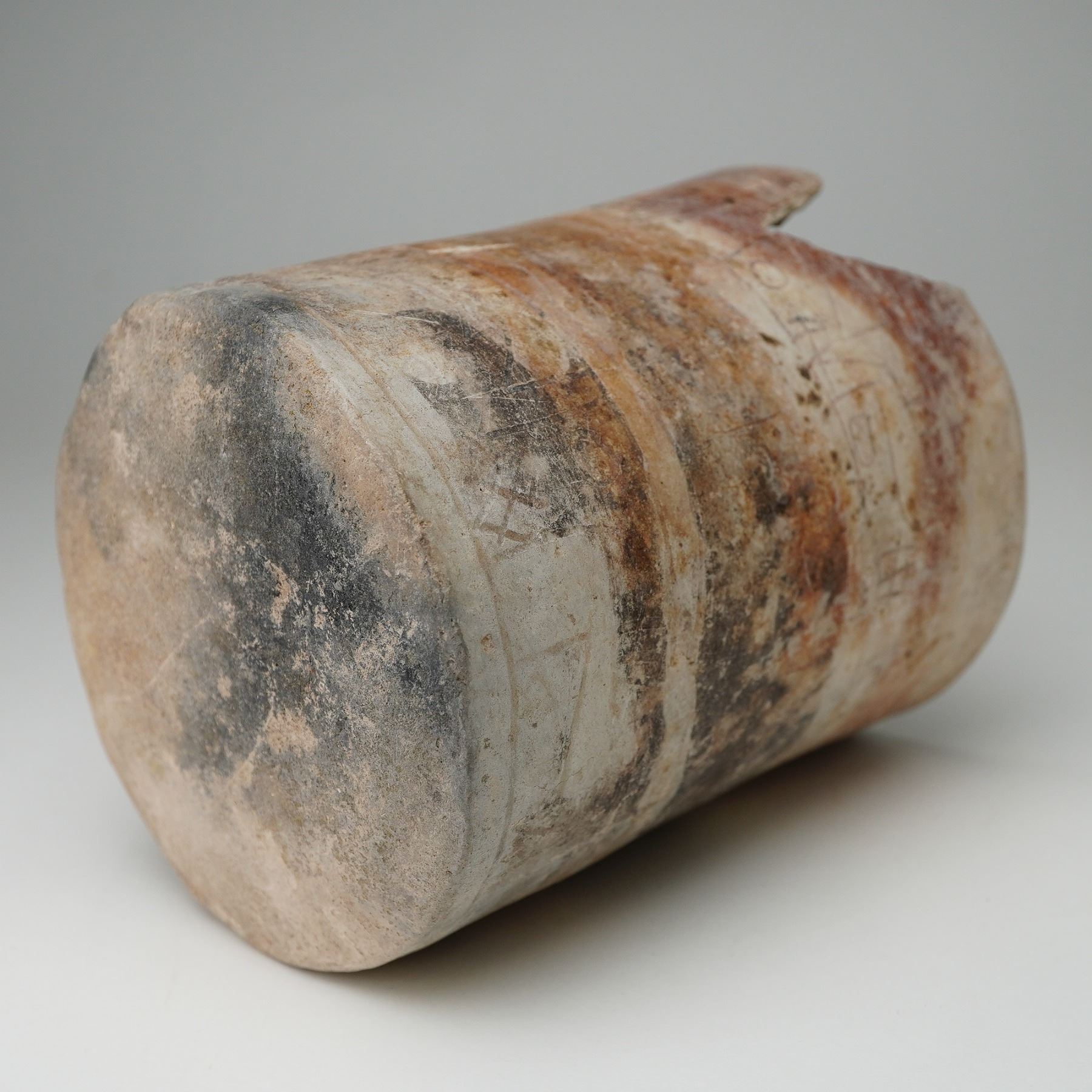This earthenware vessel features a cylindrical form and displays a weathered surface with varied earthy hues. The exterior is decorated with incised carvings, consisting of linear and geometric patterns that encircle the body. The vessel's surface exhibits natural areas of dark discoloration. It has a chipped rim, exposing the coarse texture of the clay. The vessel is robust and bears signs of aging, with a wide, flat base that shows wear from historical use or storage. The exact age of this piece is indeterminate.