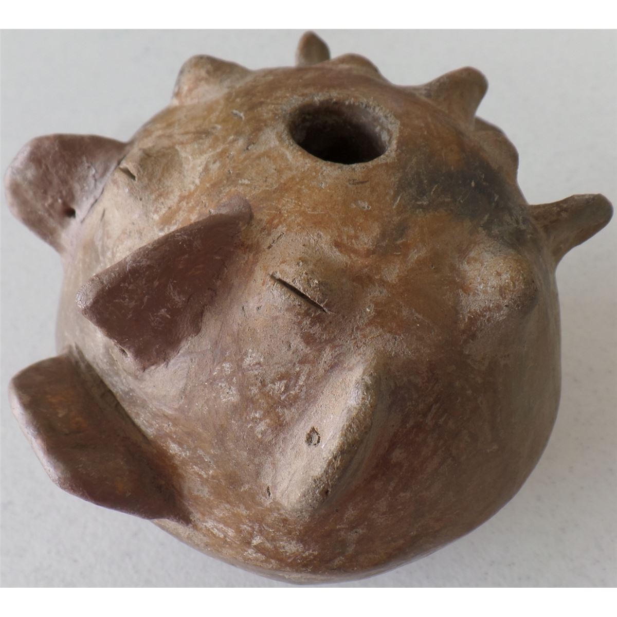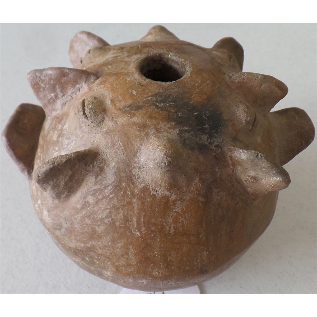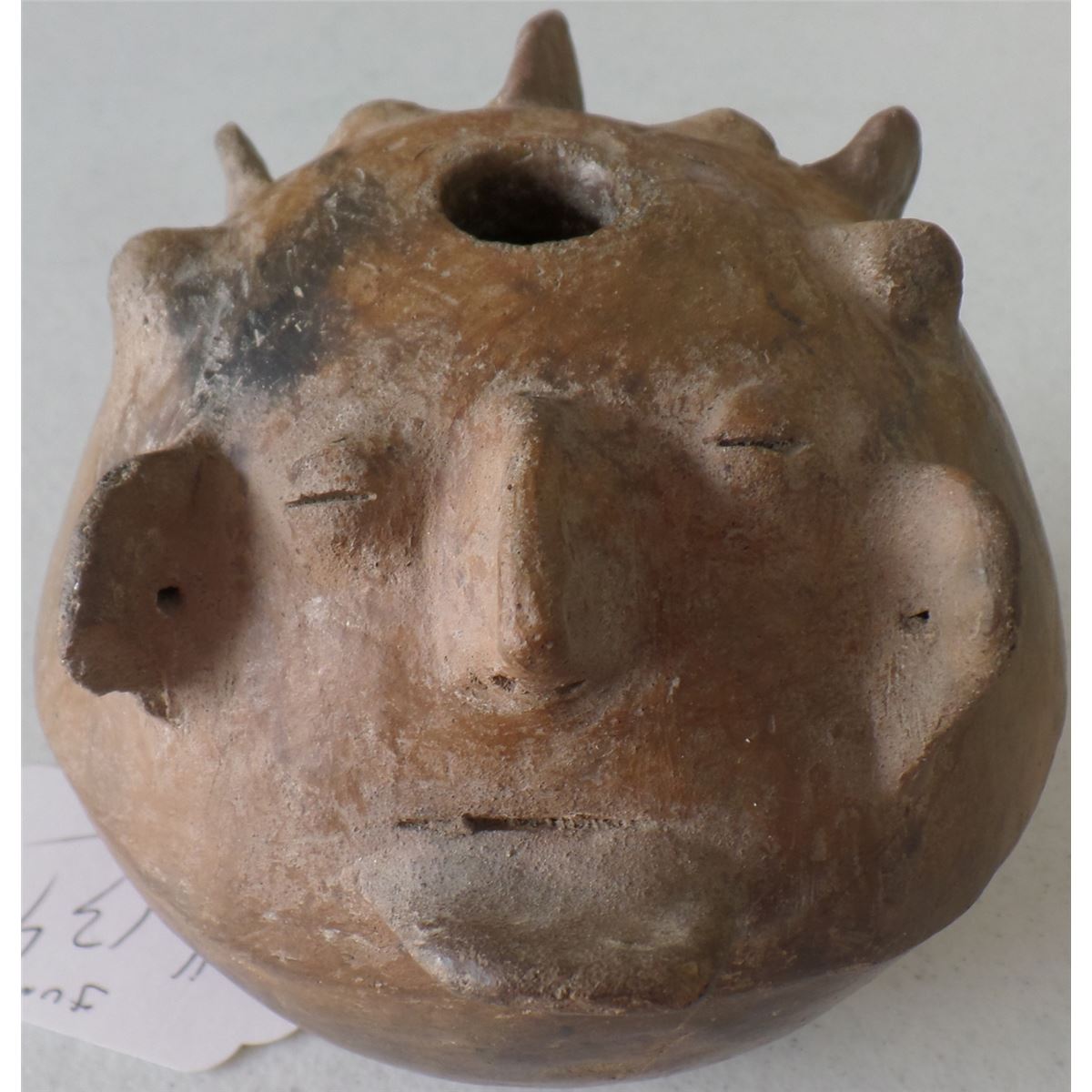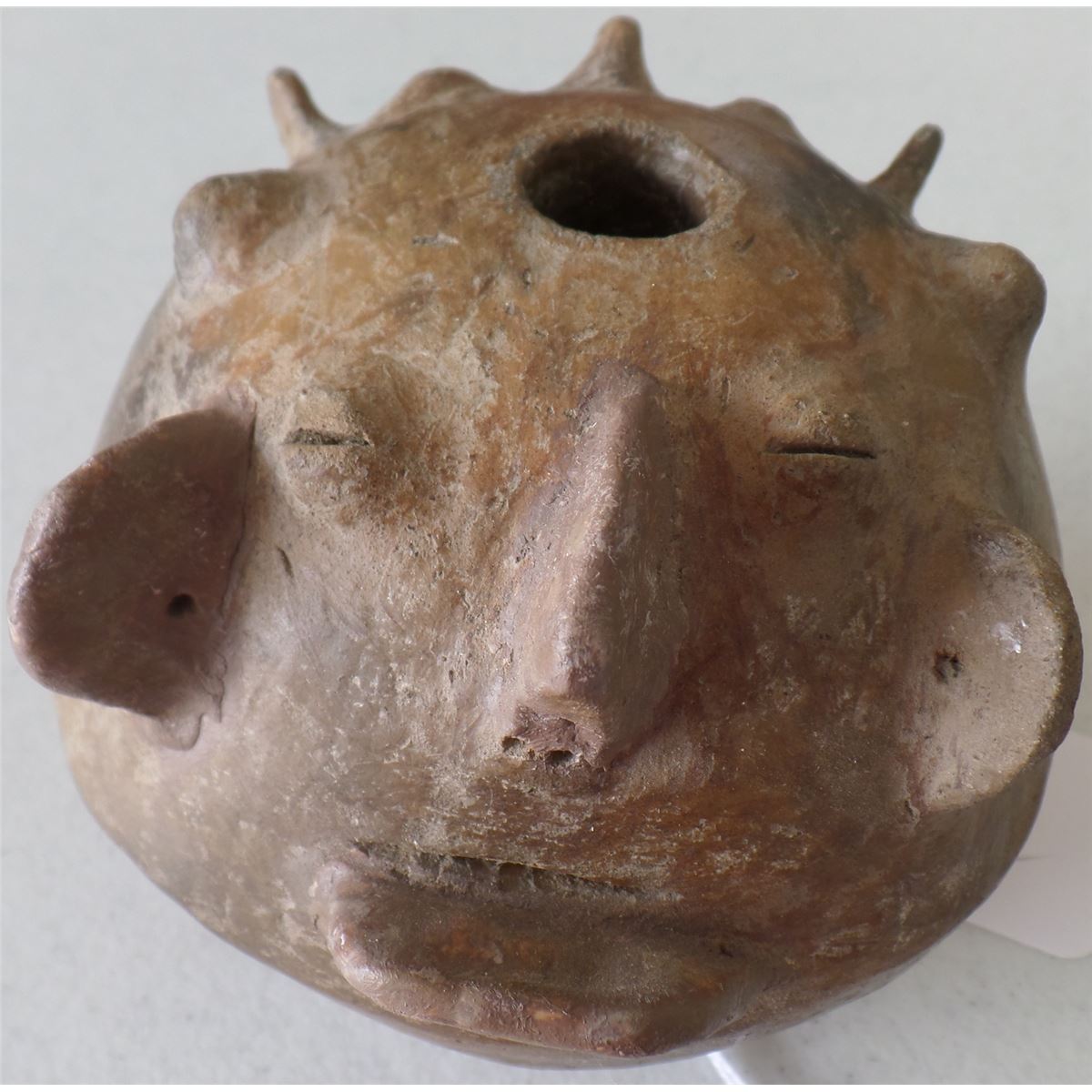This item is made from Clay and measures 4 1/2 x 4 1/2 x 5 inches. It is from Chile, South American. There is restoration on chin and knob on face. This is a rare pot. Shipping $18.00