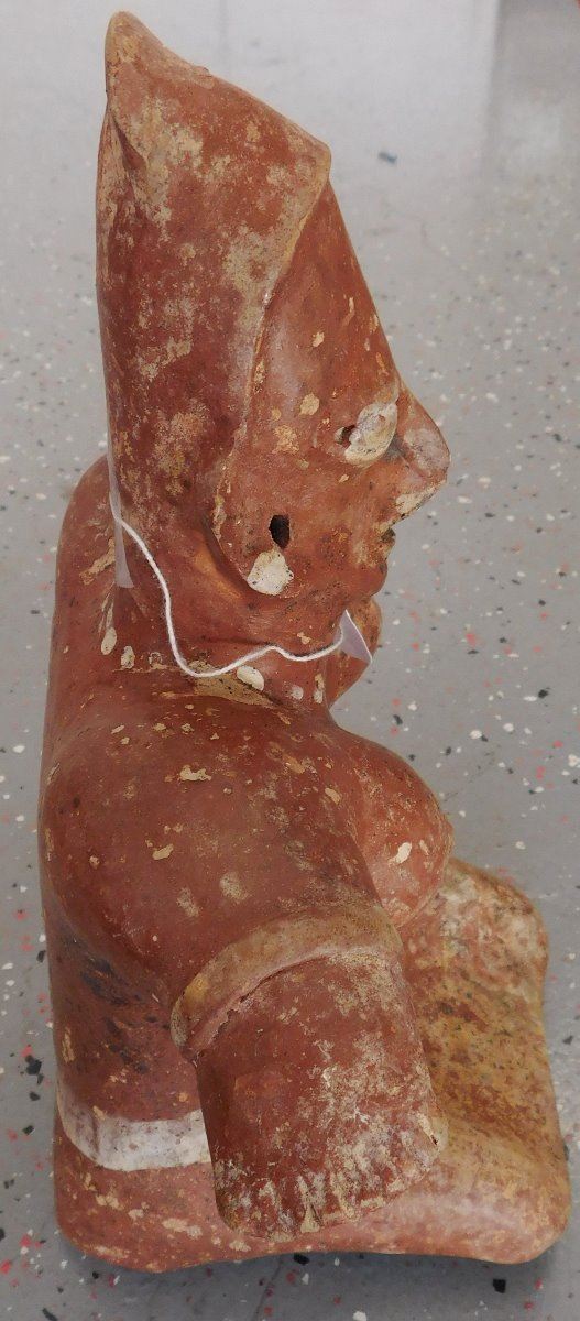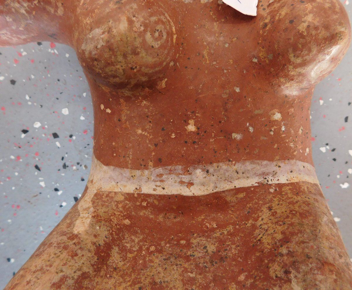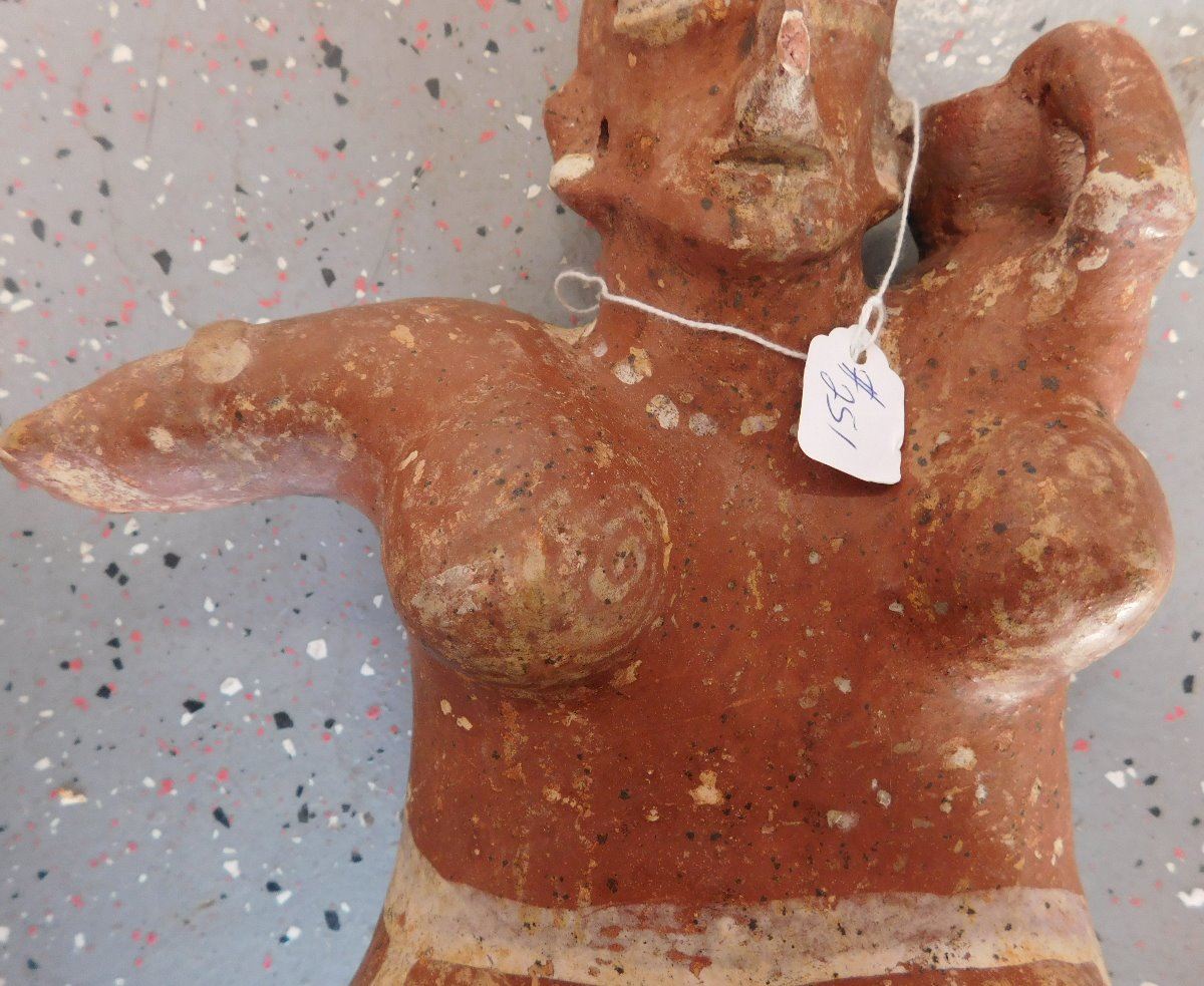 Pre-Columbian Female Figure, circa 1000 A.D. Made of clay and paint, this item is 8" x 5.5" x 12". Jalisco, Mexico. Great Jalisco figure with painted breasts, wonderful patina. Condition: Nick on nose, see images. Shipping: $40.00 double-boxed, w/insurance and signature.
