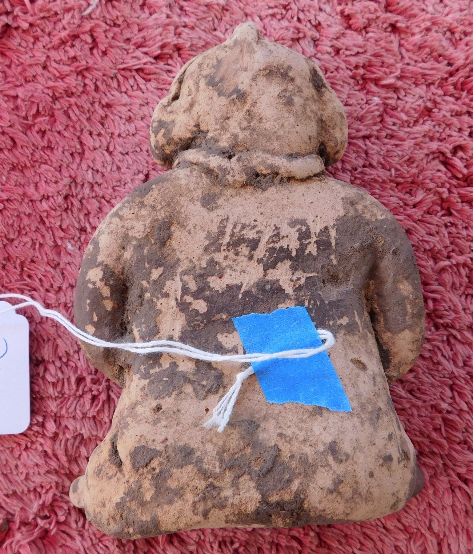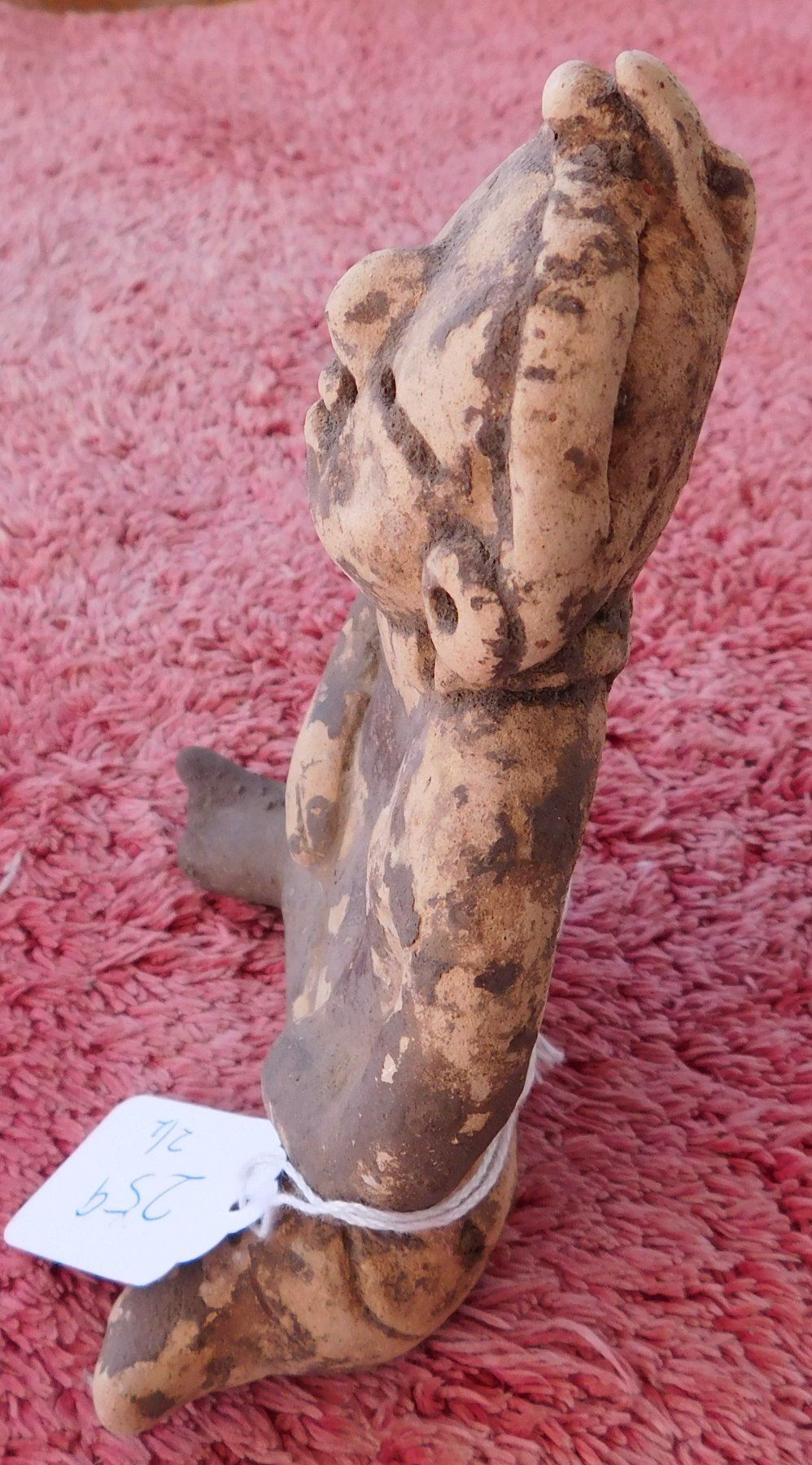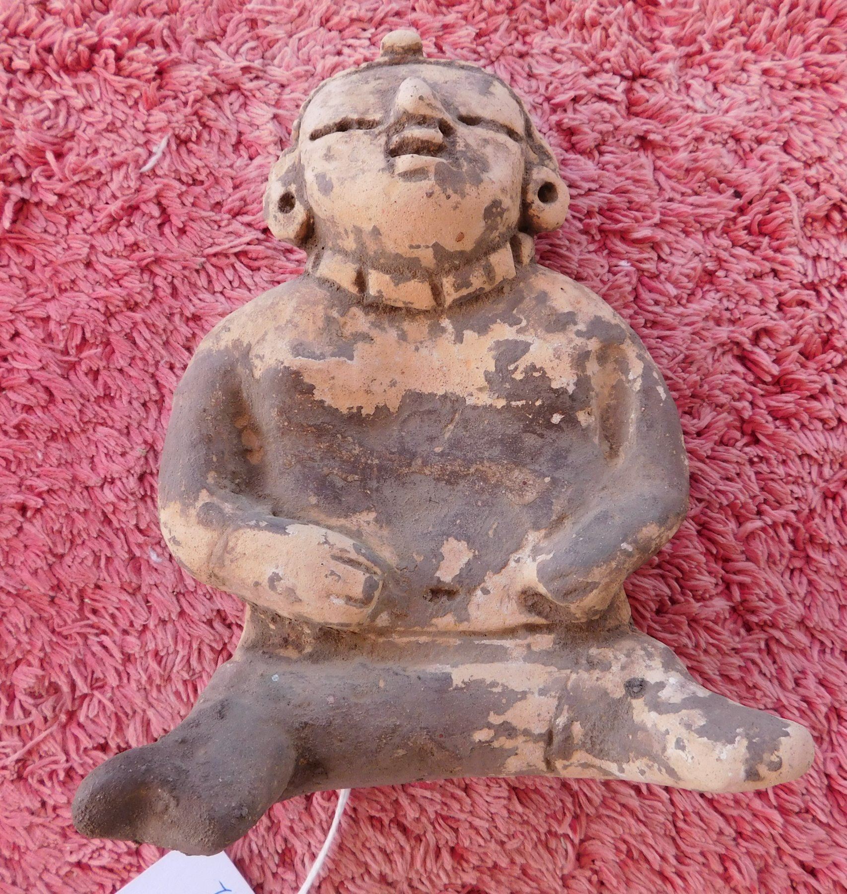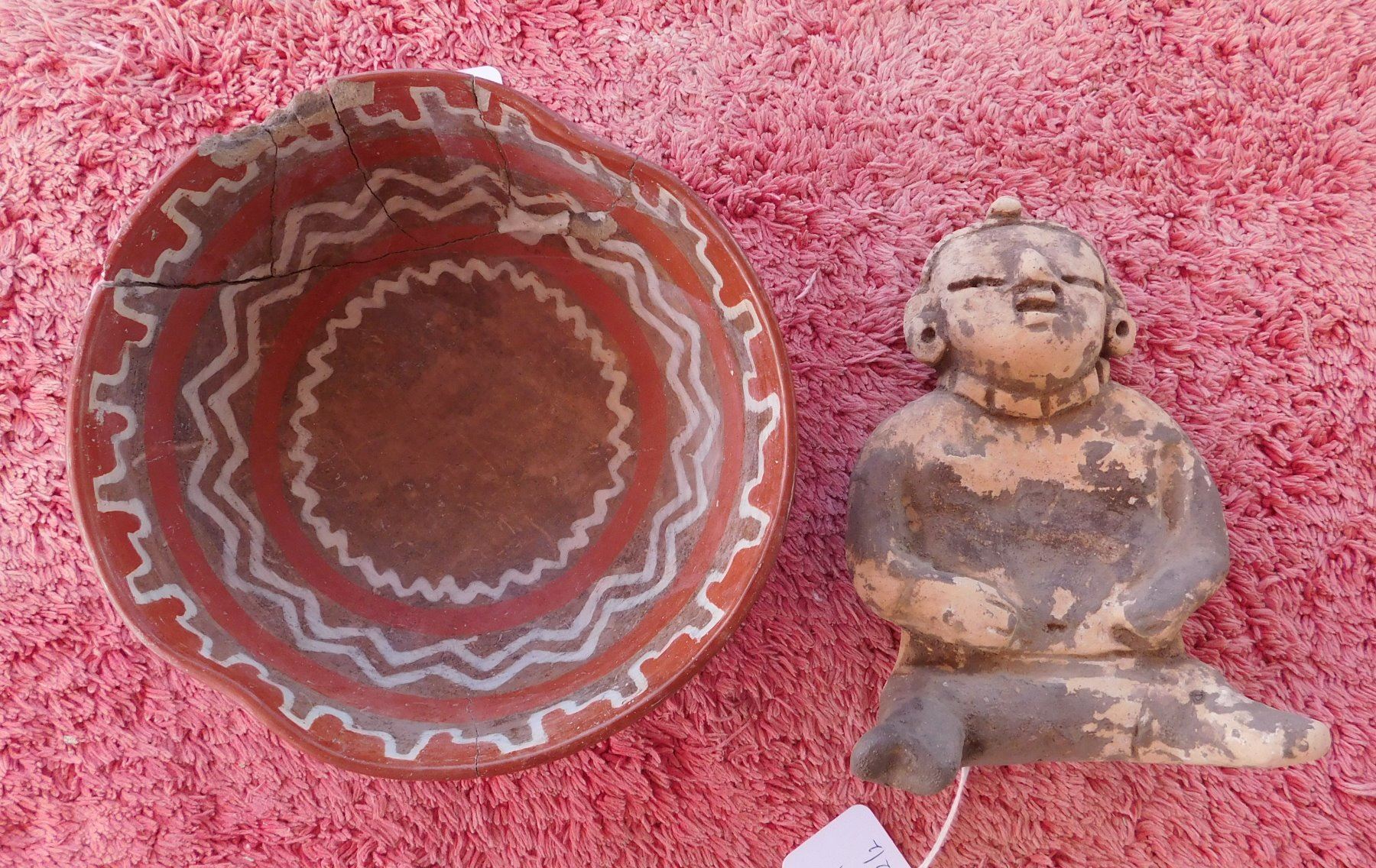 Pre-Columbian Figure & Vase, pre-Columbian items. Made of clay and paint, the items measure 4.5" x 6" x 2.25" and 6 1/8" x 6 1/8" x 2 1/2". Mexico. From an old, 1960s California collection. Condition: As found, cracked bowl, see images. Shipping: $24.50 w/insurance and signature.