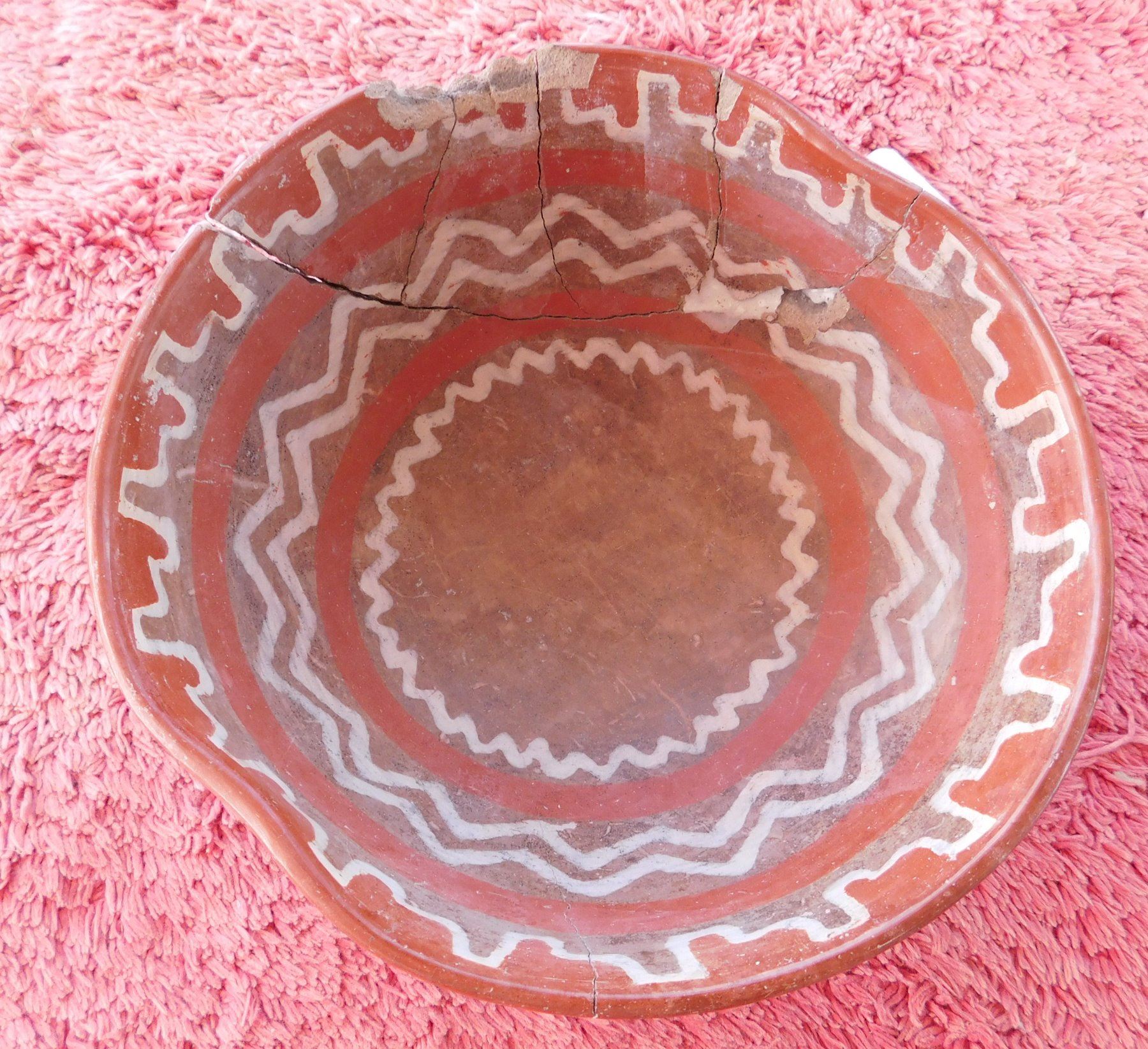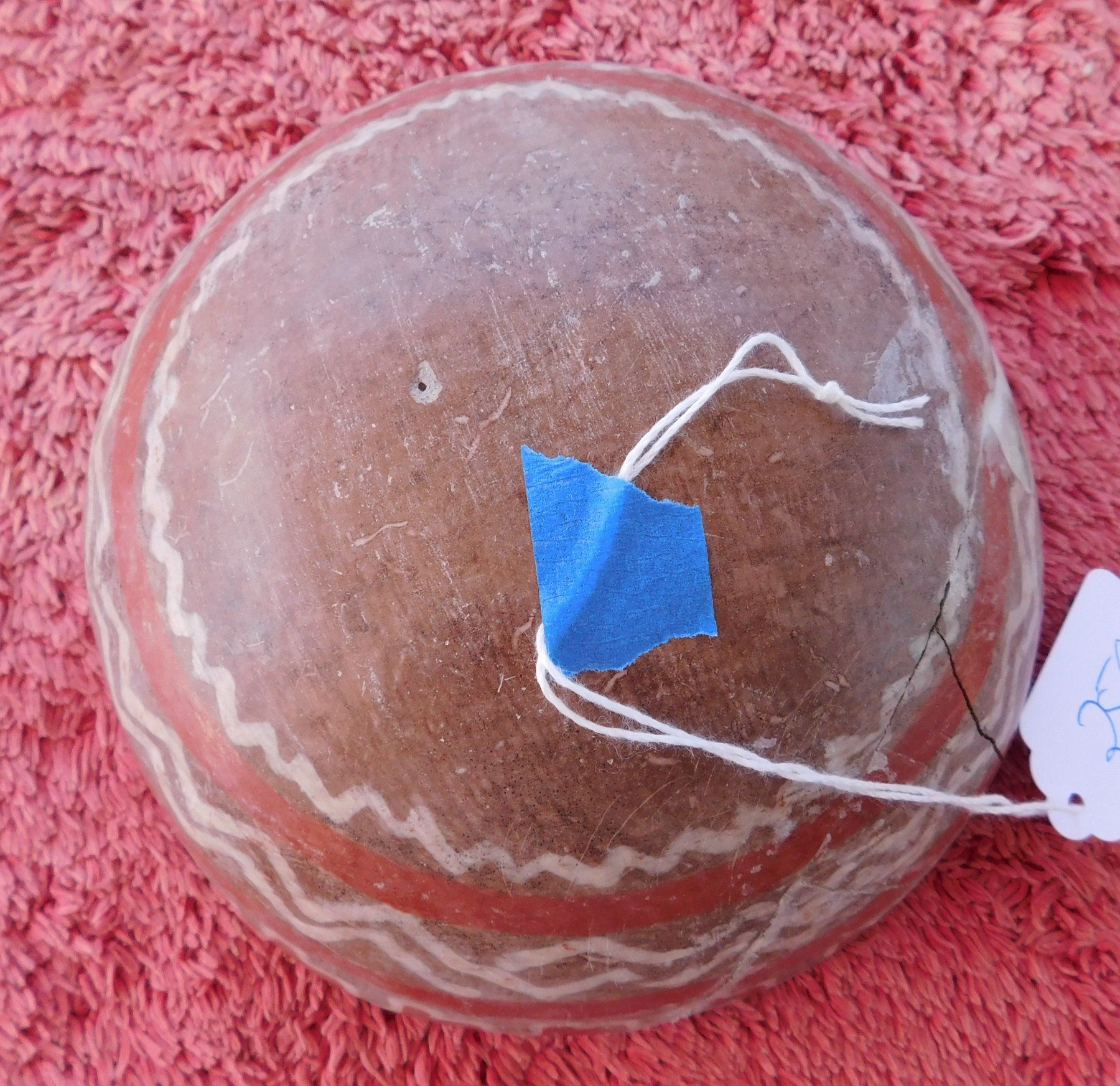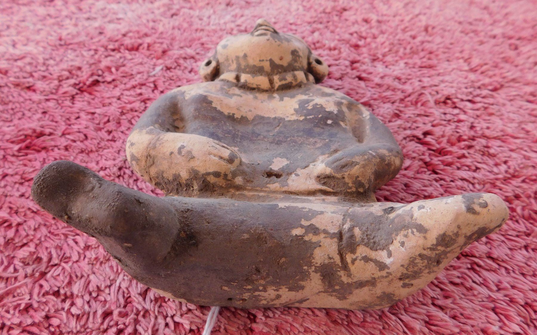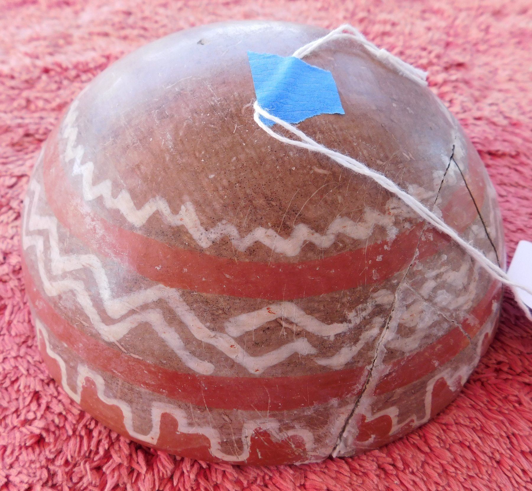 Pre-Columbian Figure & Vase, pre-Columbian items. Made of clay and paint, the items measure 4.5" x 6" x 2.25" and 6 1/8" x 6 1/8" x 2 1/2". Mexico. From an old, 1960s California collection. Condition: As found, cracked bowl, see images. Shipping: $24.50 w/insurance and signature.