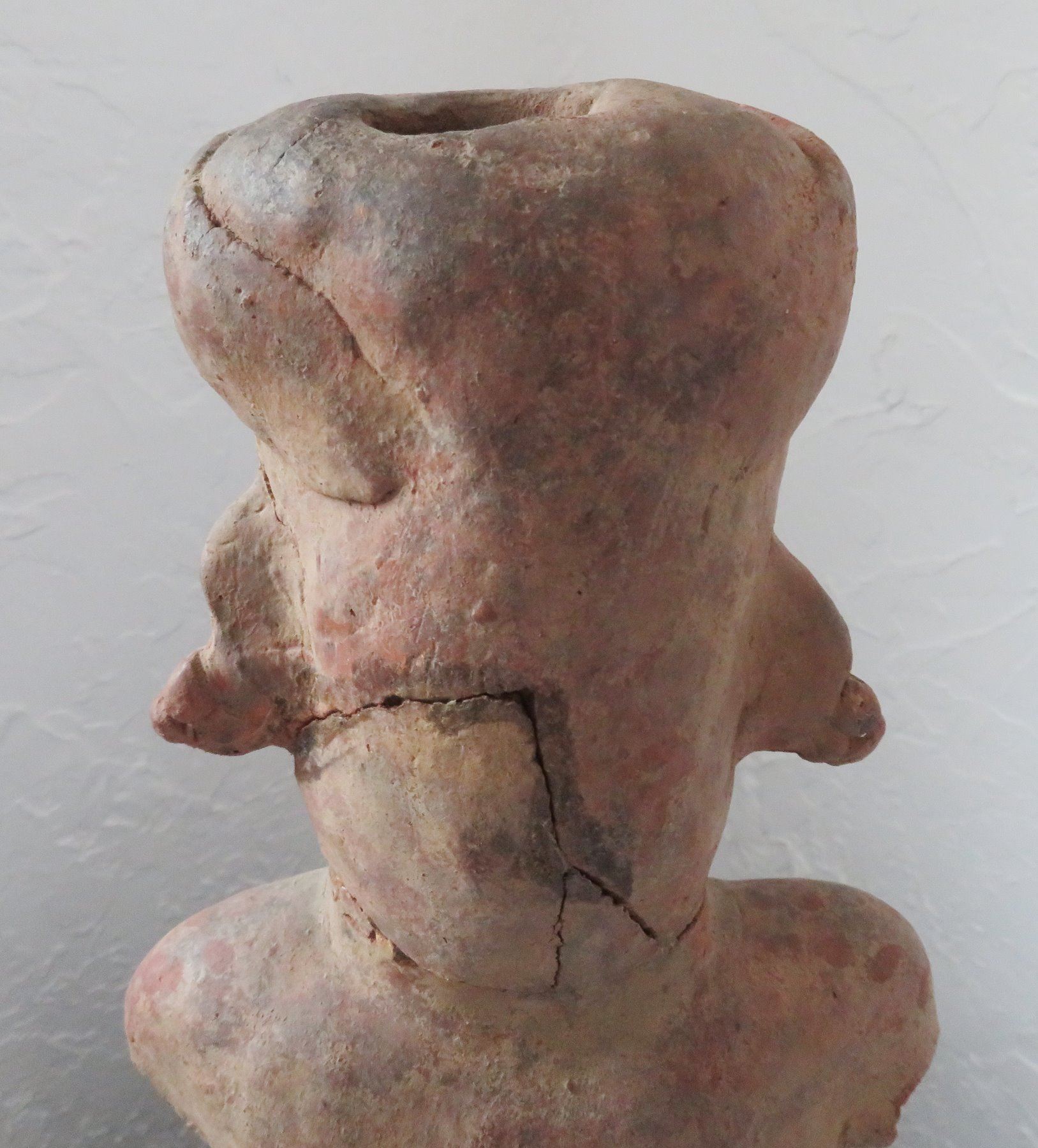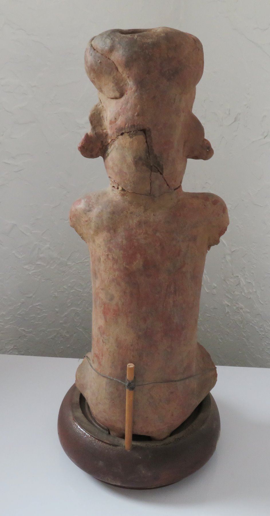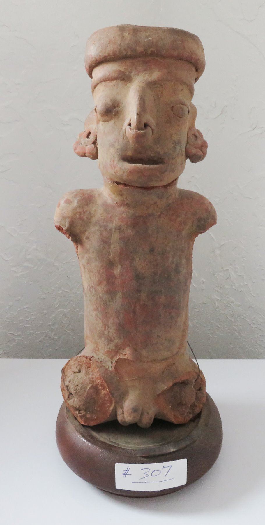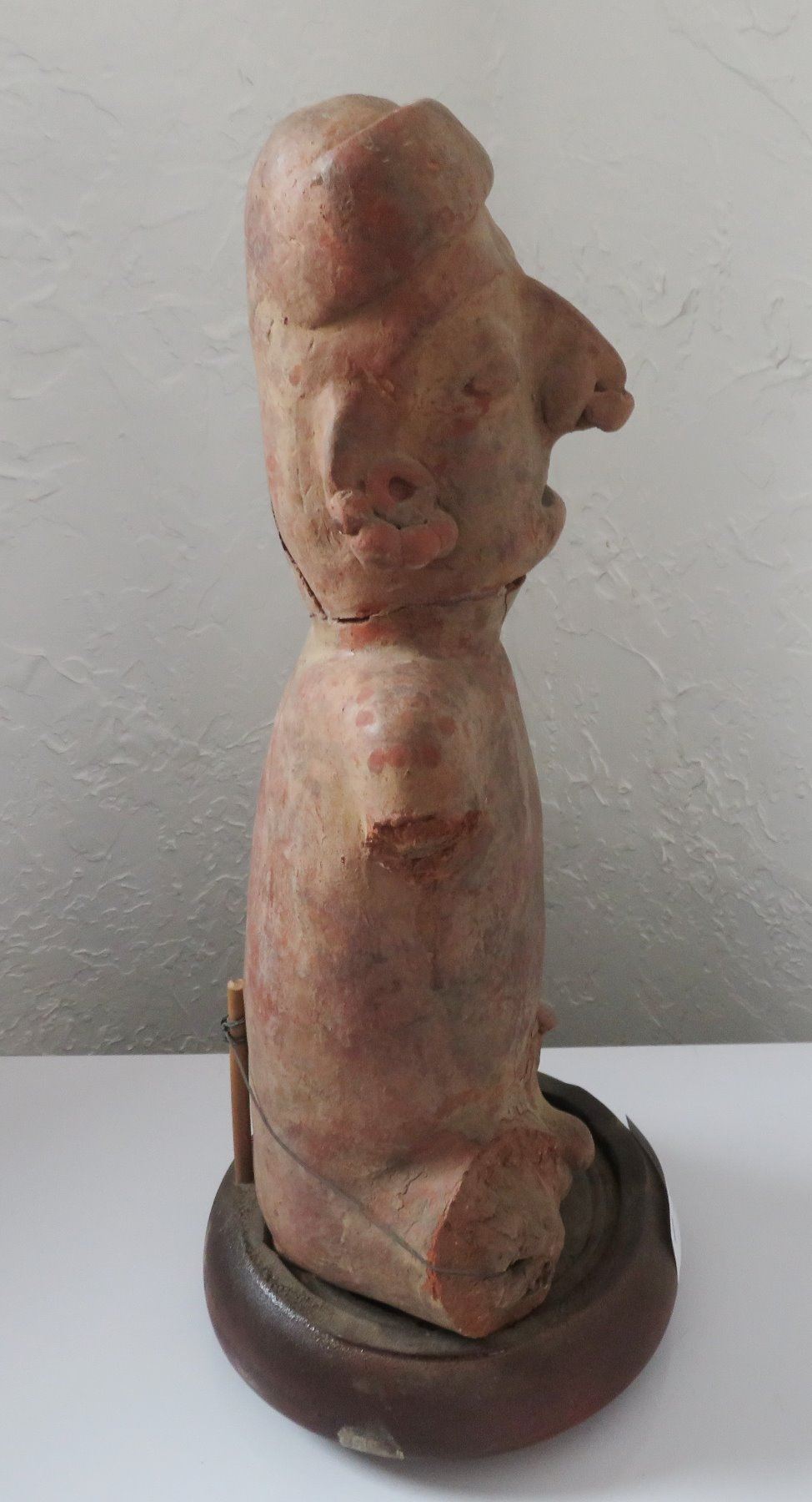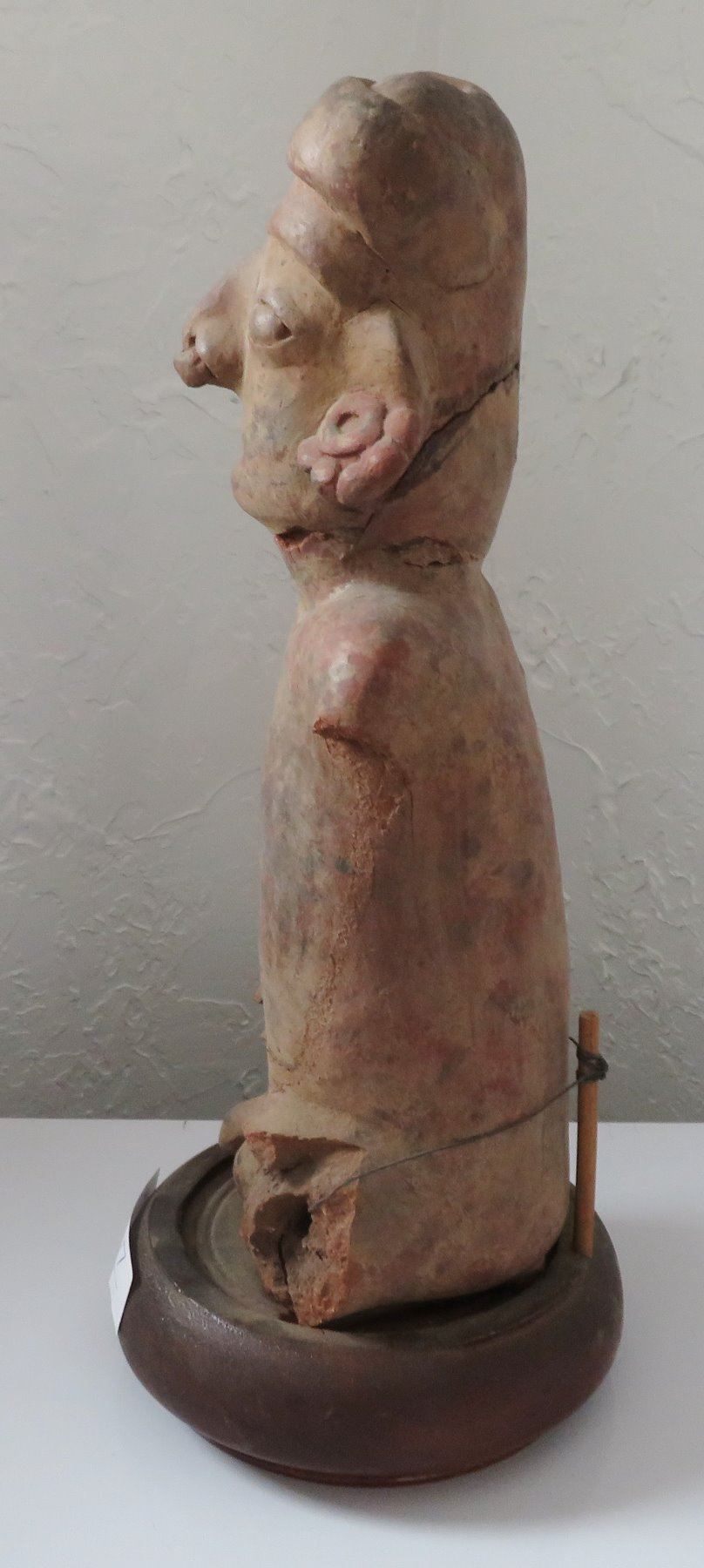 Pre-Columbian Figure, pre-Columbian item. Made of clay and wood stand, the item measures 14" x 6". Jalisco, Mexico. Condition: Missing arms and legs, see images. Shipping: $50.00 w/insurance and signature, due to value.