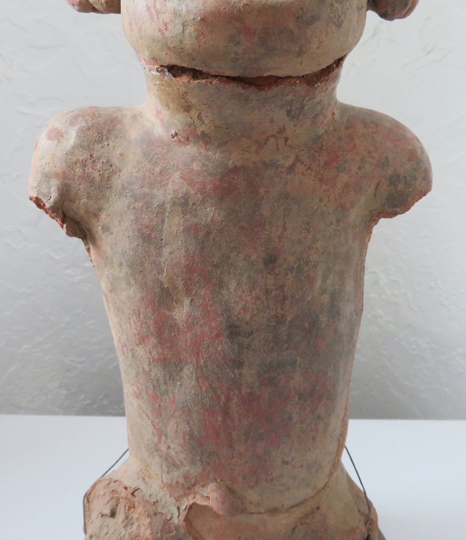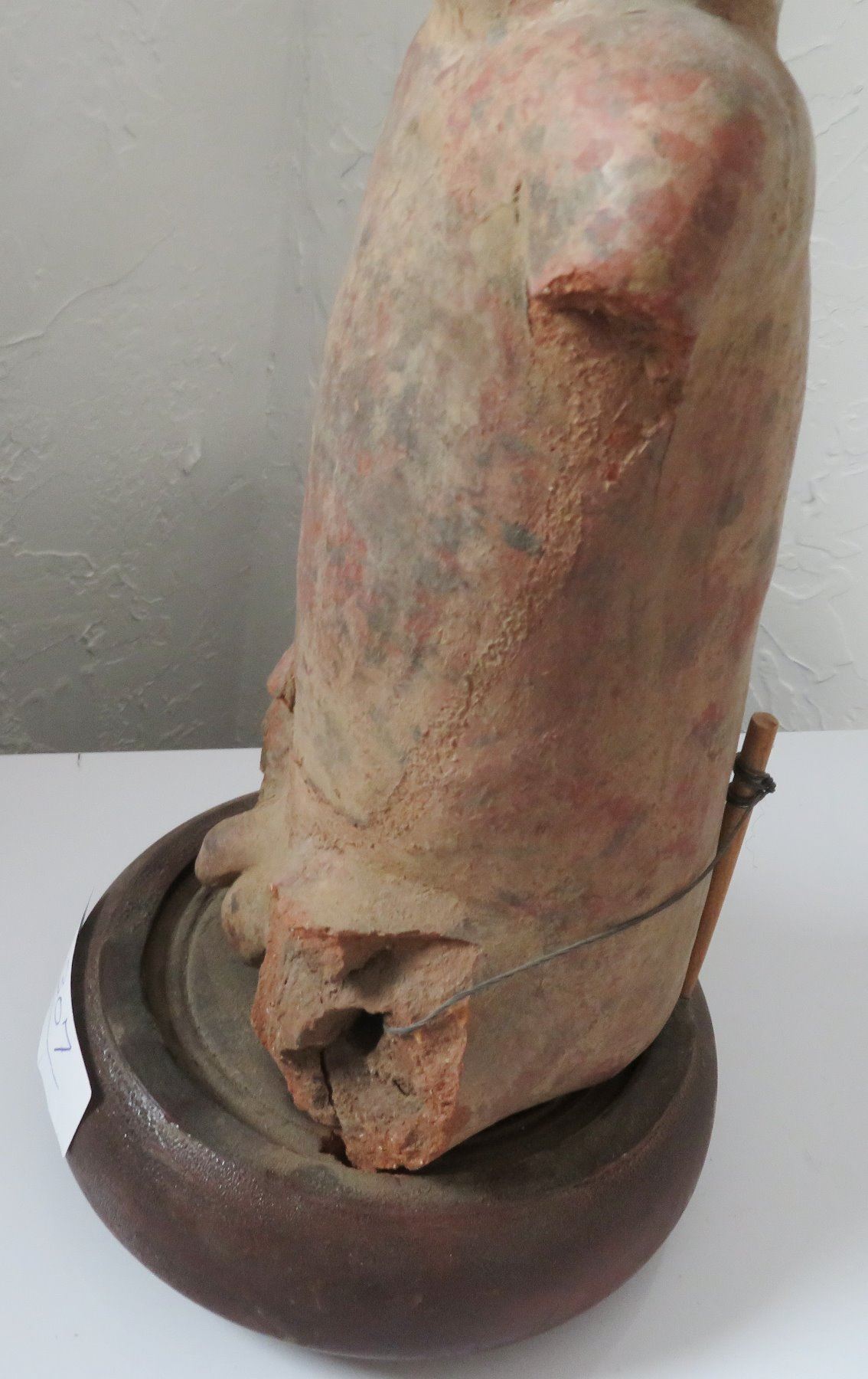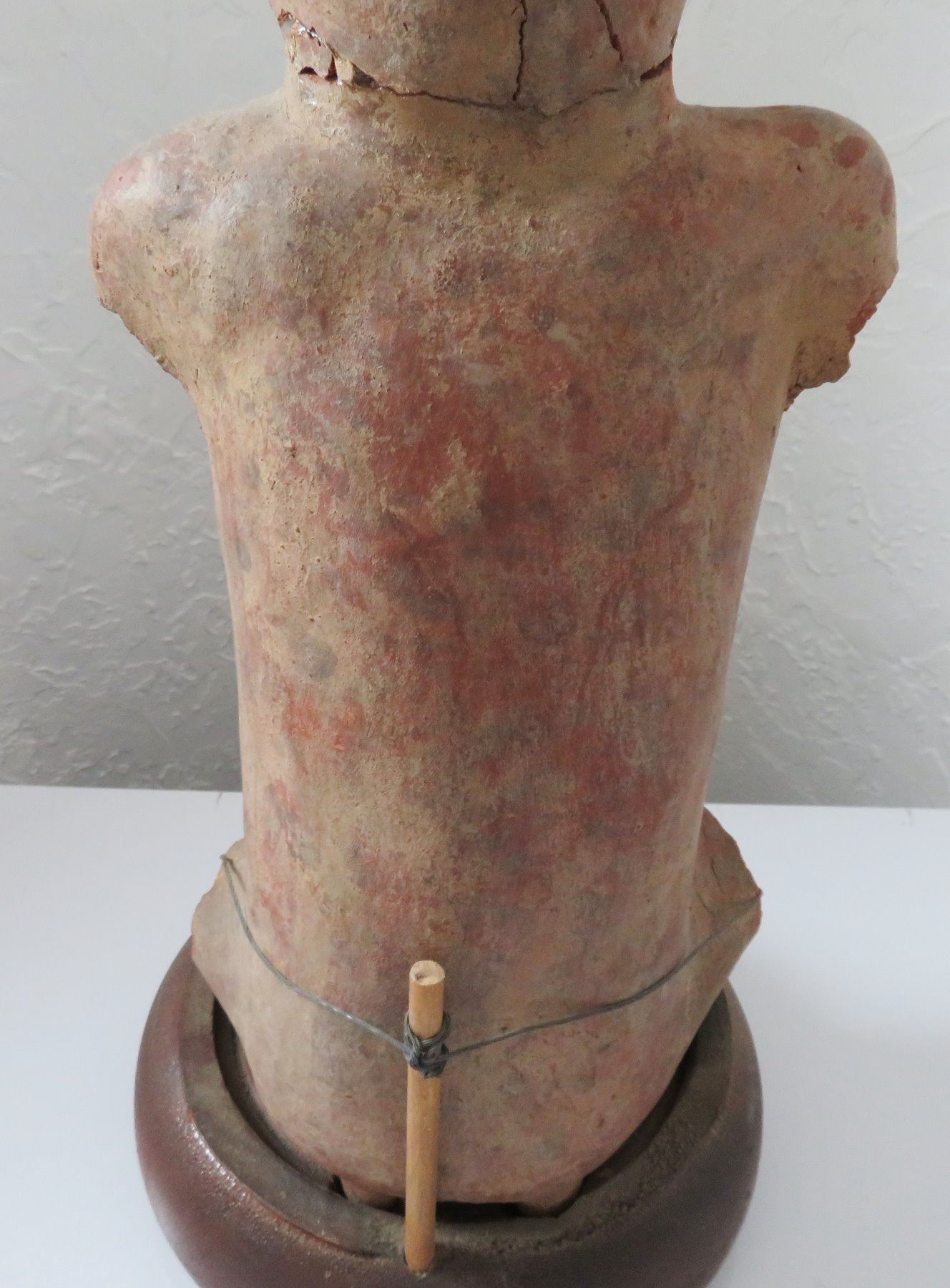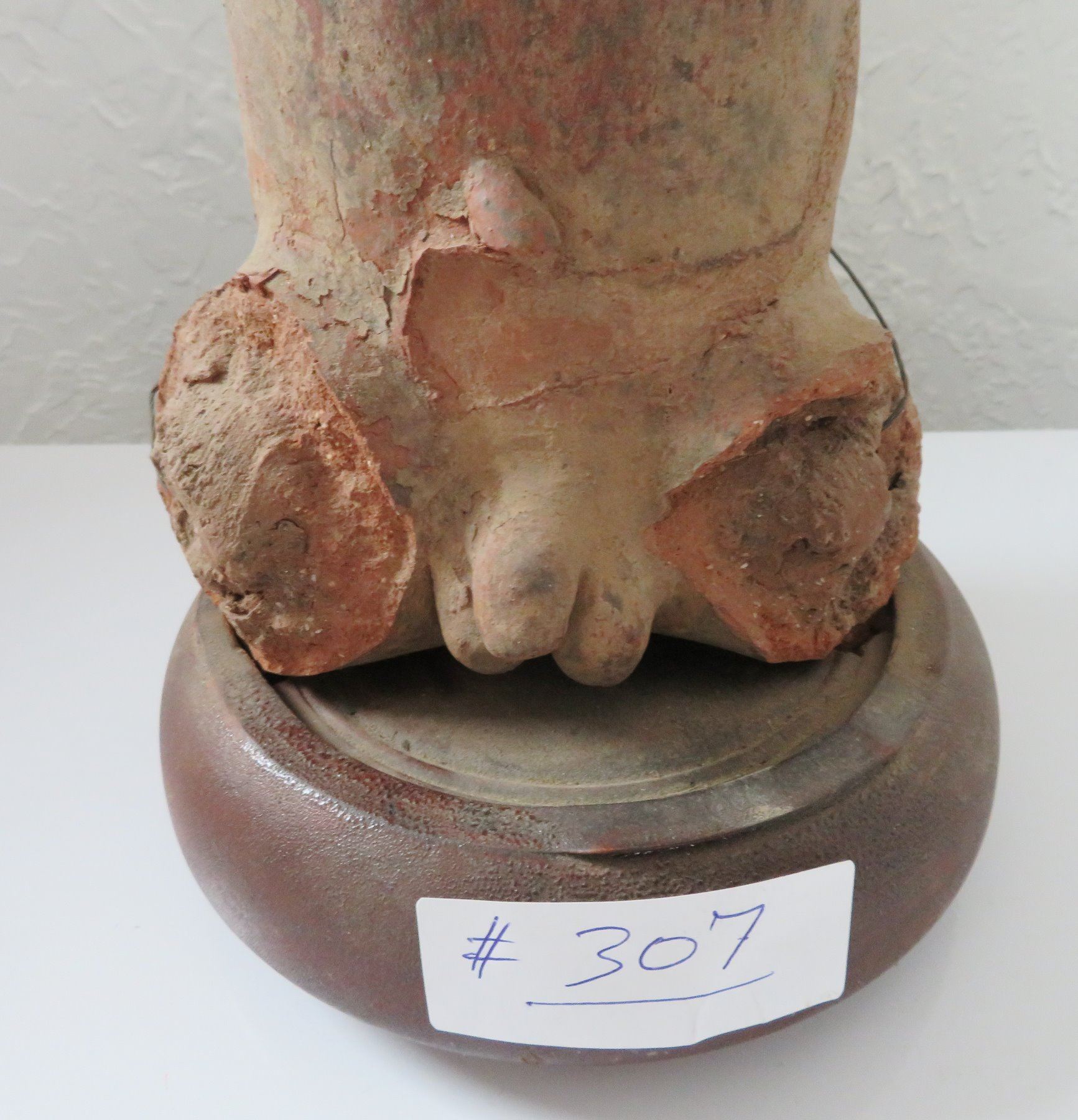 Pre-Columbian Figure, pre-Columbian item. Made of clay and wood stand, the item measures 14" x 6". Jalisco, Mexico. Condition: Missing arms and legs, see images. Shipping: $50.00 w/insurance and signature, due to value.