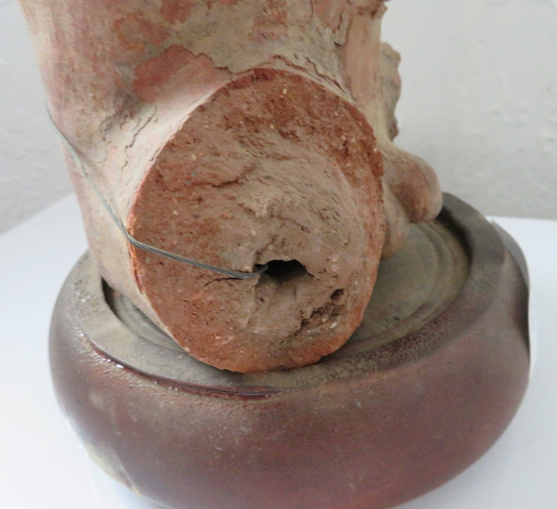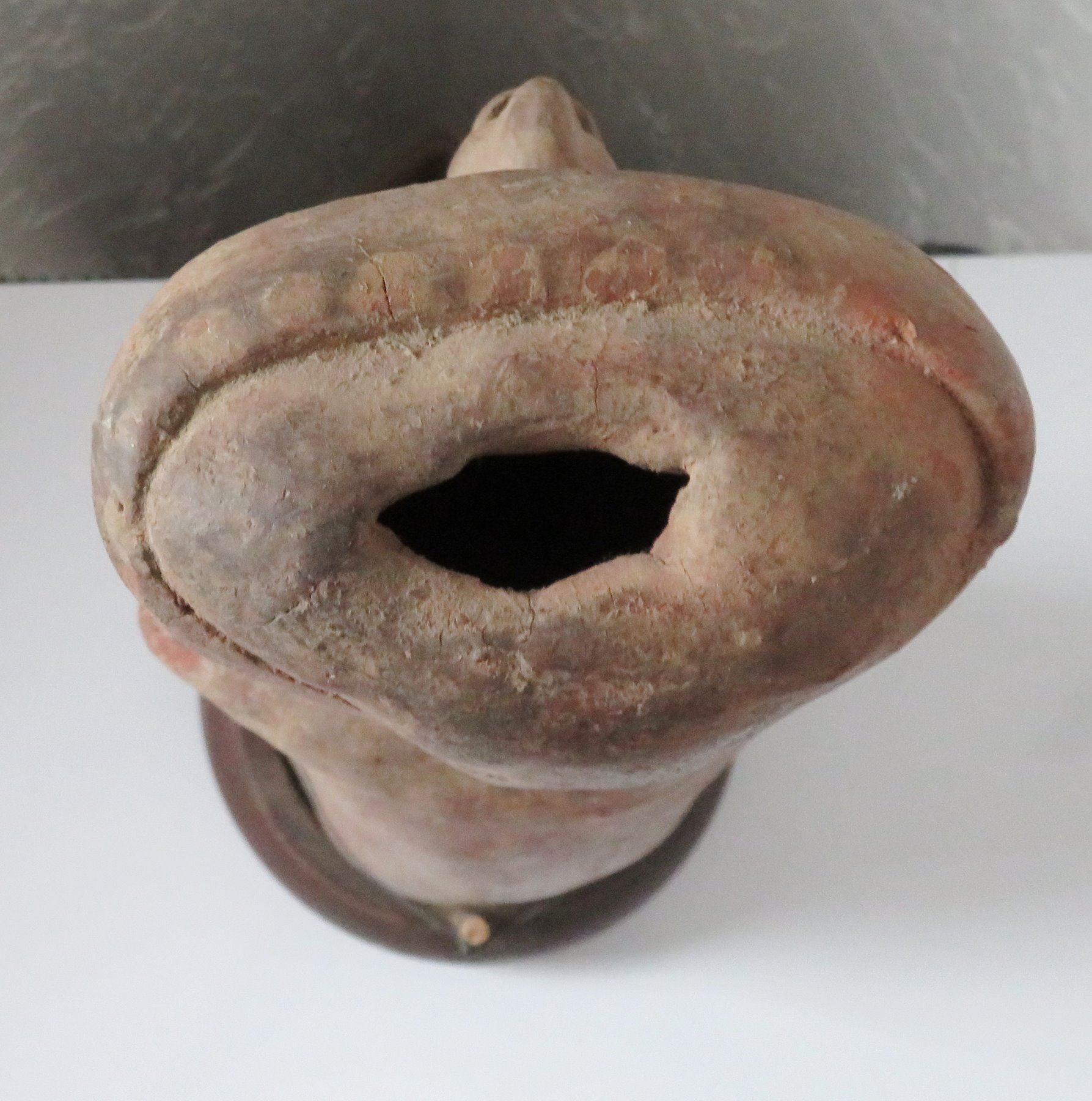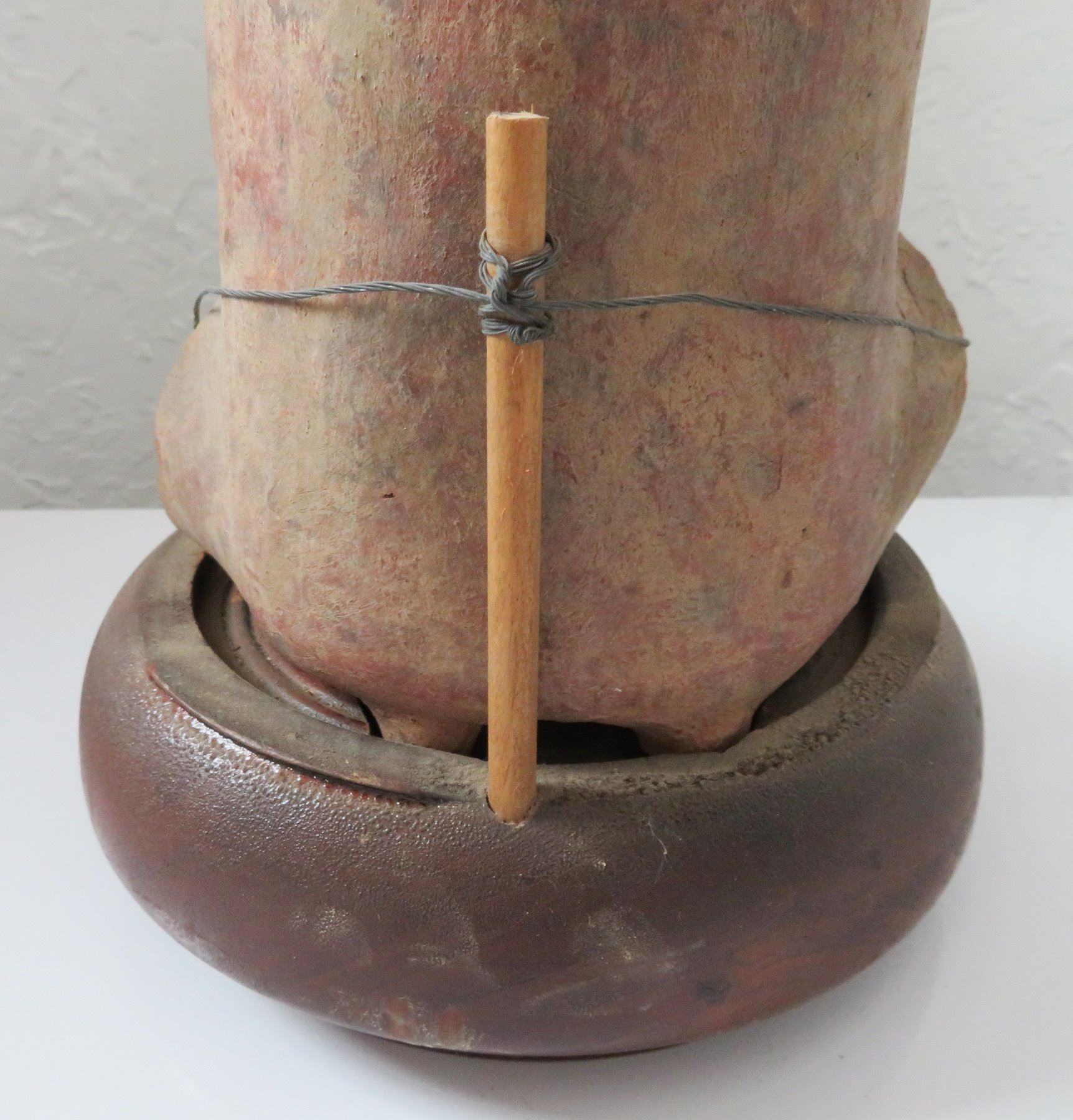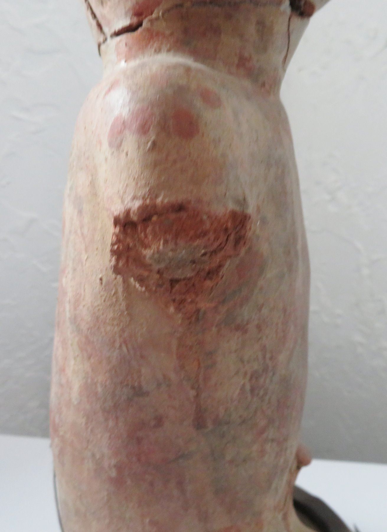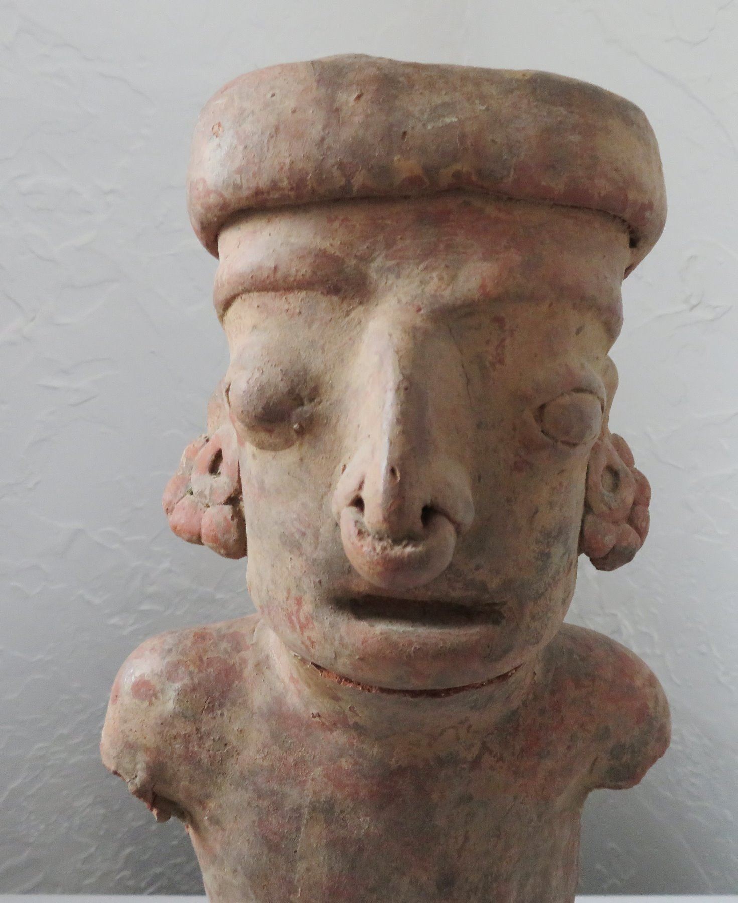 Pre-Columbian Figure, pre-Columbian item. Made of clay and wood stand, the item measures 14" x 6". Jalisco, Mexico. Condition: Missing arms and legs, see images. Shipping: $50.00 w/insurance and signature, due to value.