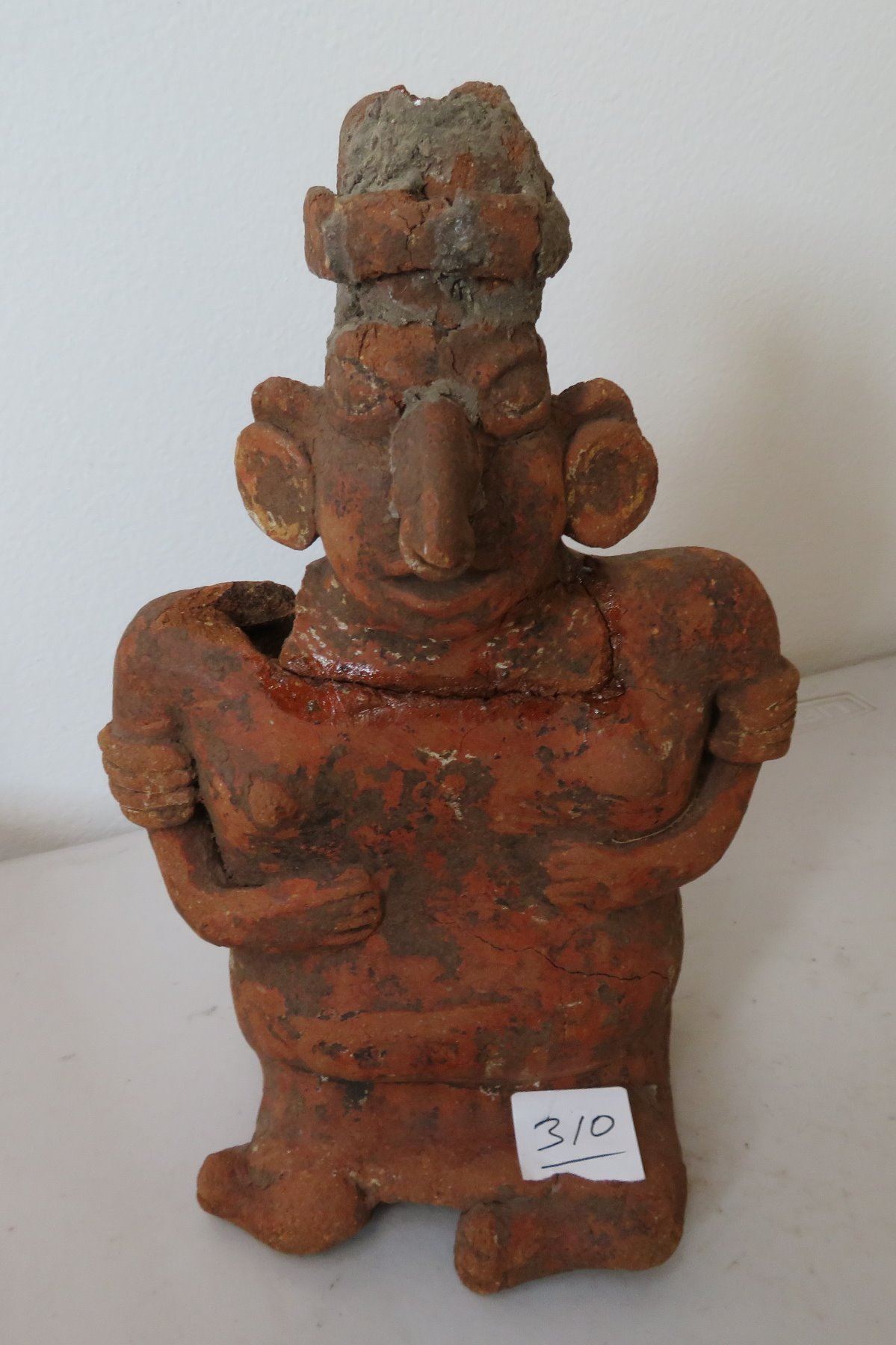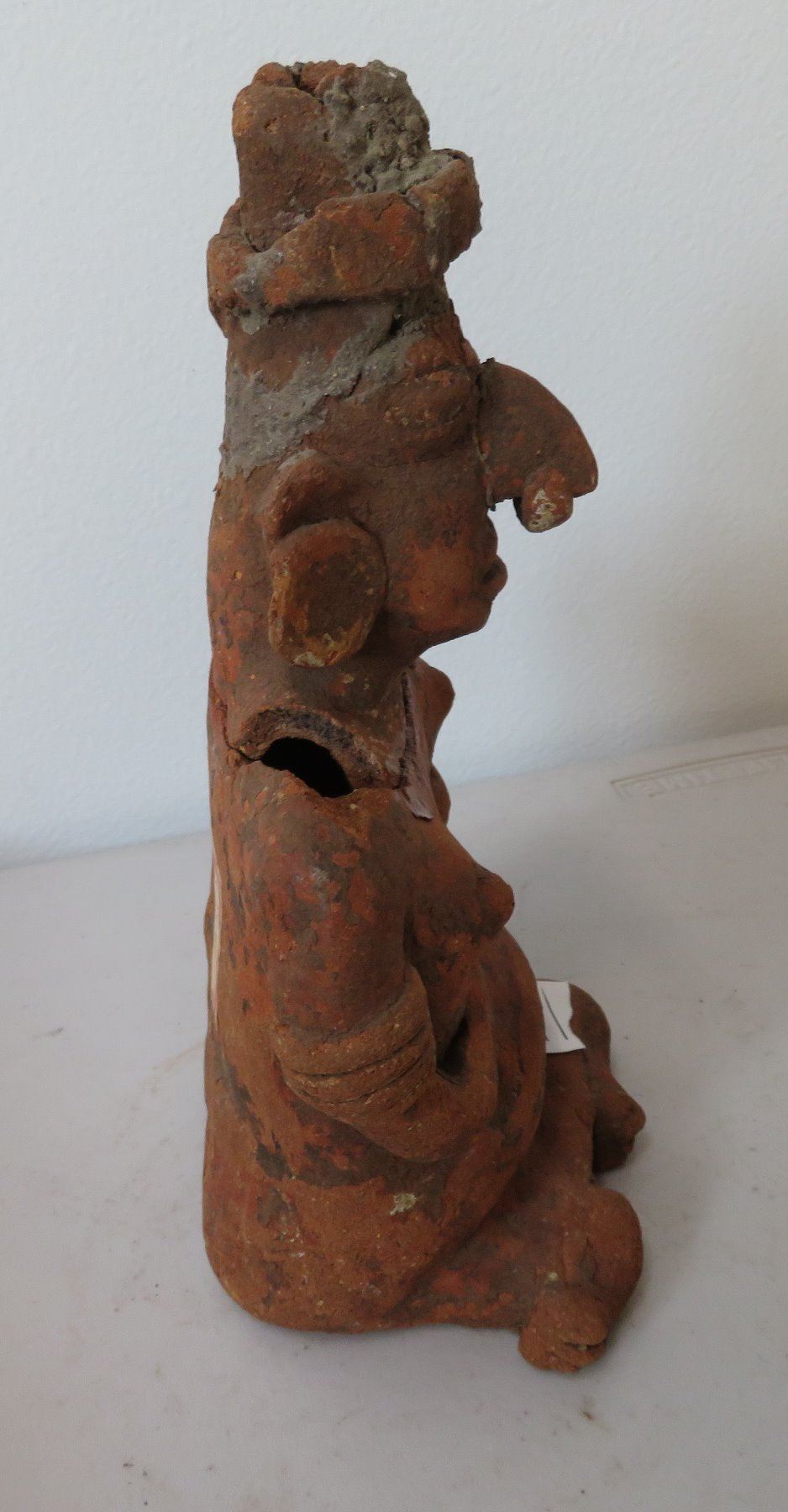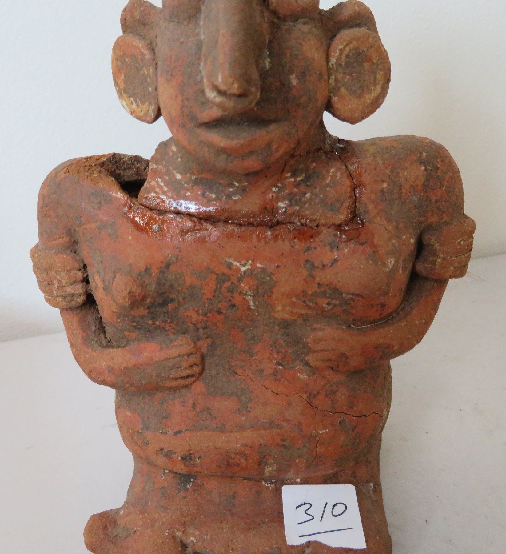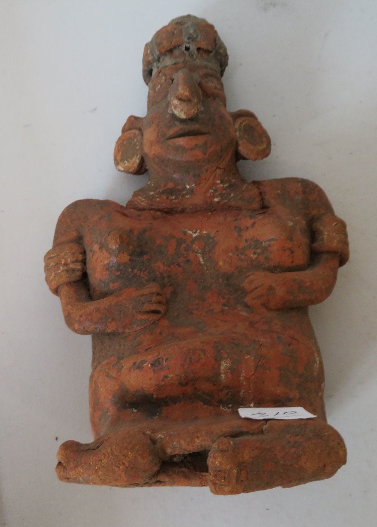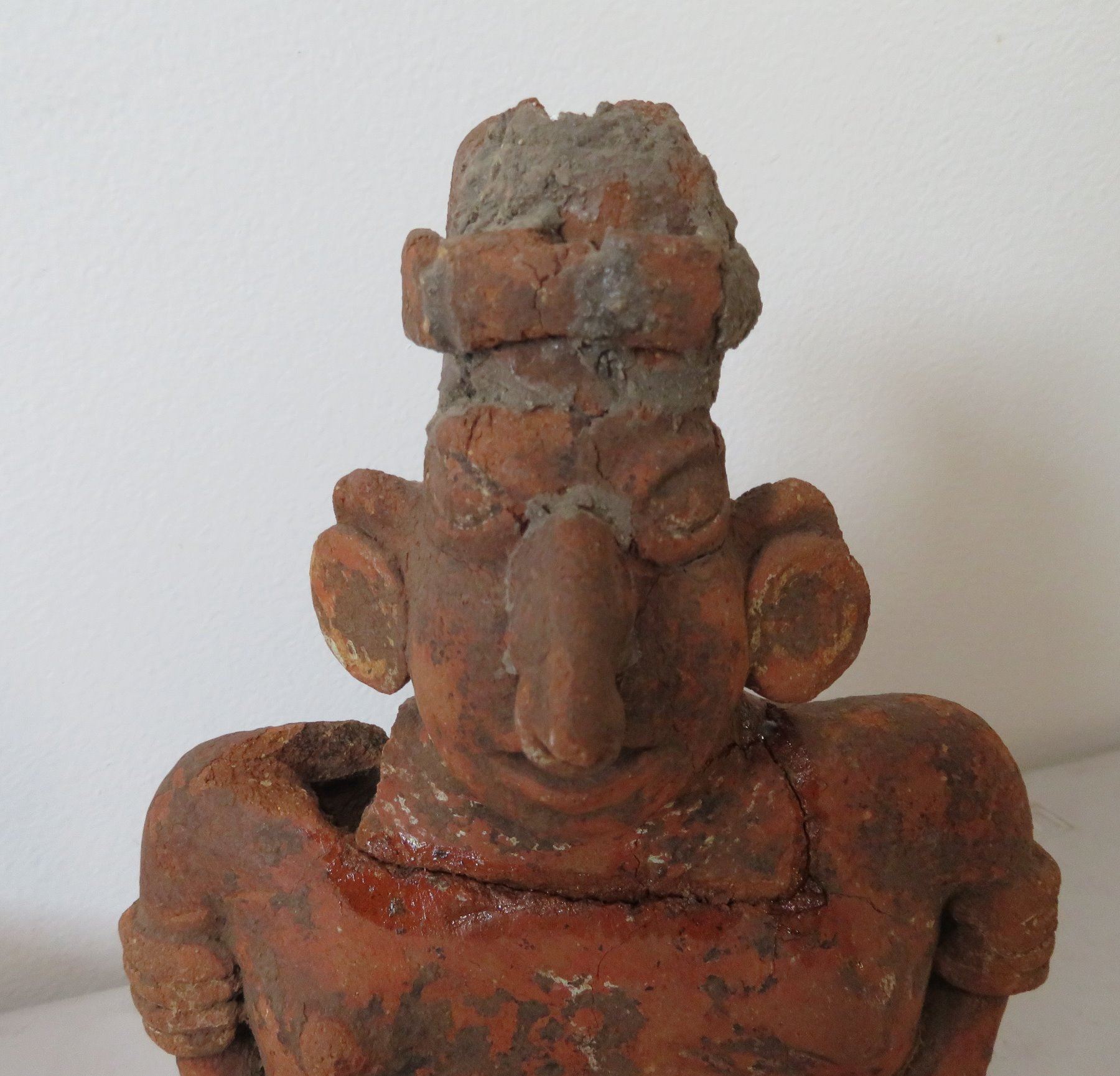 Pre-Columbian Figure, c. 1500 years old. Made of clay and paint, the item measures 8 3/4" x 5 1/2". Jalisco, Mexico. Condition: Broken head, glued, small piece missing, see images. Shipping: $34.50 w/insurance and signature, due to heavy weight and value, double-boxed.