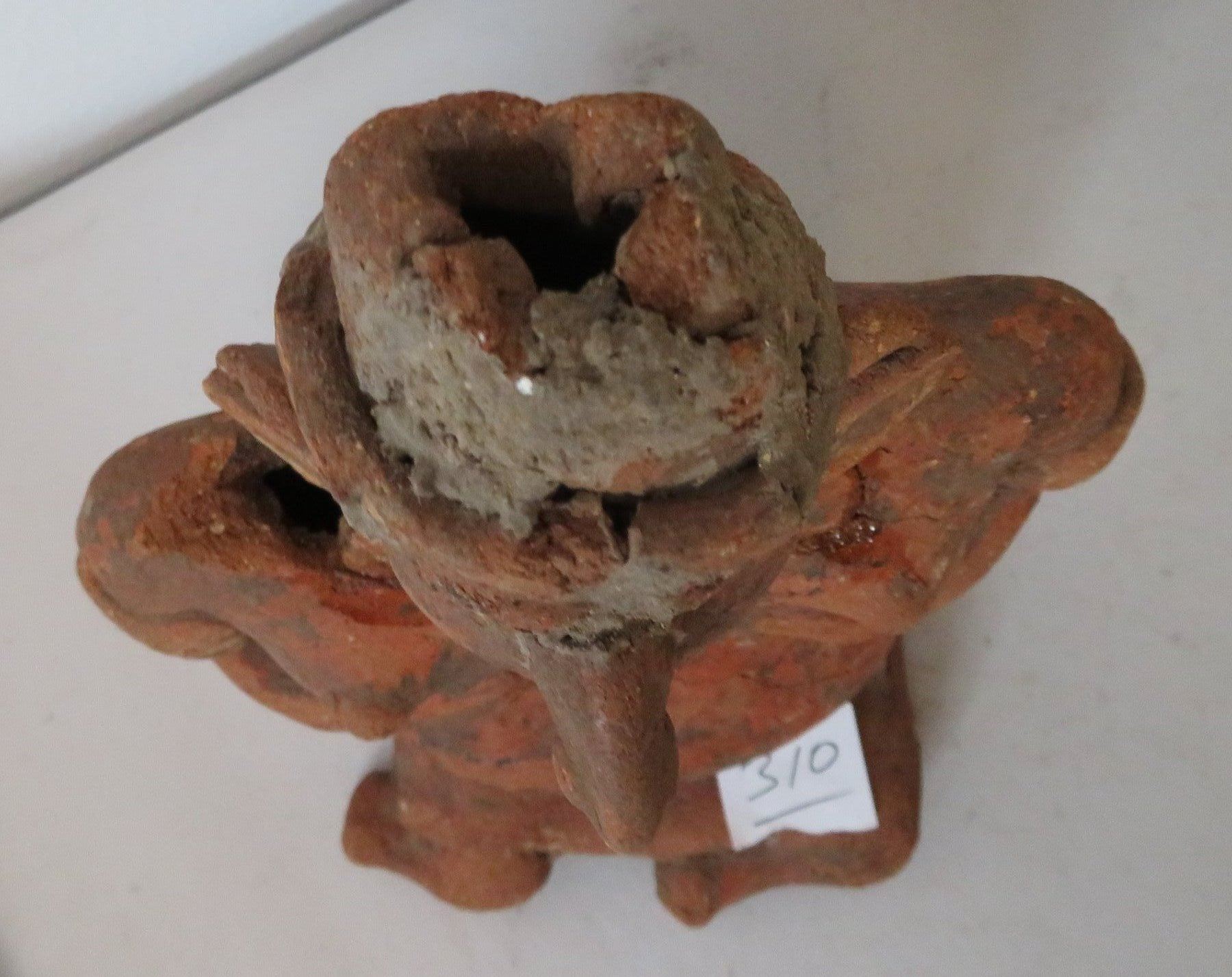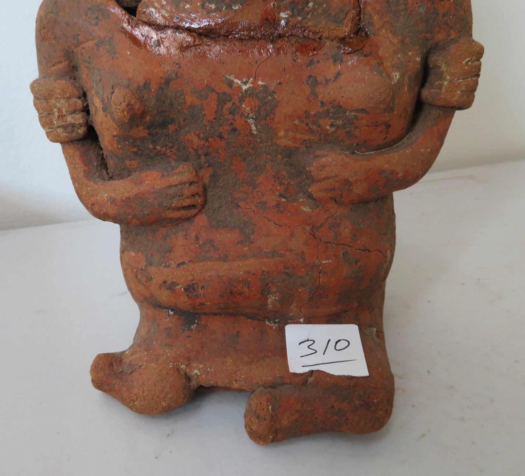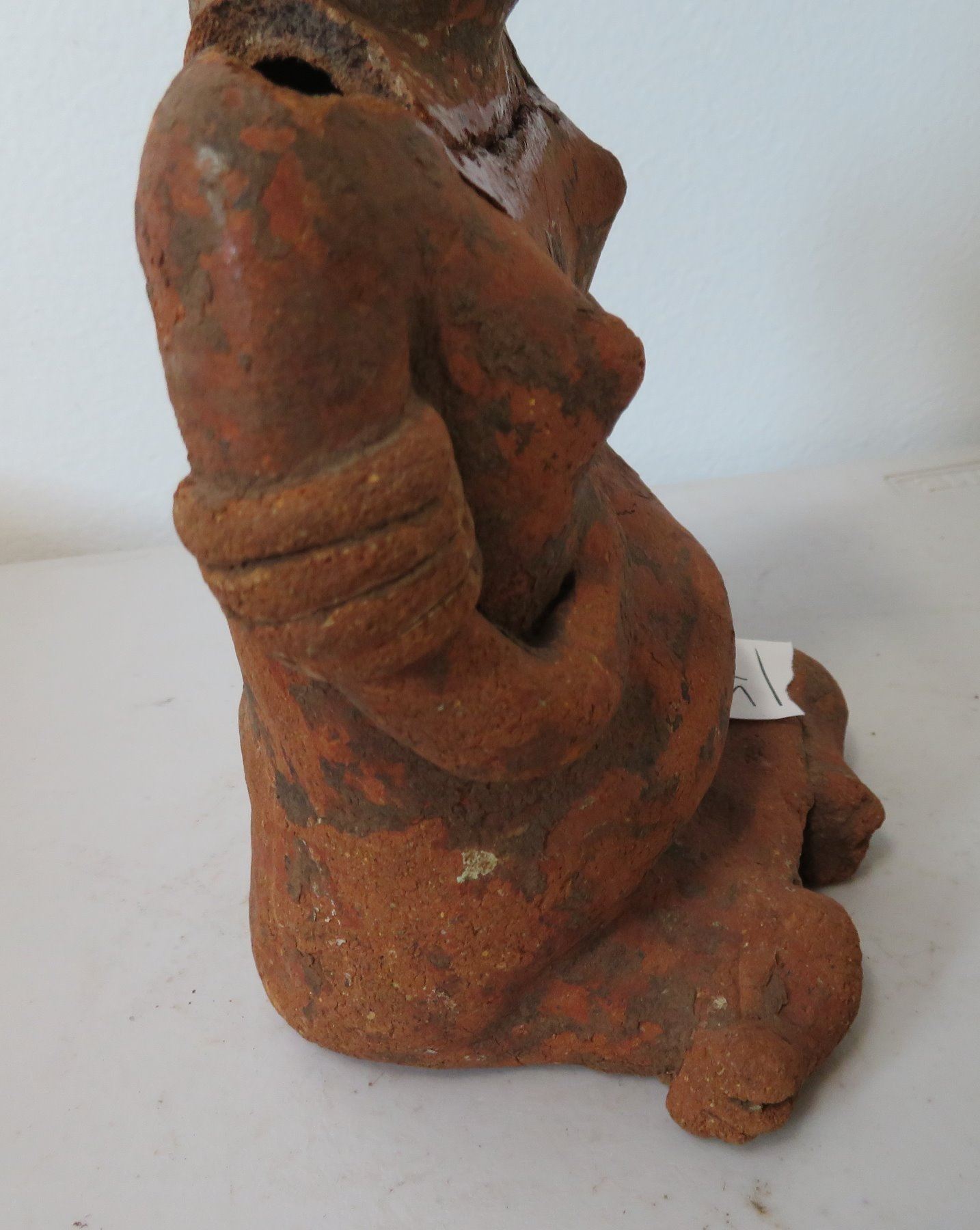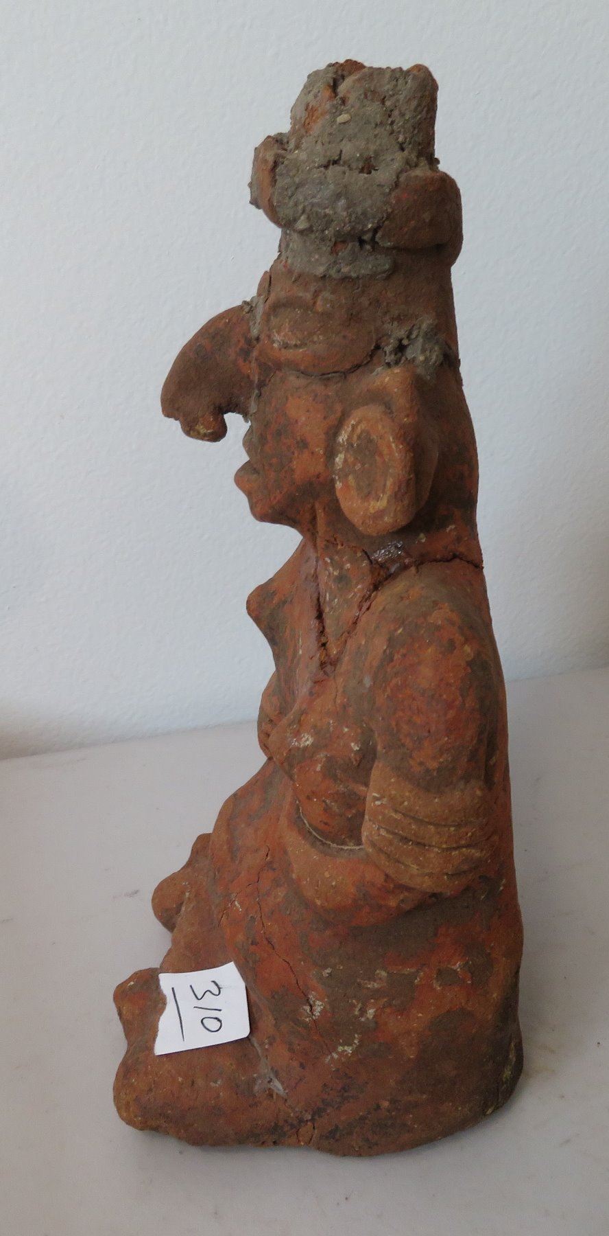 Pre-Columbian Figure, c. 1500 years old. Made of clay and paint, the item measures 8 3/4" x 5 1/2". Jalisco, Mexico. Condition: Broken head, glued, small piece missing, see images. Shipping: $34.50 w/insurance and signature, due to heavy weight and value, double-boxed.
