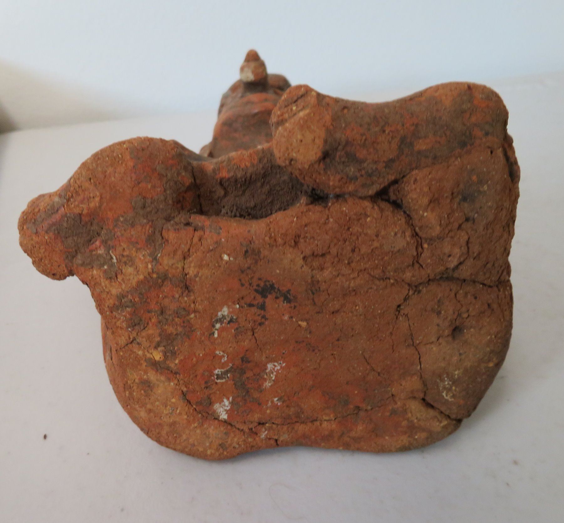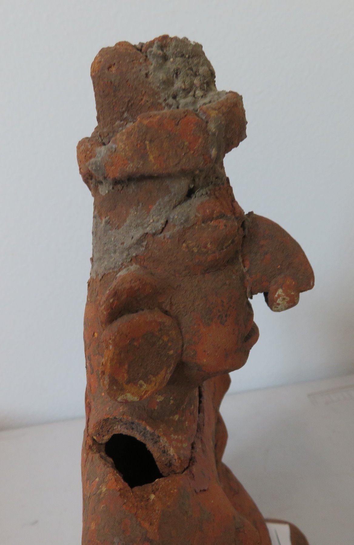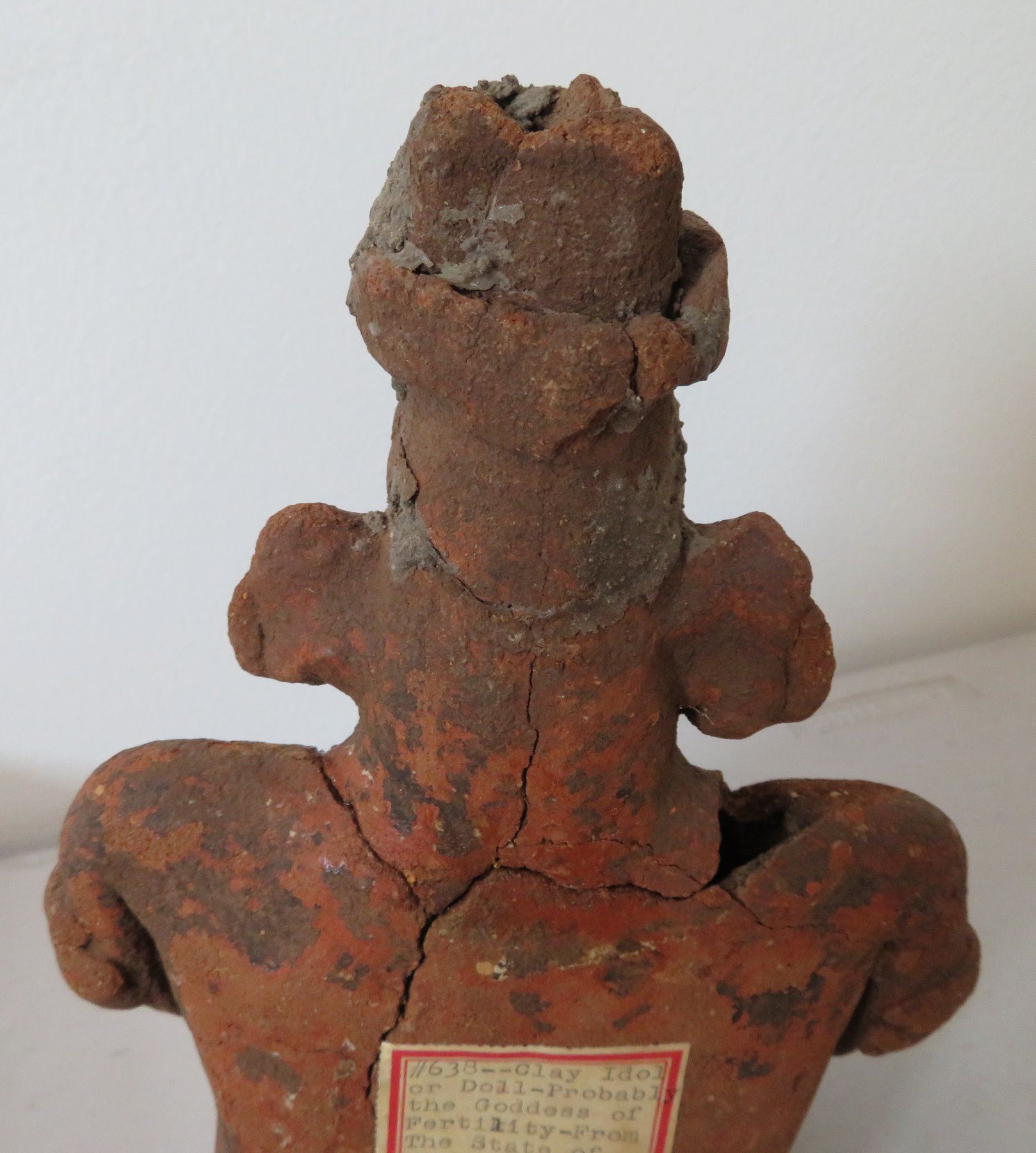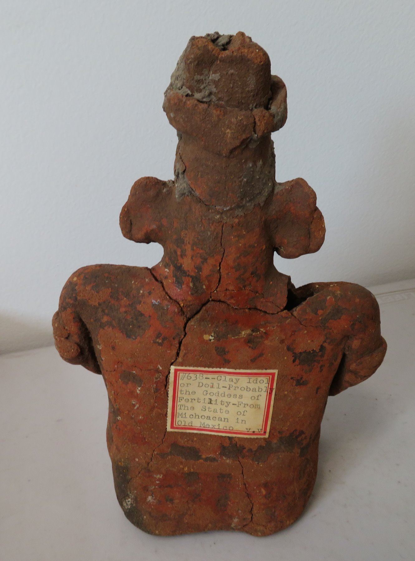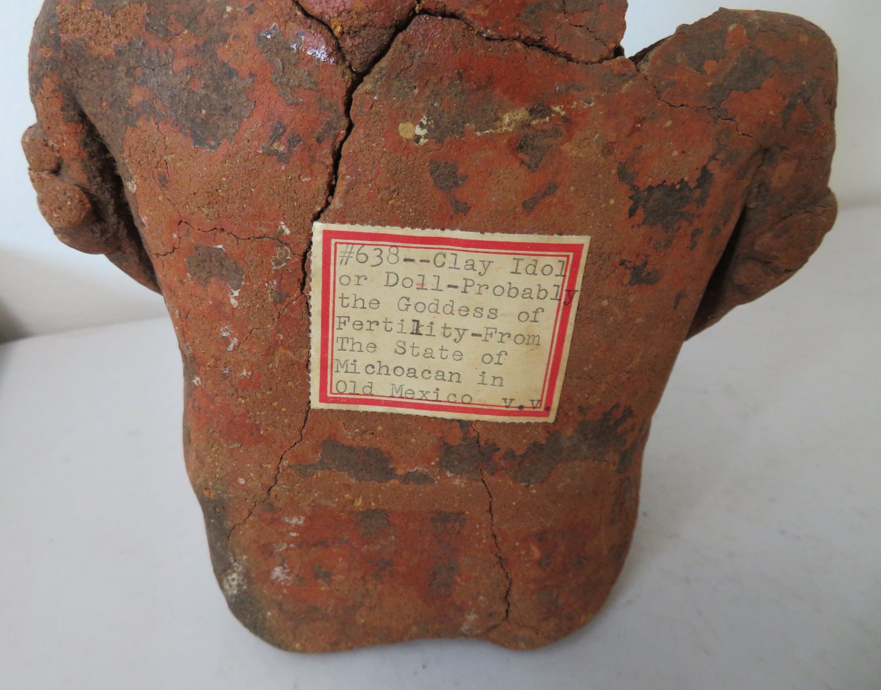 Pre-Columbian Figure, c. 1500 years old. Made of clay and paint, the item measures 8 3/4" x 5 1/2". Jalisco, Mexico. Condition: Broken head, glued, small piece missing, see images. Shipping: $34.50 w/insurance and signature, due to heavy weight and value, double-boxed.