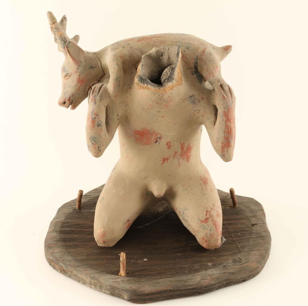 Figure has animal on back,, clay construction, missing its head on a wood base with a glass dome. Unknown age.