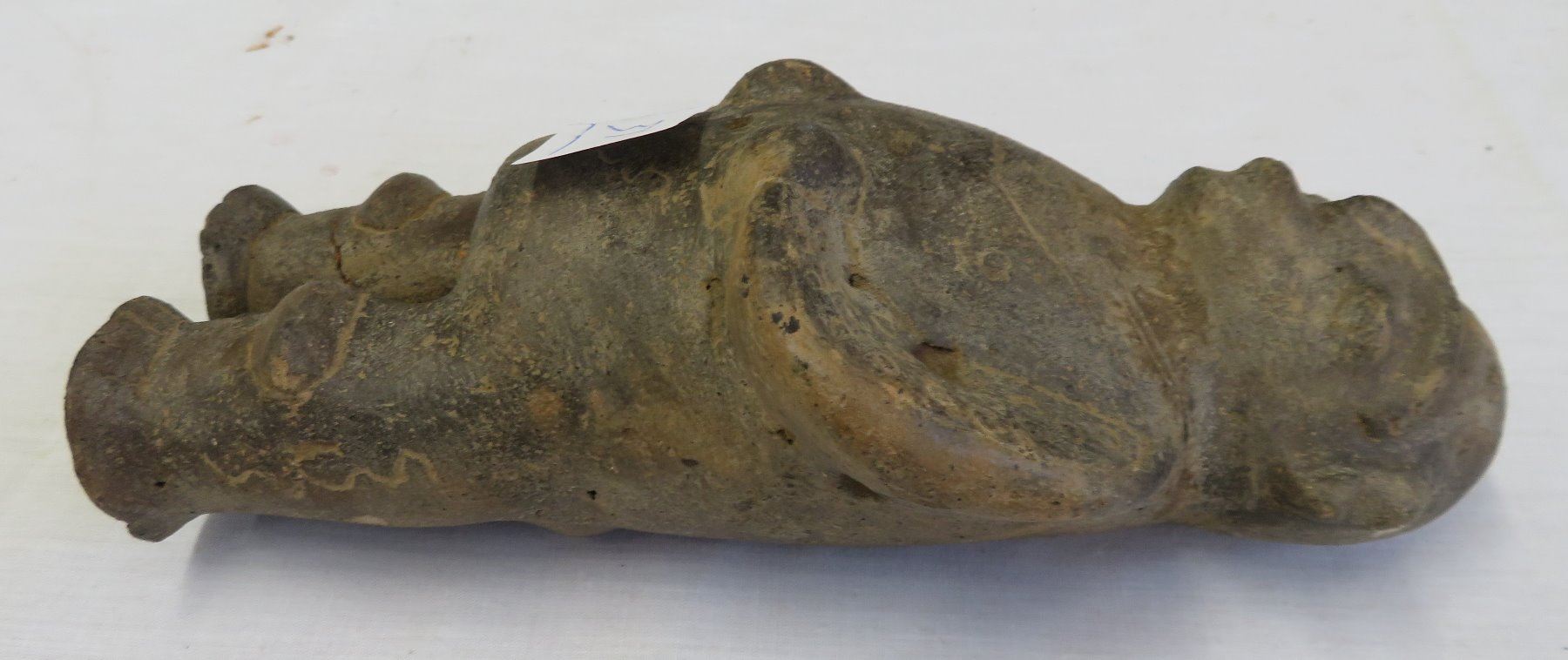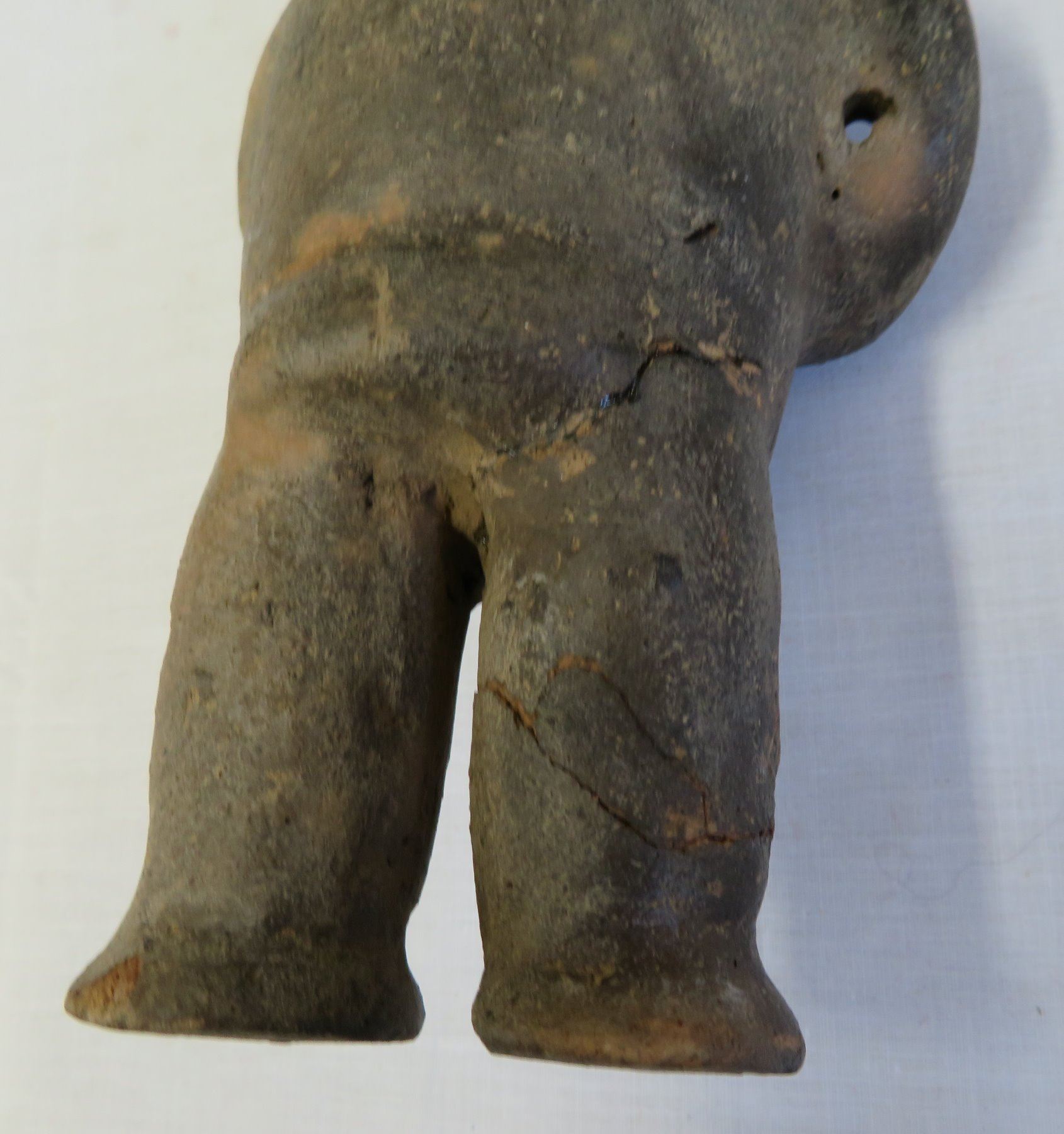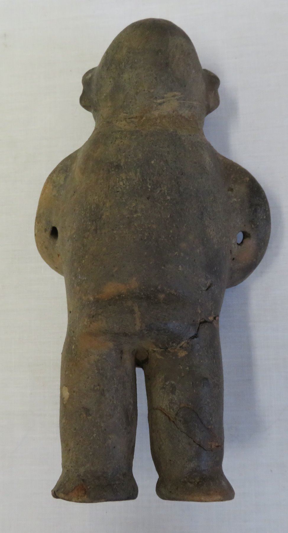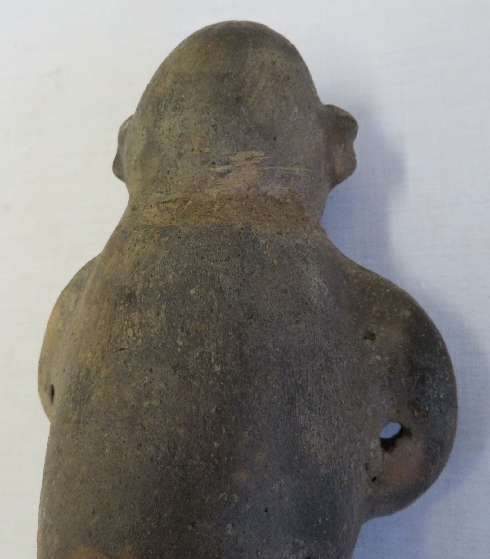 Pre-Columbian Human Figure, pre-Columbian item. Made of clay, the item measures 8 1/2" x 4 1/2" x 3". Nayarit, Mexico. Condition: Leg broken and reattached, see images. Shipping: $26.50 w/insurance and signature, double-boxed, due to value.