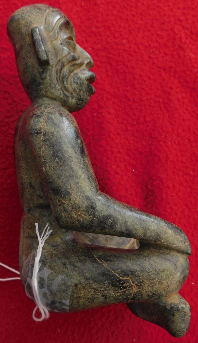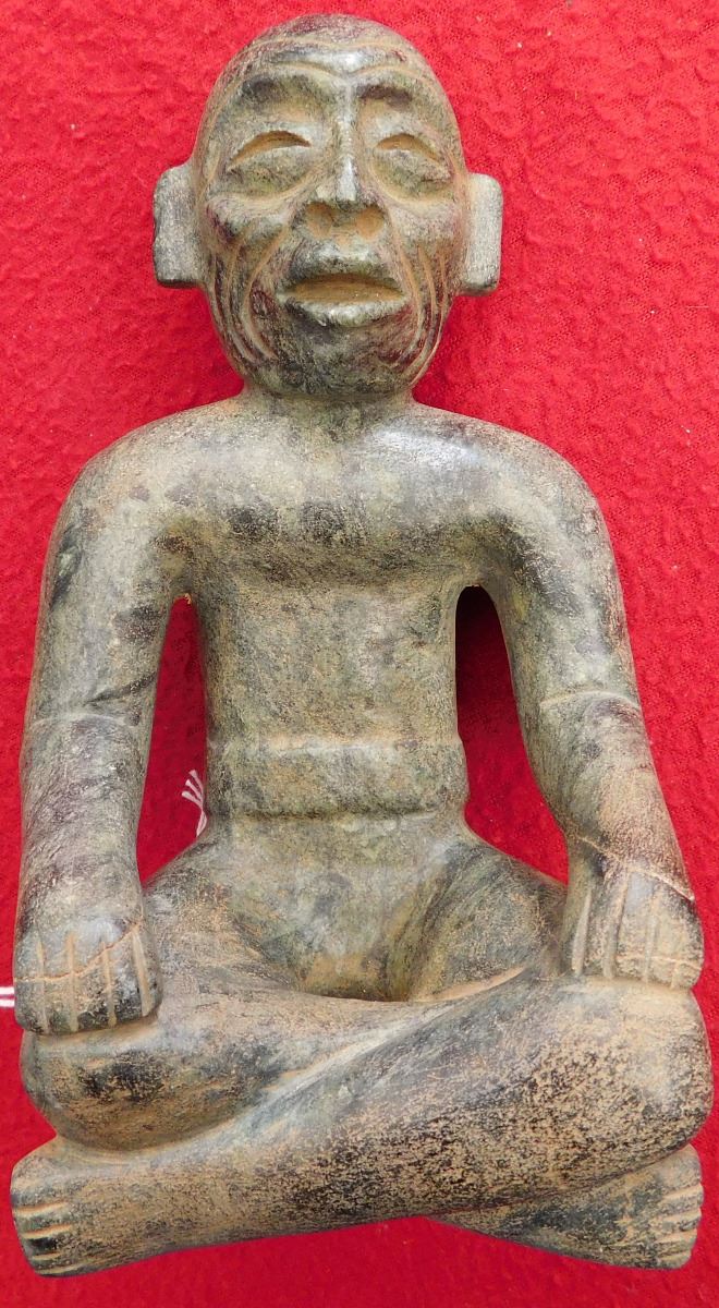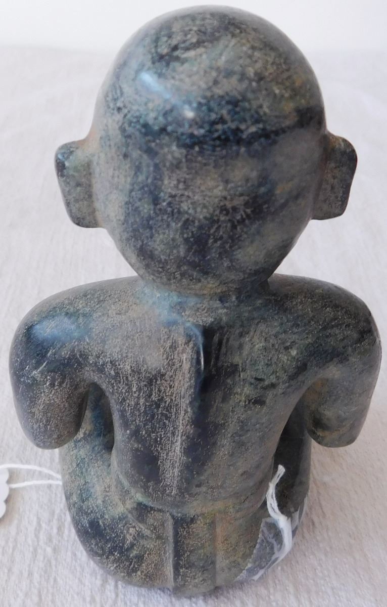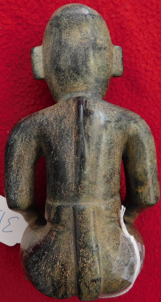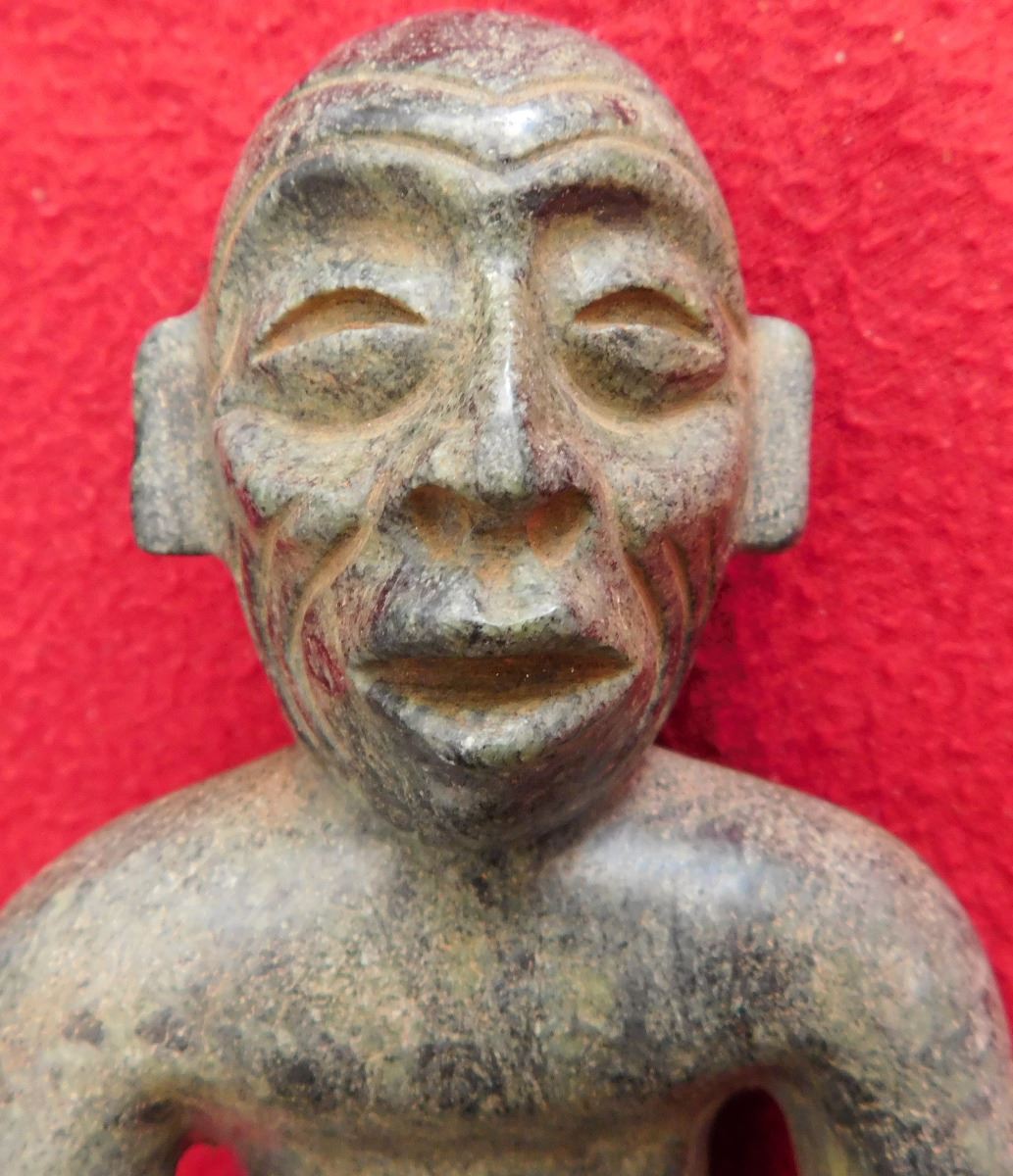 Pre-Columbian Jadeite Seated Figure, circa 1000 years old. Made of jadeite, this pre-columbian figure is 6.25" x 3" x 3". Possibly Mixtec, from Oaxaca, Mexico. Extensive carving on the seated figure with legs crossed. Nice color! From an old, 1960s California collection. Condition: Has been overcleaned to reveal ancient polish, some natural patina remaining, see images. Shipping: $25.50 w/insurance and signature.