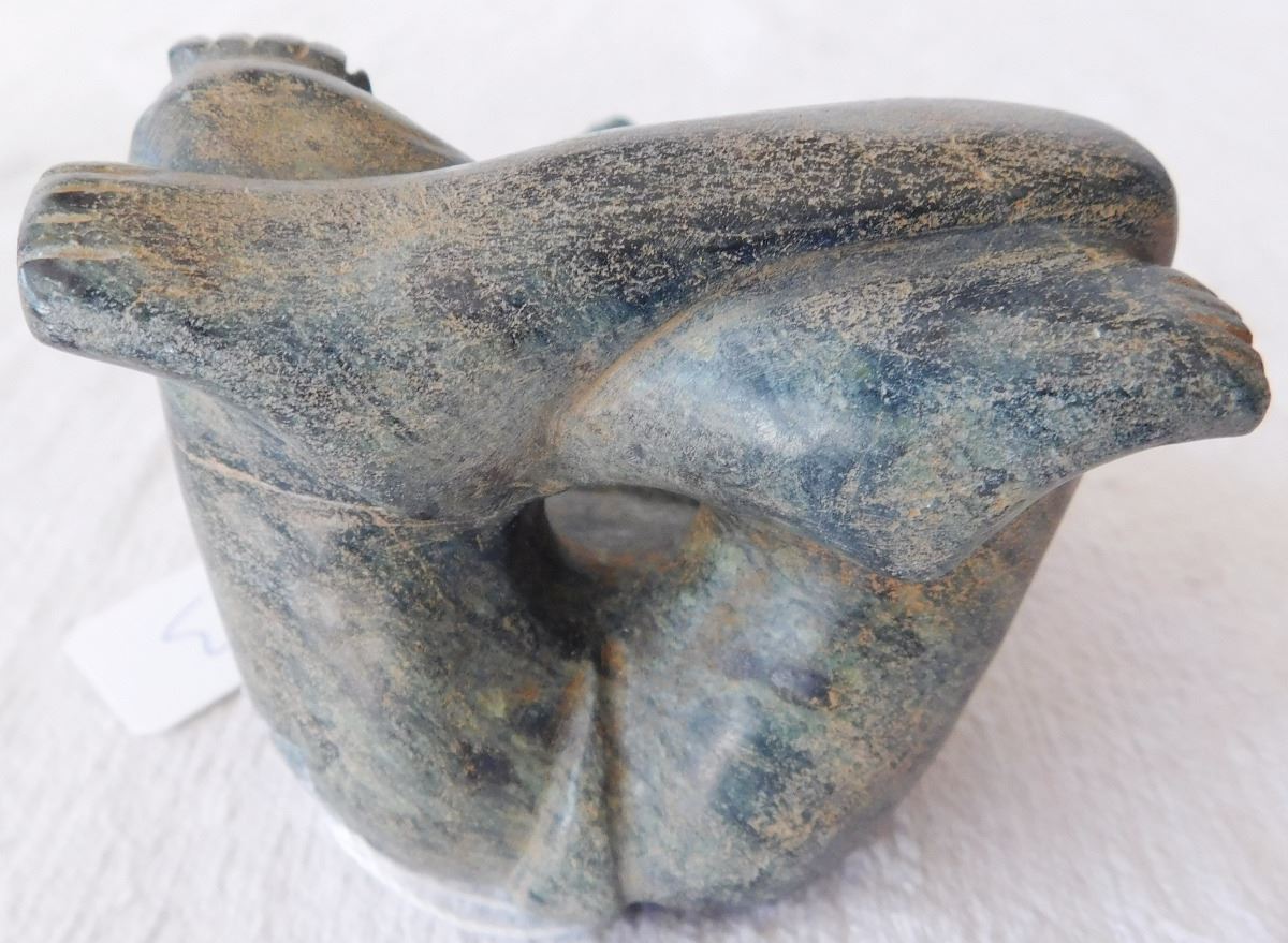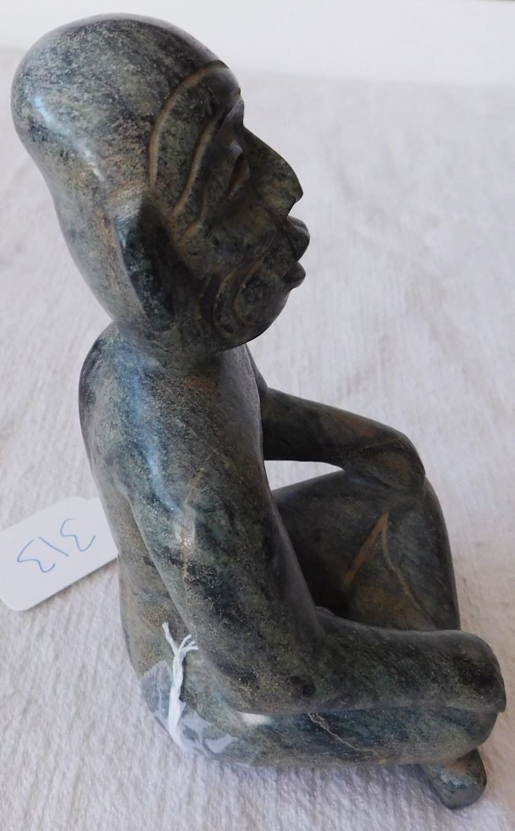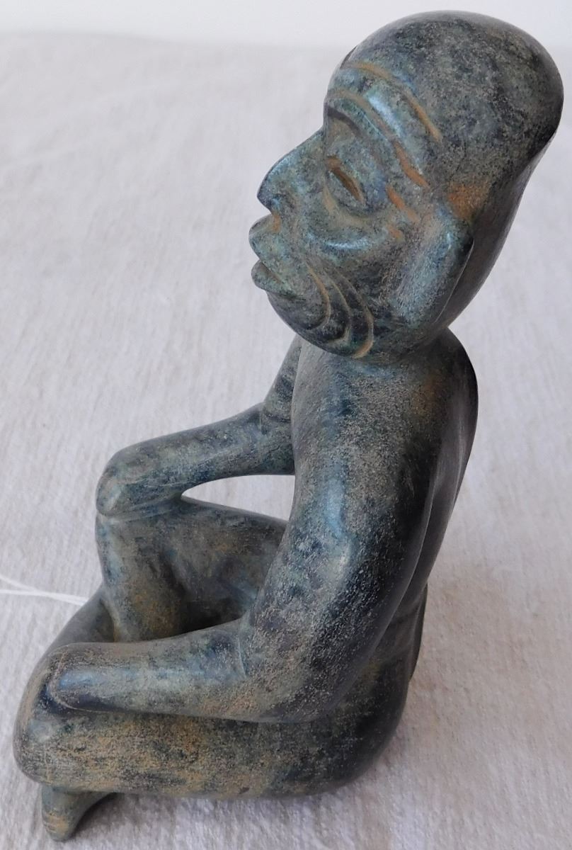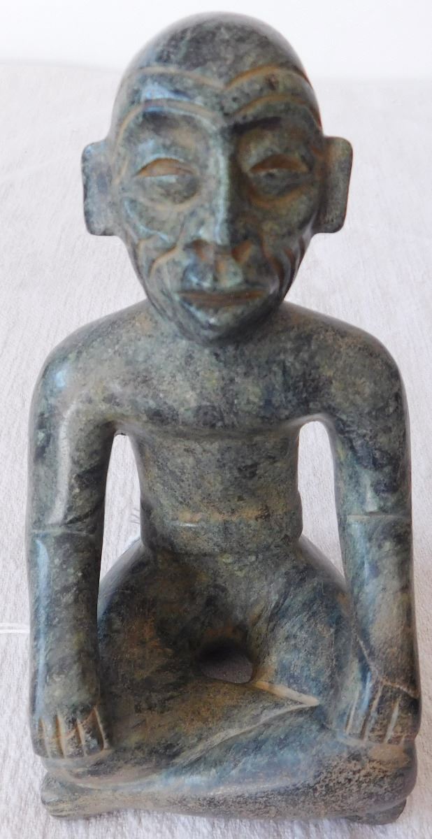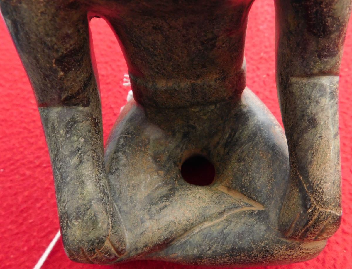 Pre-Columbian Jadeite Seated Figure, circa 1000 years old. Made of jadeite, this pre-columbian figure is 6.25" x 3" x 3". Possibly Mixtec, from Oaxaca, Mexico. Extensive carving on the seated figure with legs crossed. Nice color! From an old, 1960s California collection. Condition: Has been overcleaned to reveal ancient polish, some natural patina remaining, see images. Shipping: $25.50 w/insurance and signature.