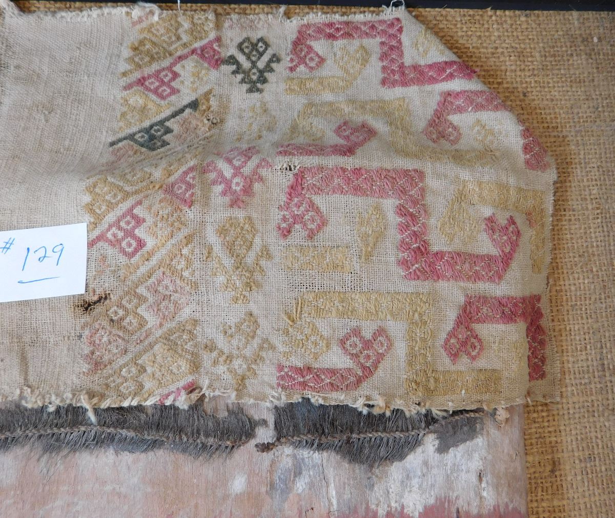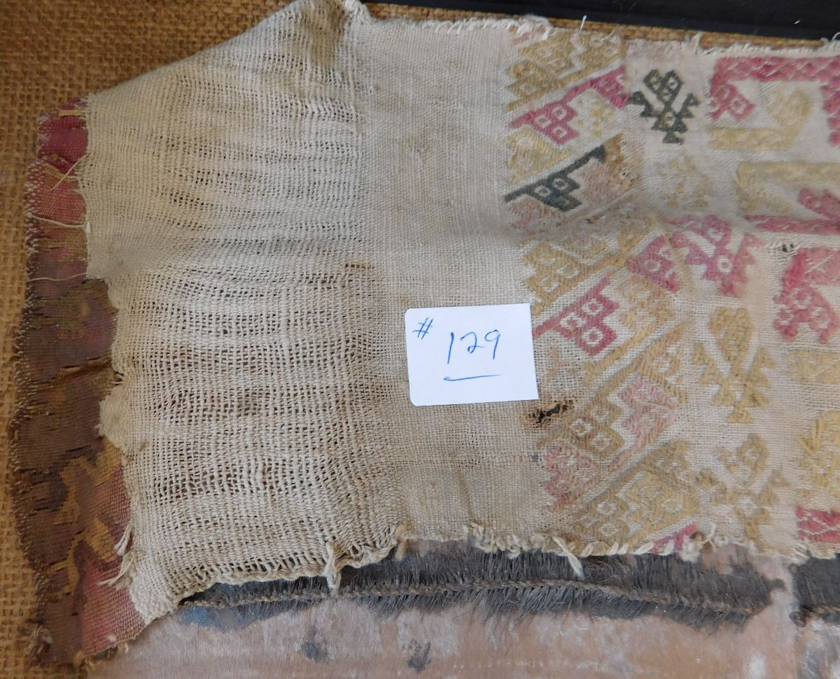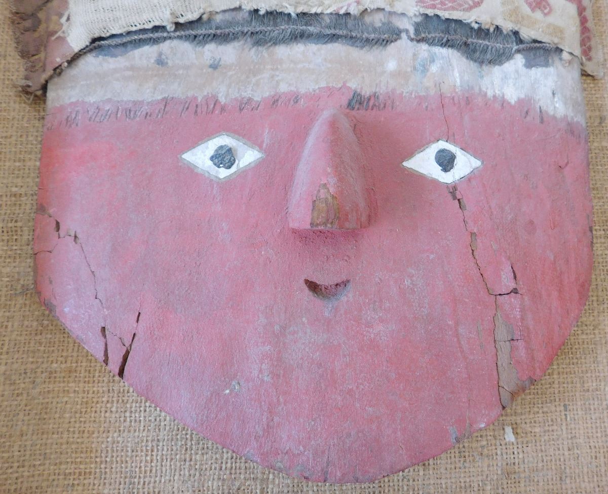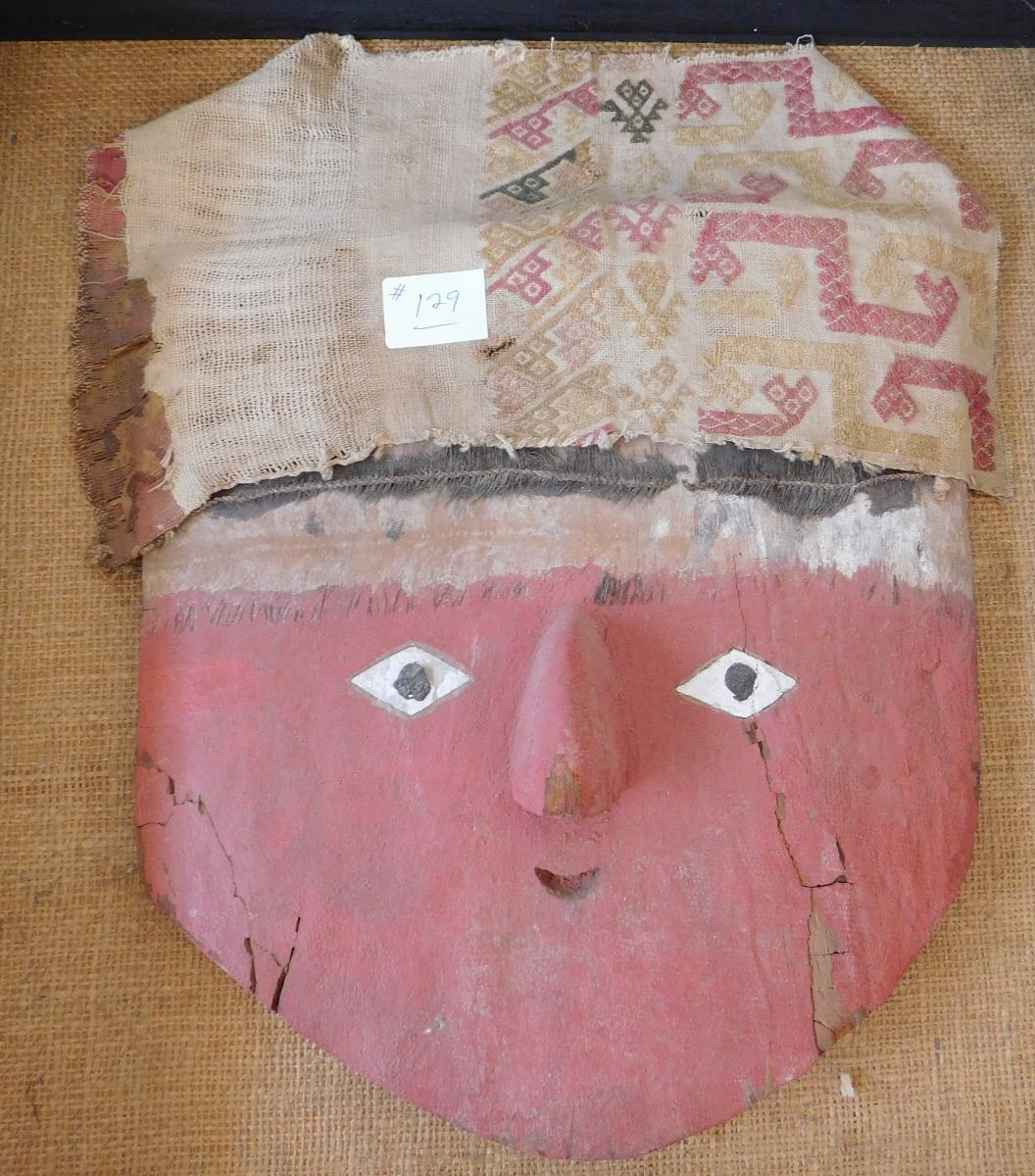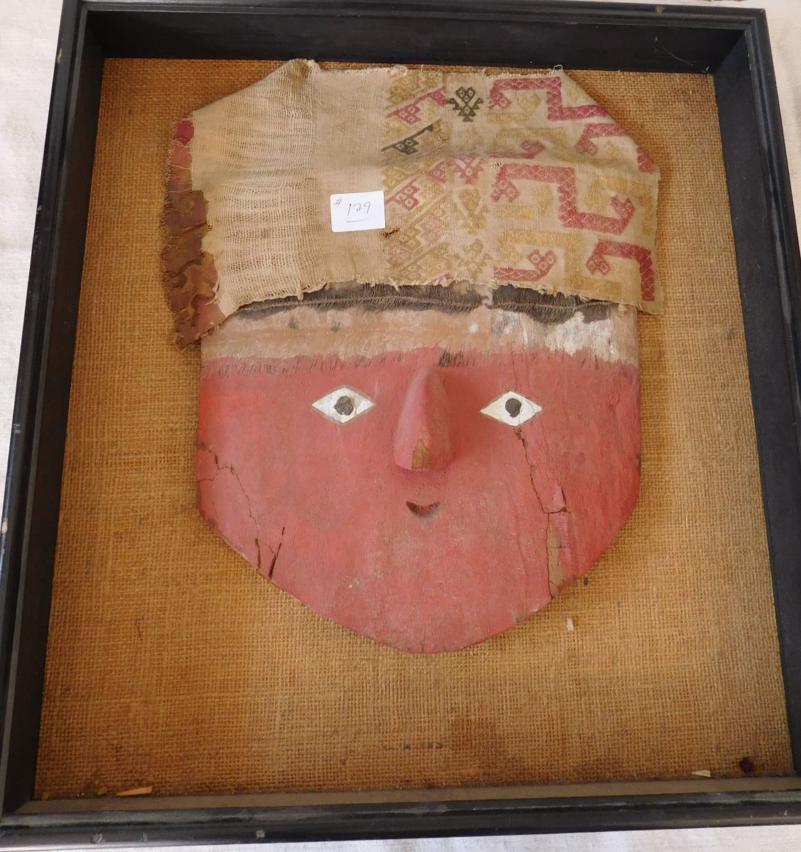 Pre-Columbian Mask, circa 1000 plus years old. Made of wood, paint and textile. Item measures 14" x 11" x 4". From Bolivia. Frame is 18" x 8" x 3" and is included. Condition: Normal wear, see images. Shipping: $65.00 w/insurance, USA estimate only.