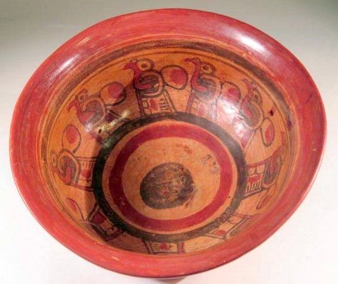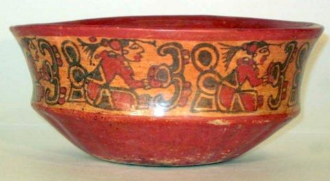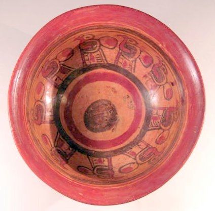 Maya Copador bowl, Ca. 600 - 900 A.D. Classic period. Outside has sitting chiefs wearing elaborate regalia and holding decorated devices. Inside has a left looking circle of condors in black and red on tan.