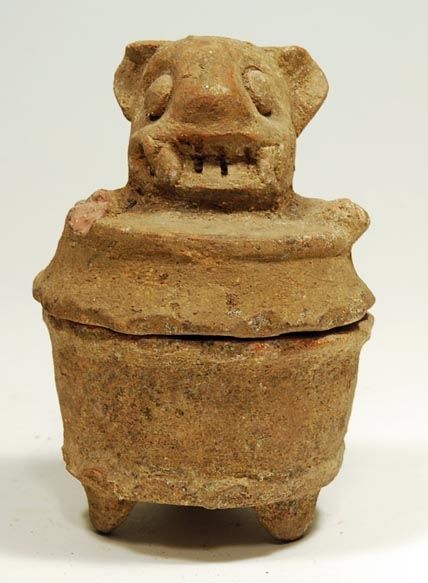Maya Lidded Quiche Vessel, Ca. 600 - 90 A.D. A two part pottery vase having a jaguar headed lid and tripod base. Some loss to his right paw and edge surrounding his paw, otherwise intact. Private Connecticut collection, acquired 1965-68. 4-1/2” tall.