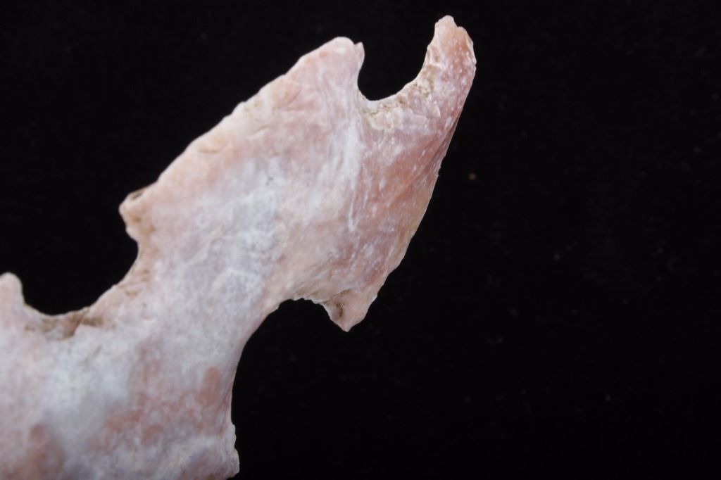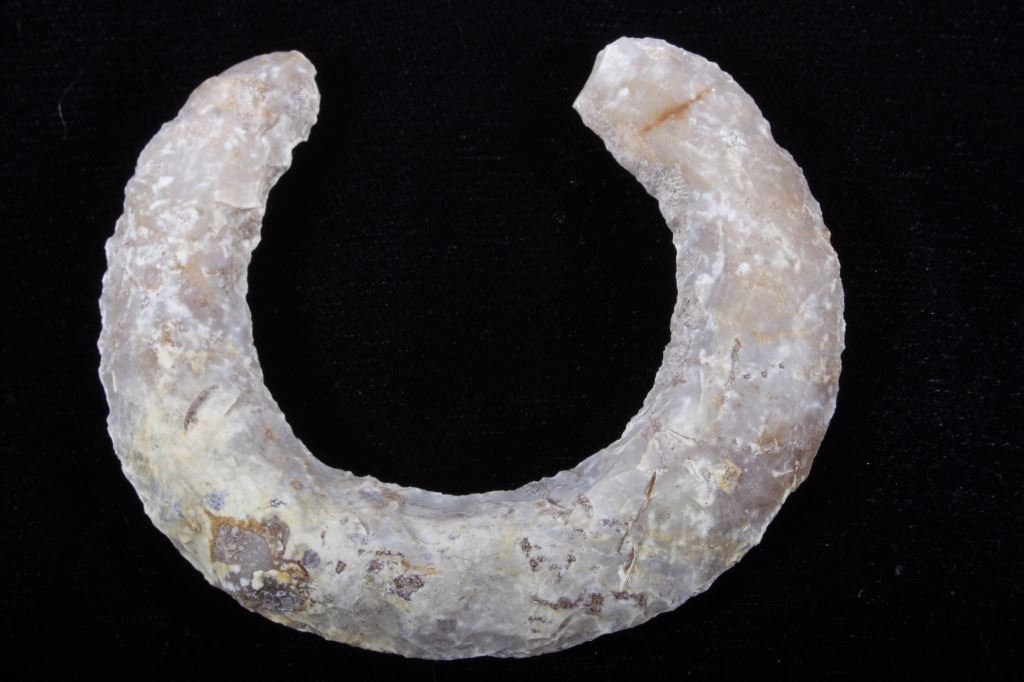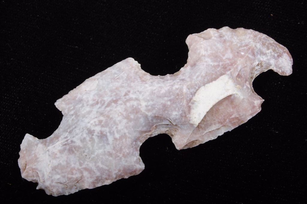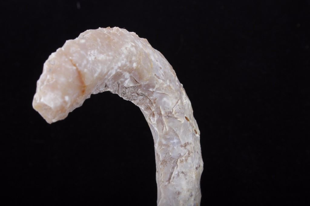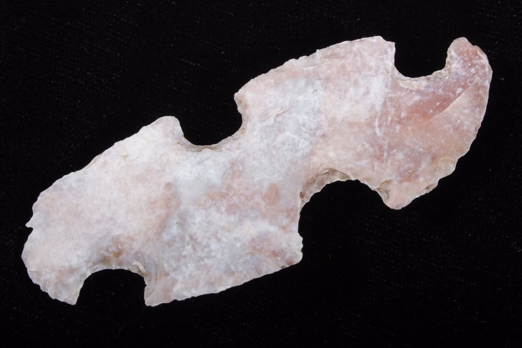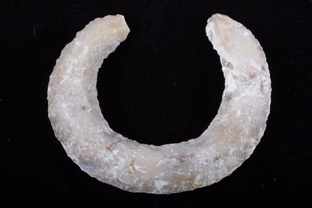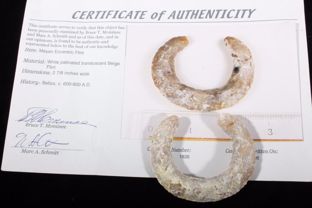 This is an exceptional Pre-Columbian Mayan Eccentric Flint crescent shaped artifact from circa 600-900 A.D. and wonderful Eccentric Flint artifact. The piece comes with a COA (Certificate of Authenticity) from Marc A. Schmitt and Bruce T. Mominee. The piece shows a White Patinated Translucent Beige Flint material and is from Mayan Belize circa 600 A.D. to 900 A.D. The historic artifact shows a crescent "U" or "C" shape with eccentric hafted ridges or lugs around the perimeter. The piece shows extremely fine flint knapping work and is a very rare artifact. This is truly a one of a kind museum quality piece. The piece shows good overall condition and is displayed in a 6.25”x8.25” and 7/8" thick black glass top display. The lot also comes with a 3.25”L x 1.25”W Eccentric knife with four hafted areas. The artifact is 2 7/8”L x 2.5”W in size. Some thought this Crescent shape was a crab effigy, Mayan cave entrance to the underworld, and others an offering to the Mayan gods.