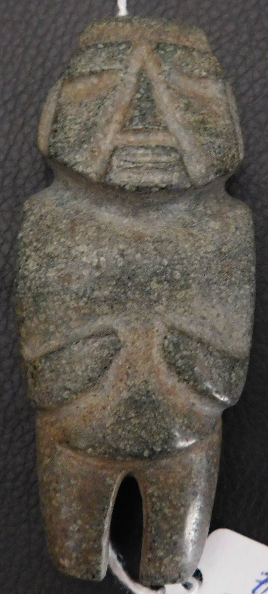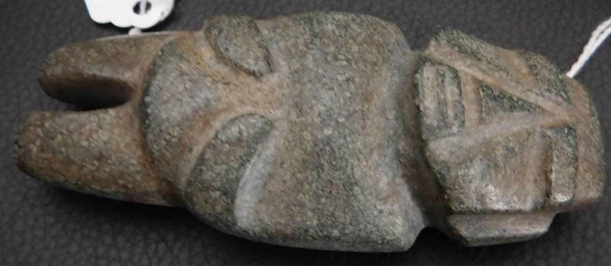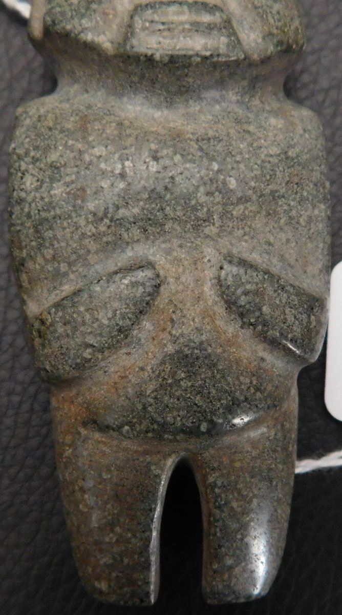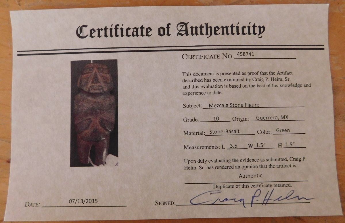 Pre-Columbian Mezcala Figure w/Helm COA, circa 2500 years old. Made of basalt and measuring 3.5" x 1.5" x 1.5". Guerrero, MX. Museum quality piece with investment value, w/Helm Certificate of Authenticity. From an old, 1960s California collection. Condition: Very good, nice polish, see images. Shipping: $22.50 w/insurance and signature, due to value.