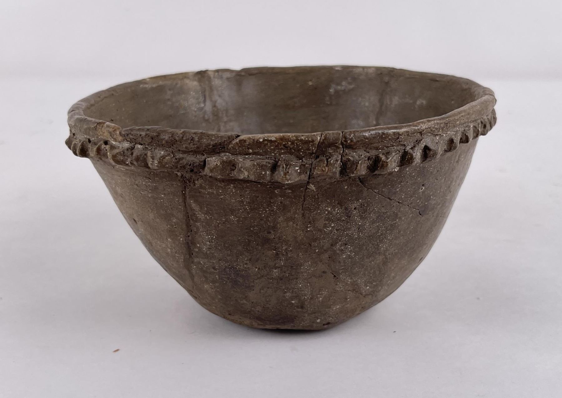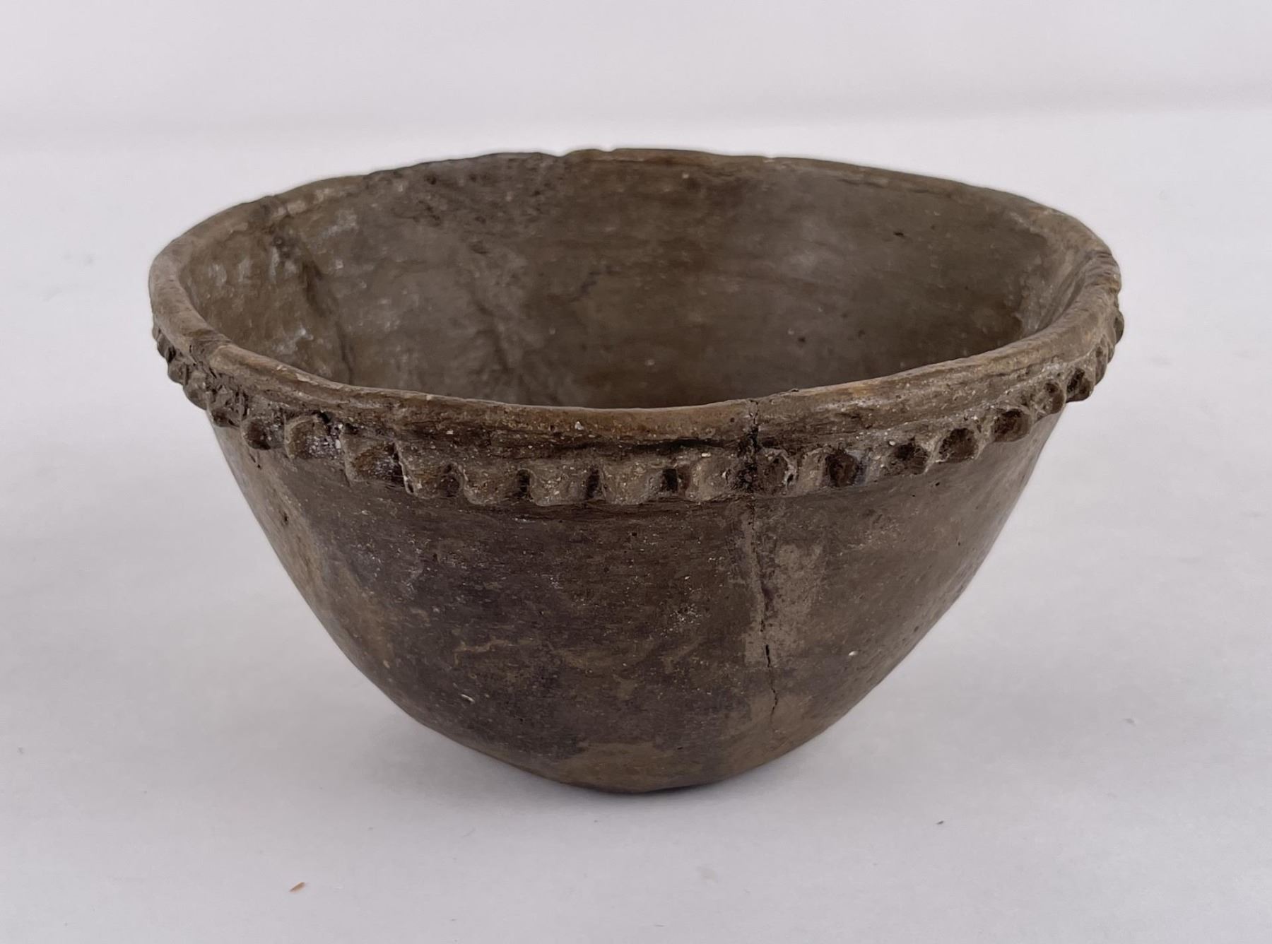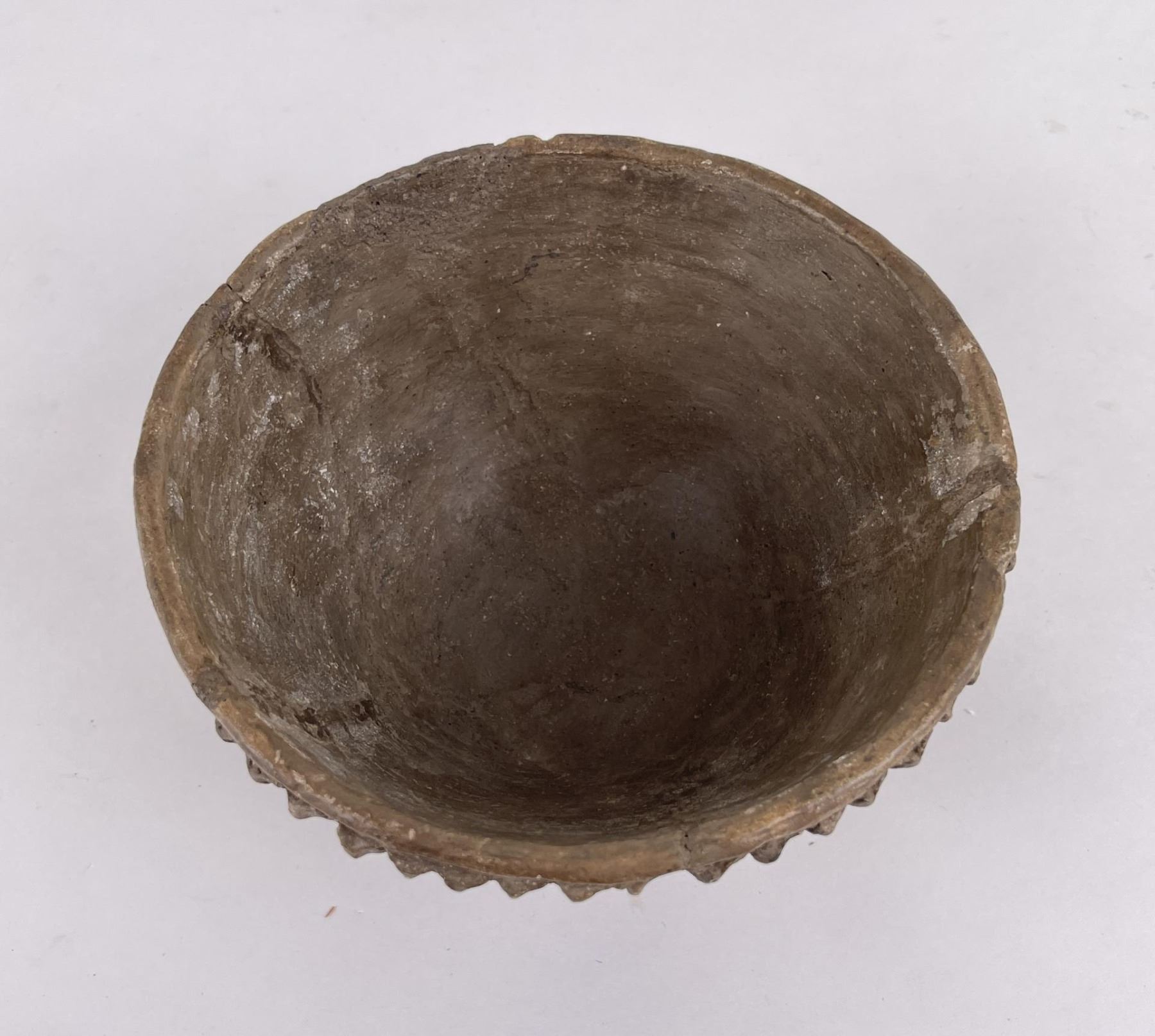 Ancient piece. Appears to have had some repair work as shown. 7" diameter, 4" tall.