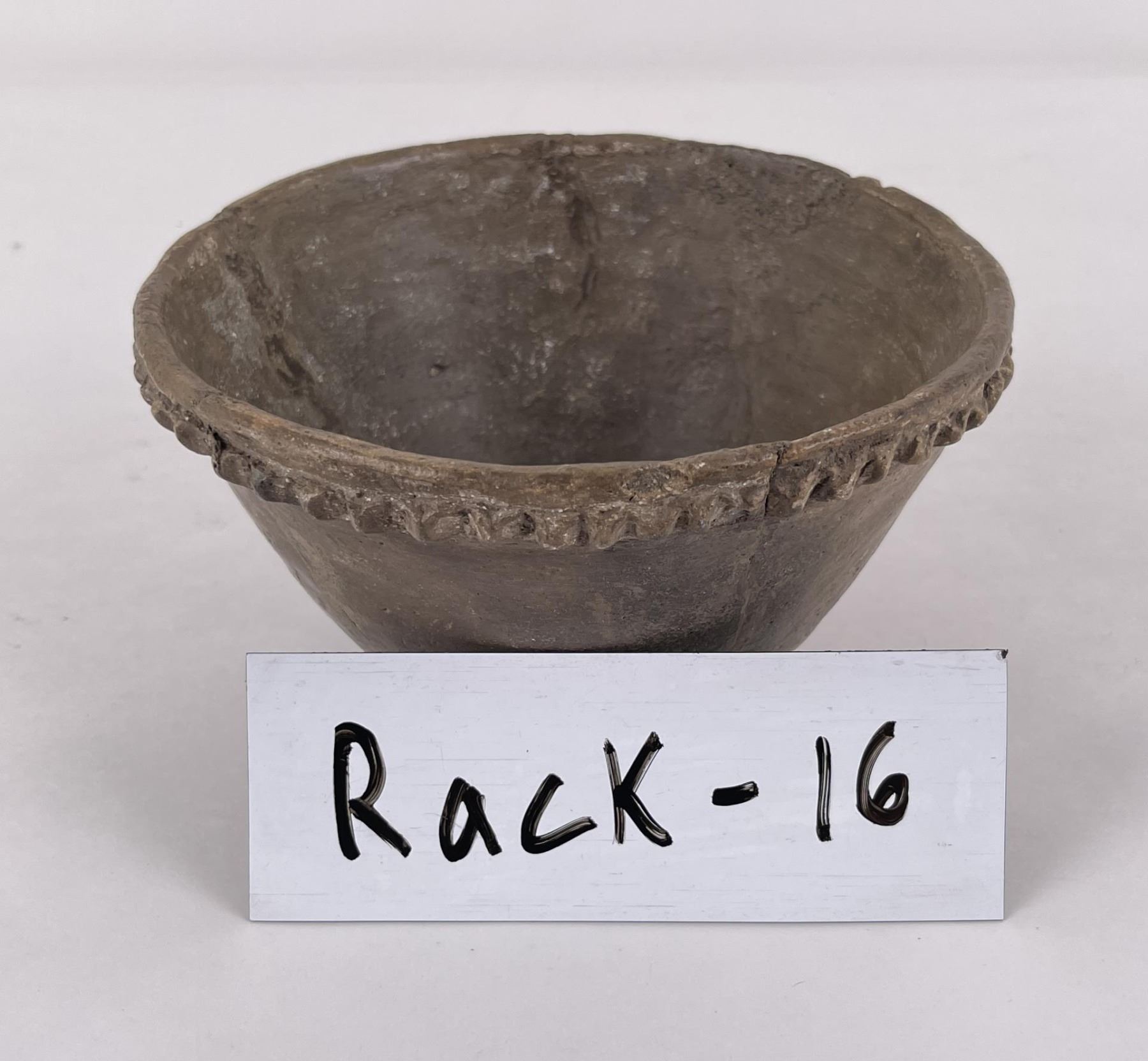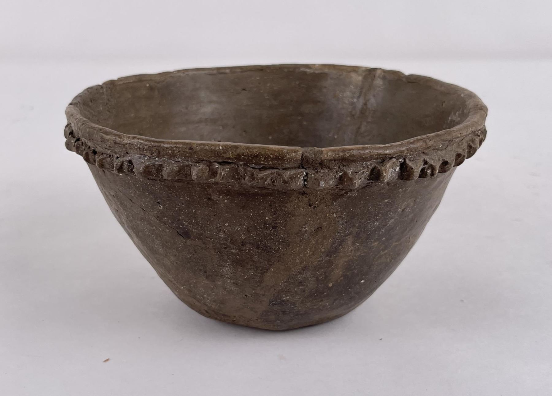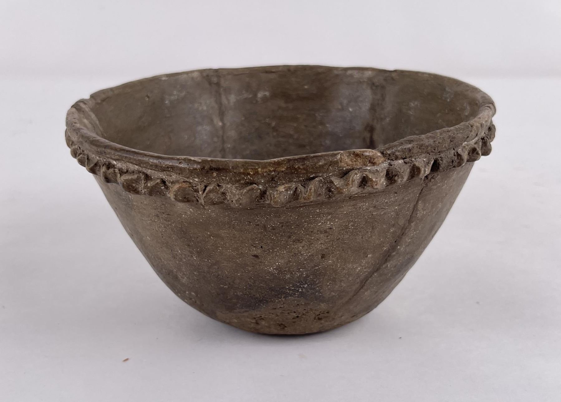 Ancient piece. Appears to have had some repair work as shown. 7" diameter, 4" tall.