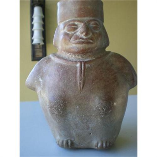 Authentic Pre-Columbian Moche Culture Figural Artifact circa Mddle Horizon Period (200-500 AD)from Northern Coast of Peru. Seated figure with incised almond eyes and bold facial features. Overall in tannish color with no breaks, repairs or chips it has one tiny hole on bottom of vessel from original excavation probe.
