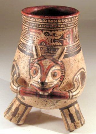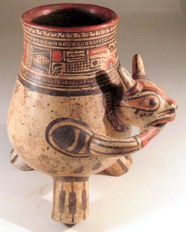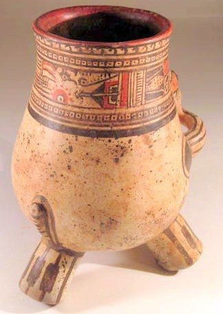 Nicoya Rabbit urn Costa Rica, Ca. 800 - 1400 A.D. 8-1/4" tall. 8 -1/2" front to back. Stands on three legs. Very detailed face with complex geometric patterns on the upper third of the chamber. Rabbit is depicted eating corn.