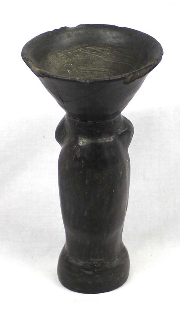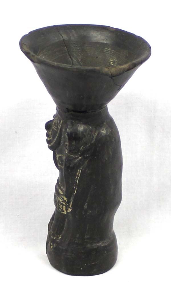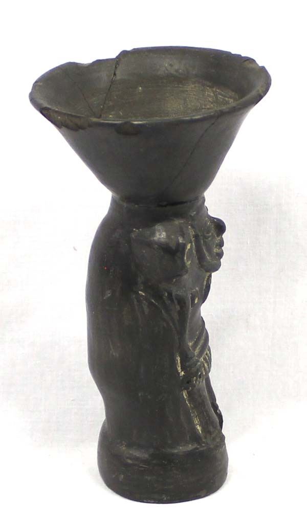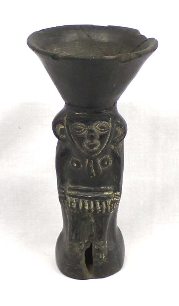 Pre Columbian Pottery Effigy Vase, measures 3.25'' x 6.5'', chipping on the rim, missing piece in leg area