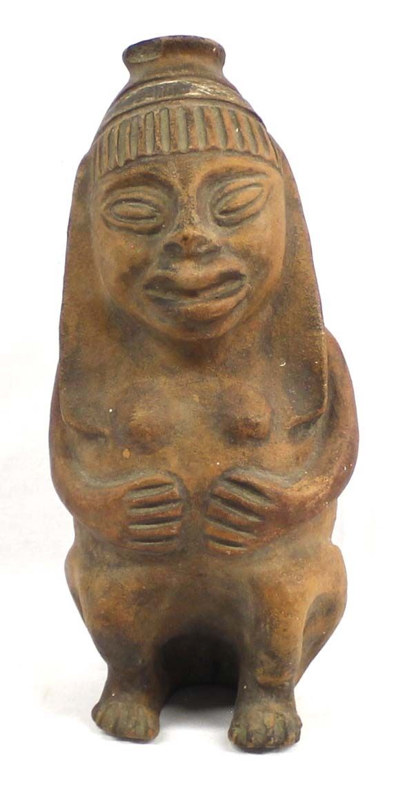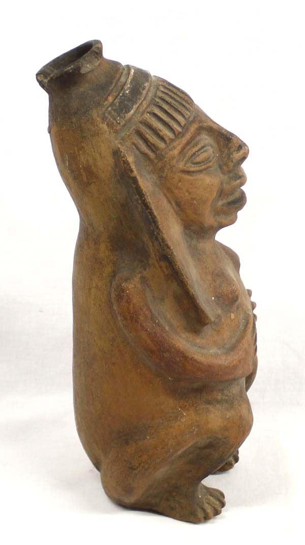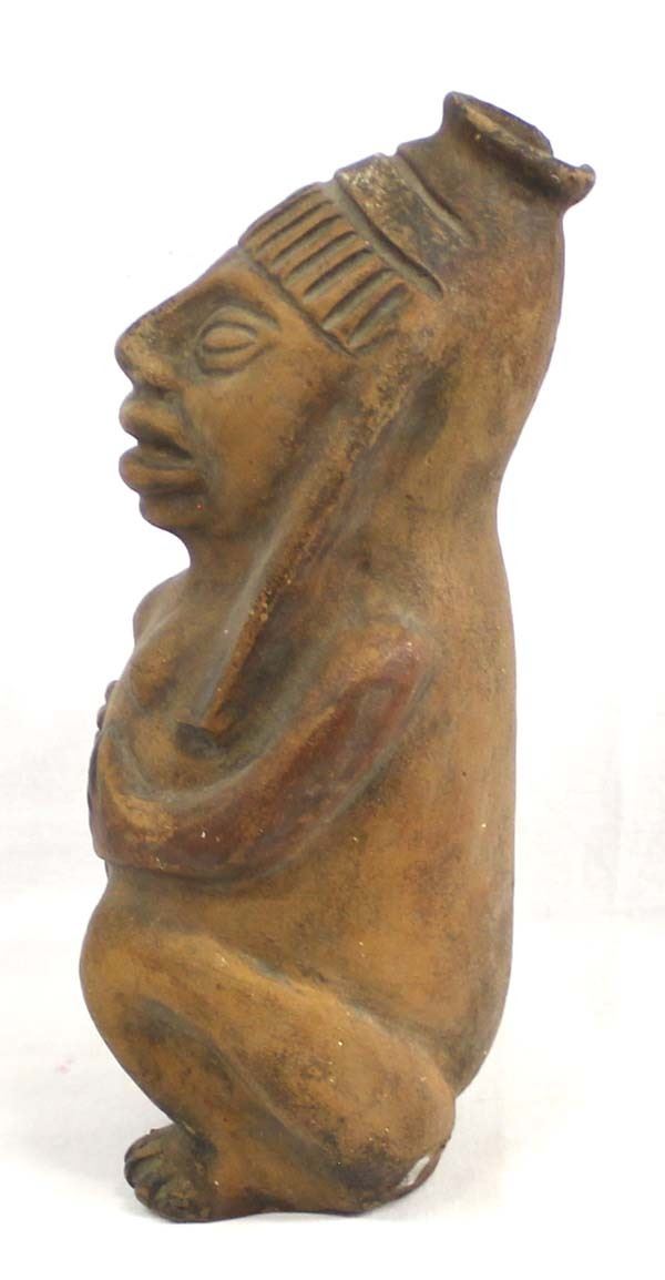 Pre Columbian Pottery Female with Child Replica, measures 11''H, chip in spout