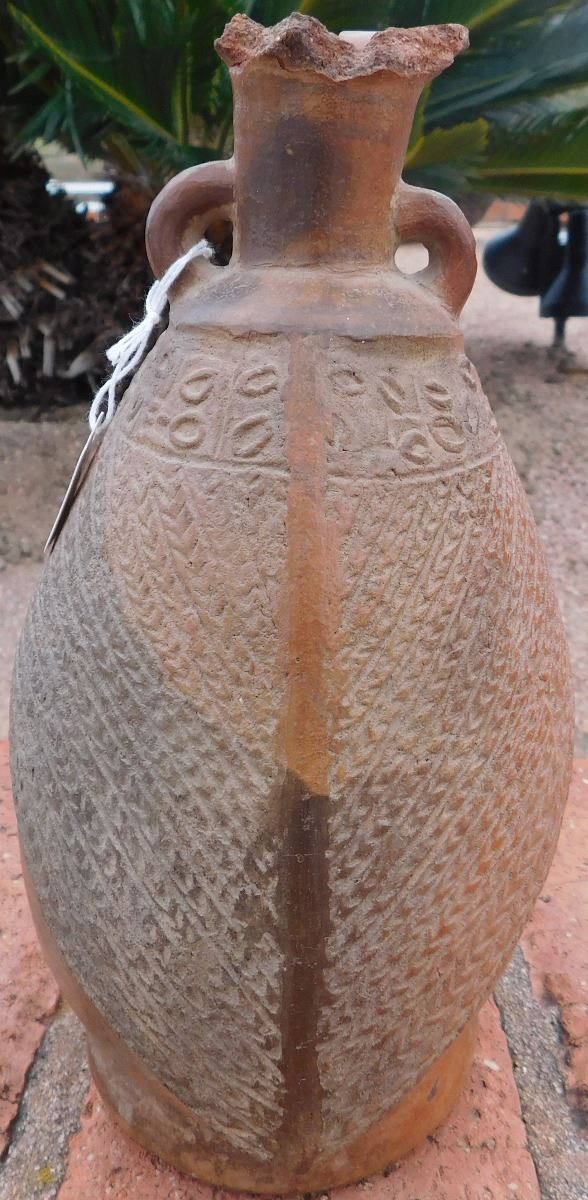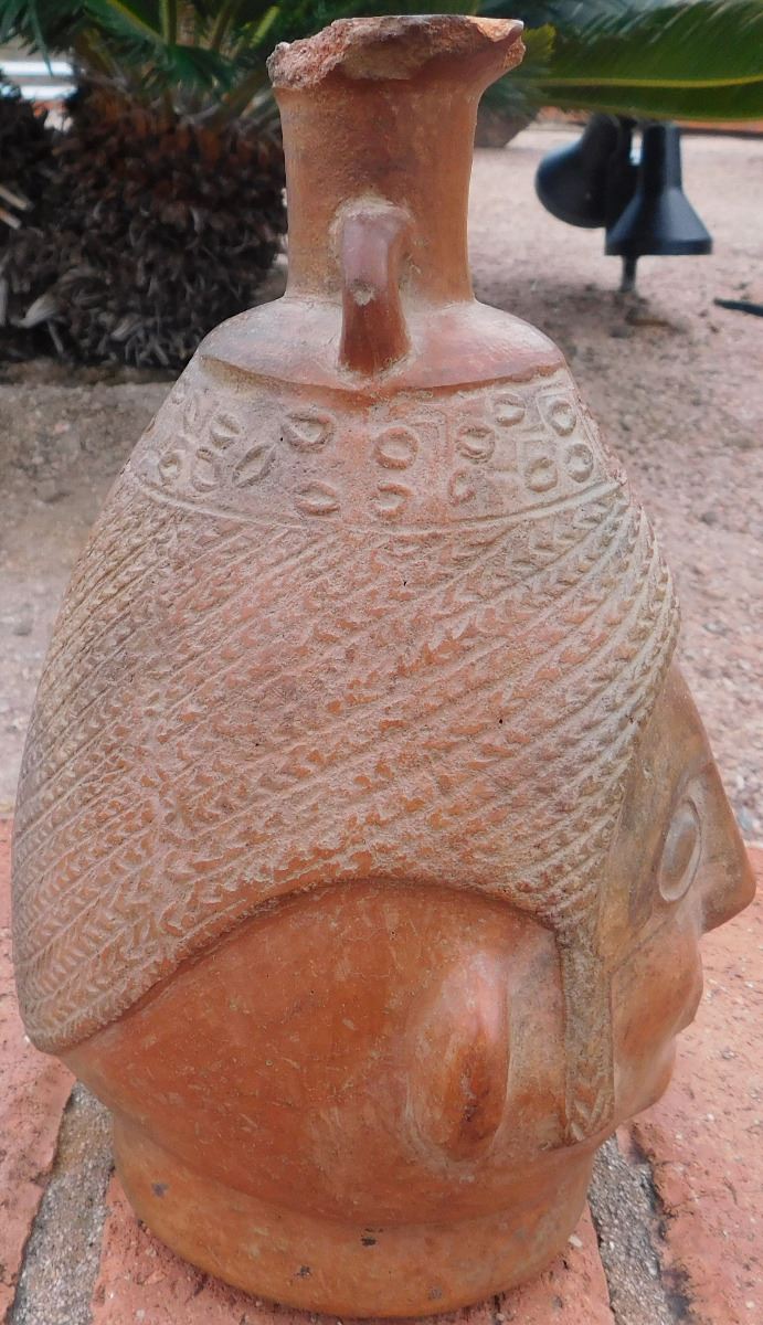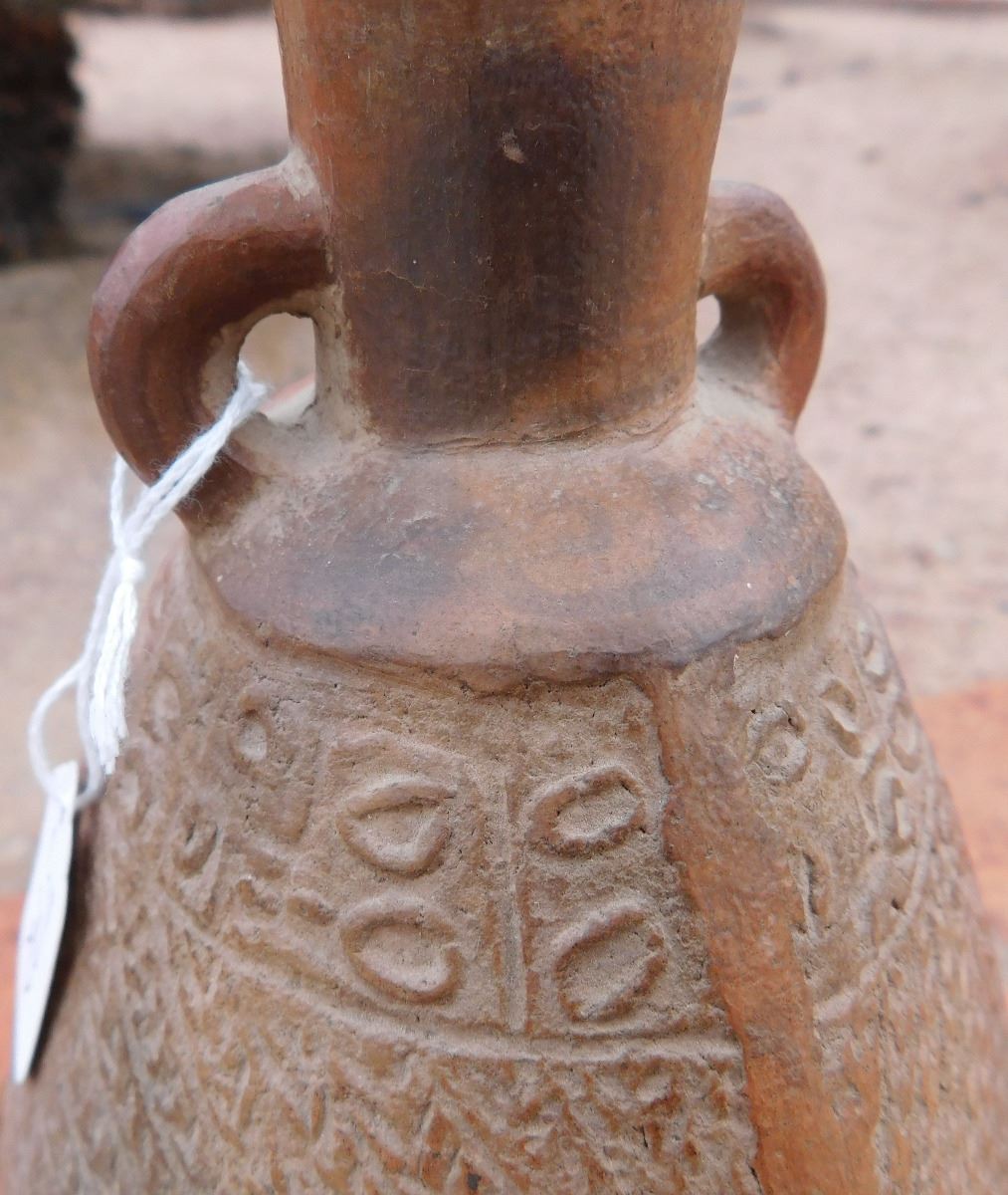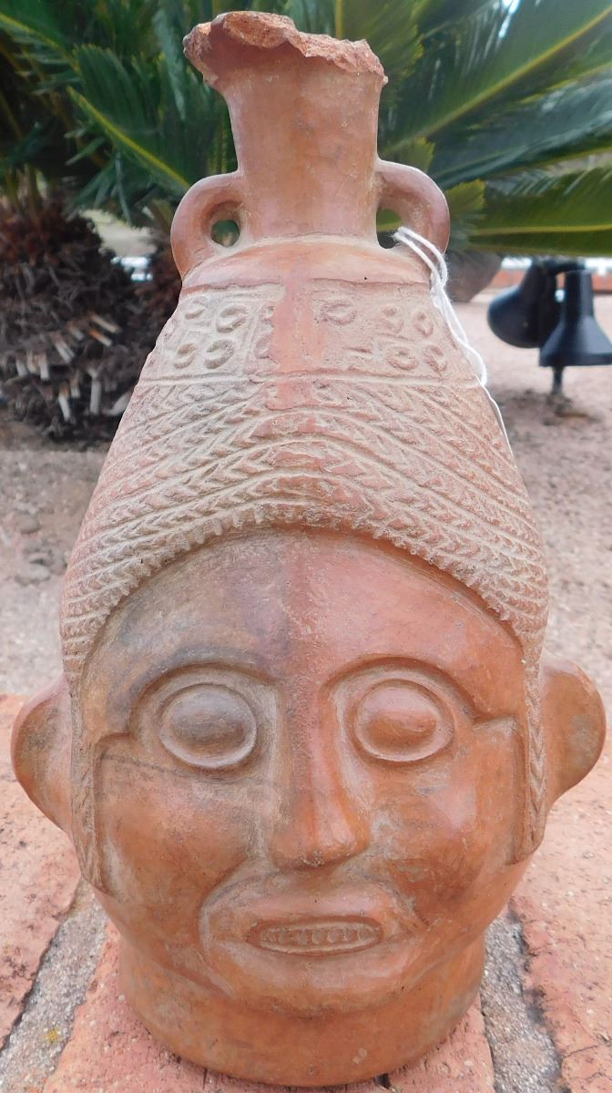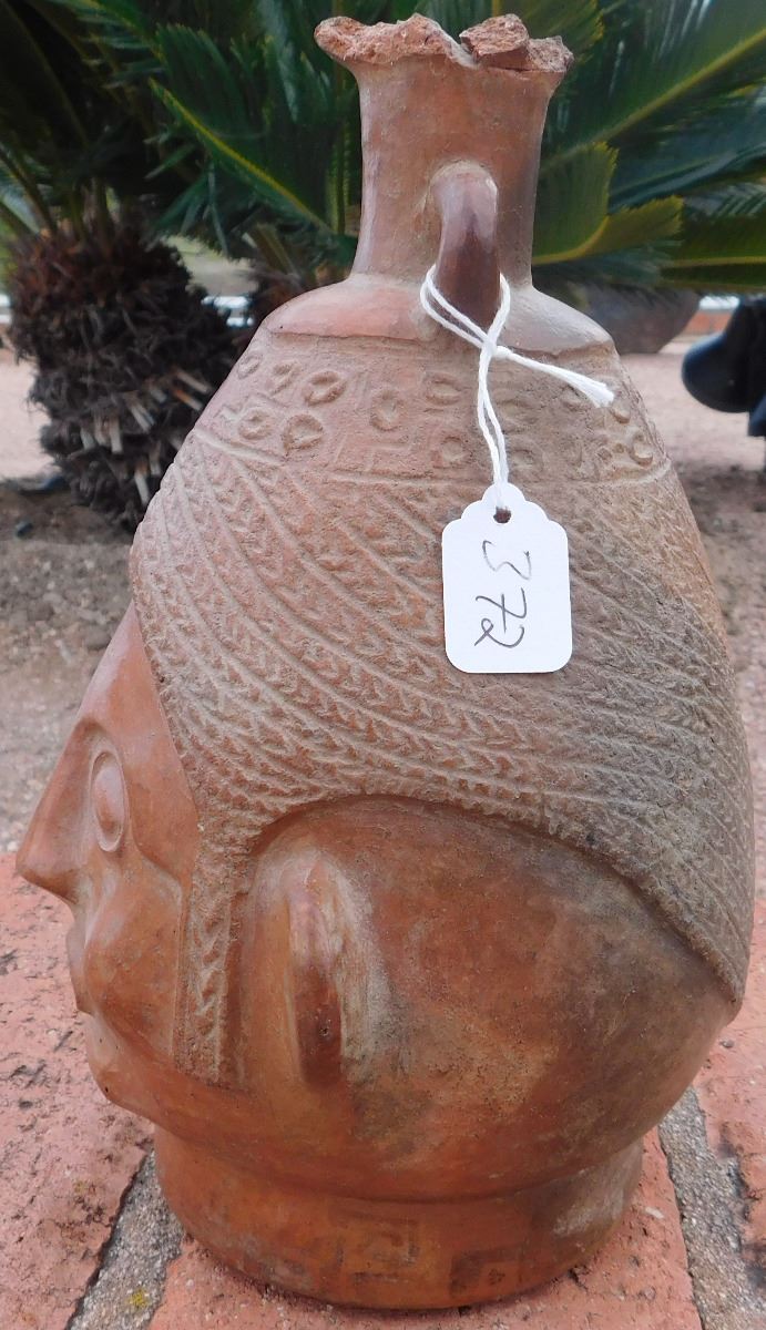 Pre-Columbian Pottery Vessel, circa 1200 years old. Made of clay, the item measures about 5.5" x 6" x 9". From Bolivia. Condition: As found, damage to lip, see images. Shipping: $27.50 double-boxed, w/insurance and signature.