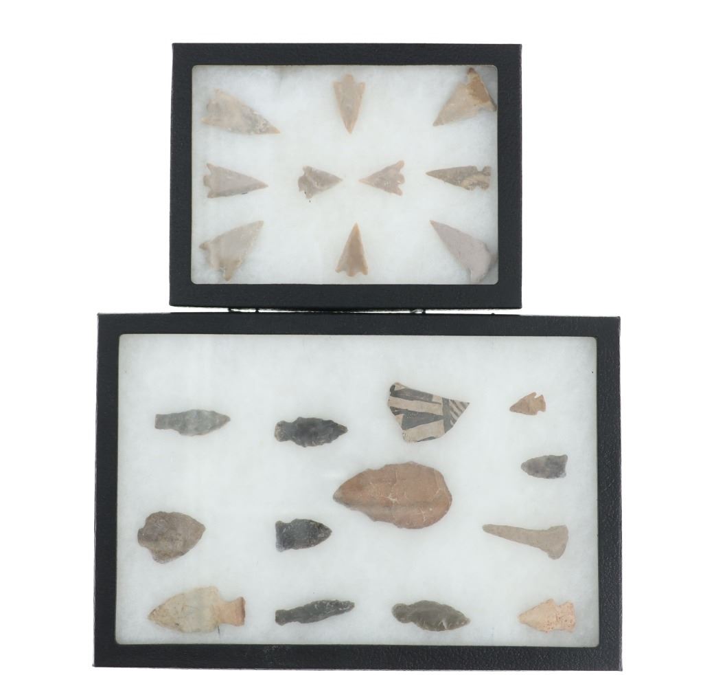Featured in this lot is this Pre Columbian projectile point artifact displays circa 3500 B.C.E. - 476 C.E. There are a total of 20 total projectile points, 1 drill, 1 scraper, and 1 artifact possibly from an early Acoma pottery vessel. The condition of this collection of points and artifacts is well preserved for their age with wear consistent with the age of the points but otherwise is well preserved. The measurements of this collections of points ranges from 2 3/4" x 1 1/2" to 7/8" x 5/8". The collective weight of the collection in display boxes is 1lb 12oz.