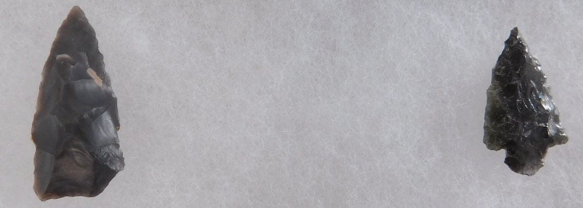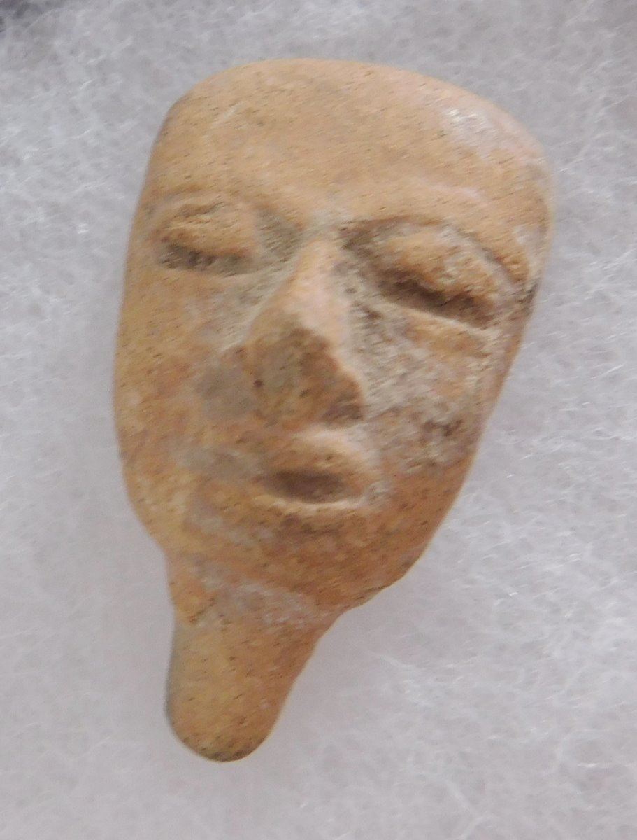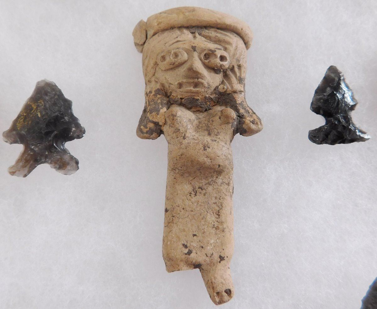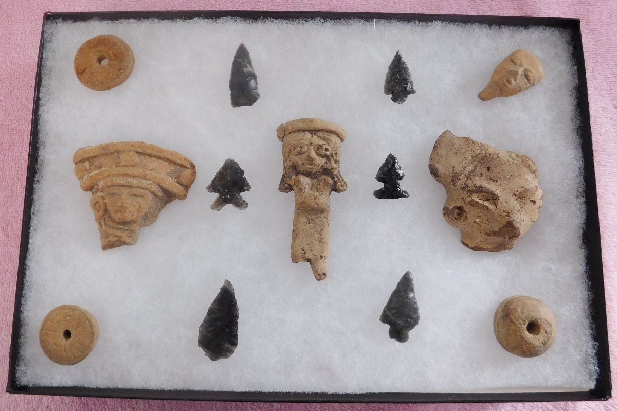 Pre-Columbian Relics Collection, pre-historic items. Made of clay and obsidian, the items measure from 1" to 3.5" long. Mayan. Frame not included. Condition: As found, see images. Shipping: $22.50.