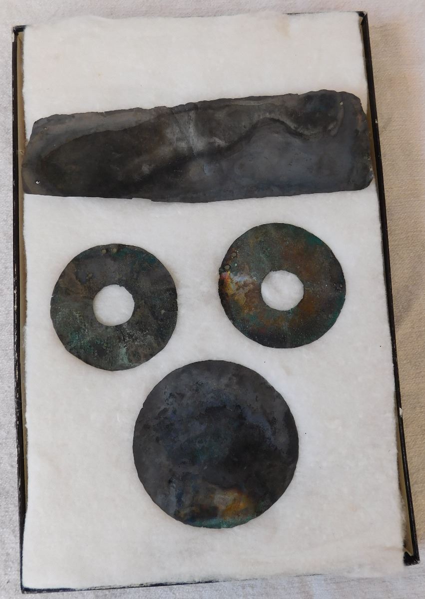 Pre-Columbian Silver, circa 1000 plus years old. Made of silver, items measures 2.5" to 7". From Bolivia. 4 nice, bigger pieces. Frame not included. Condition: As found, heavy patina, see images. Shipping: $30.00